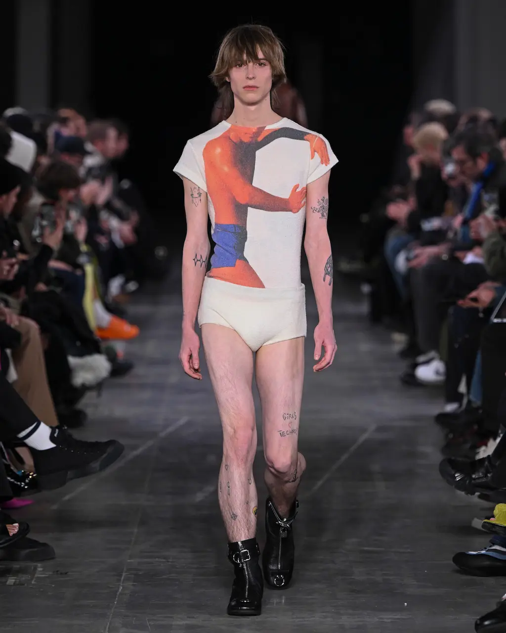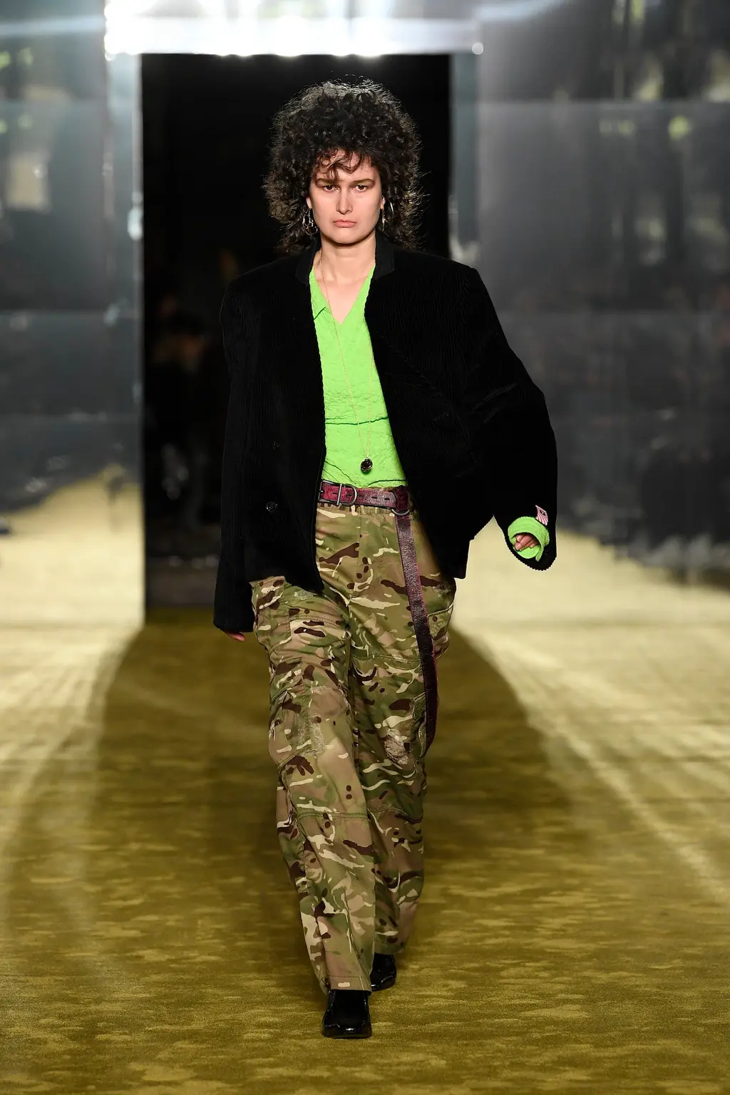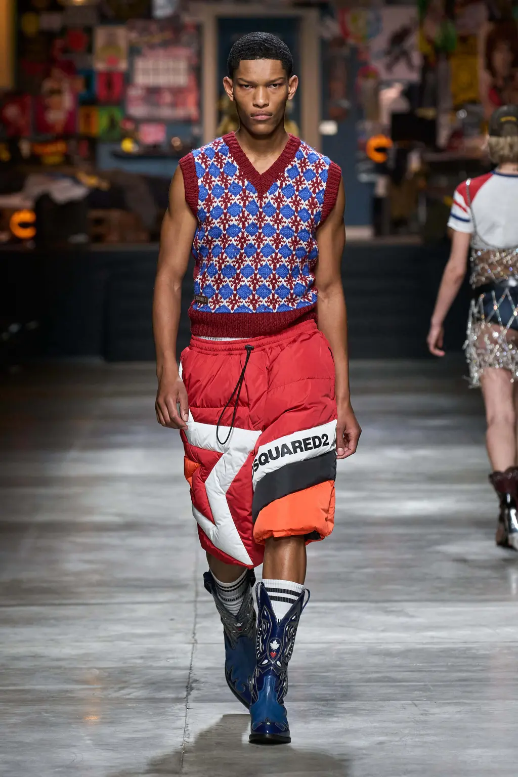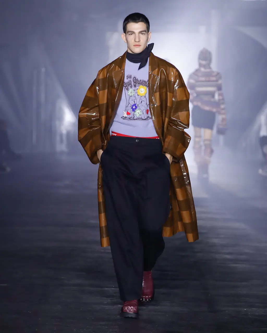 God knows, some big room somewhere. It was quite dark inside until the lights came on and illuminated a teenage bedroom, filled with Pac-Man paraphernalia, at the end of the runway. “Junior?” yelled a voice off-stage as a floppy-haired model pulled on a pair of pink cowboy boots and fringed jacket. “Get out of that bed if you ever want to be somebody!” Then, for some reason, the Grease soundtrack came on and– oh, who cares, it’s so much fun.