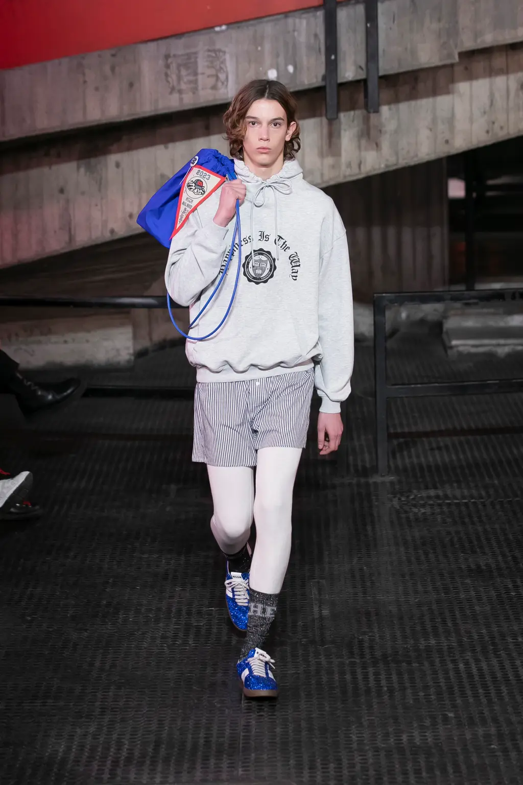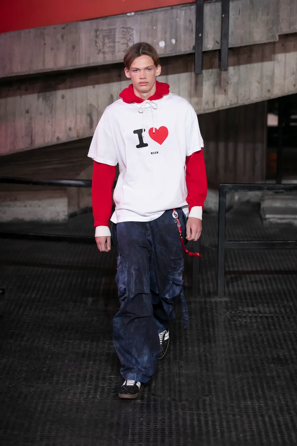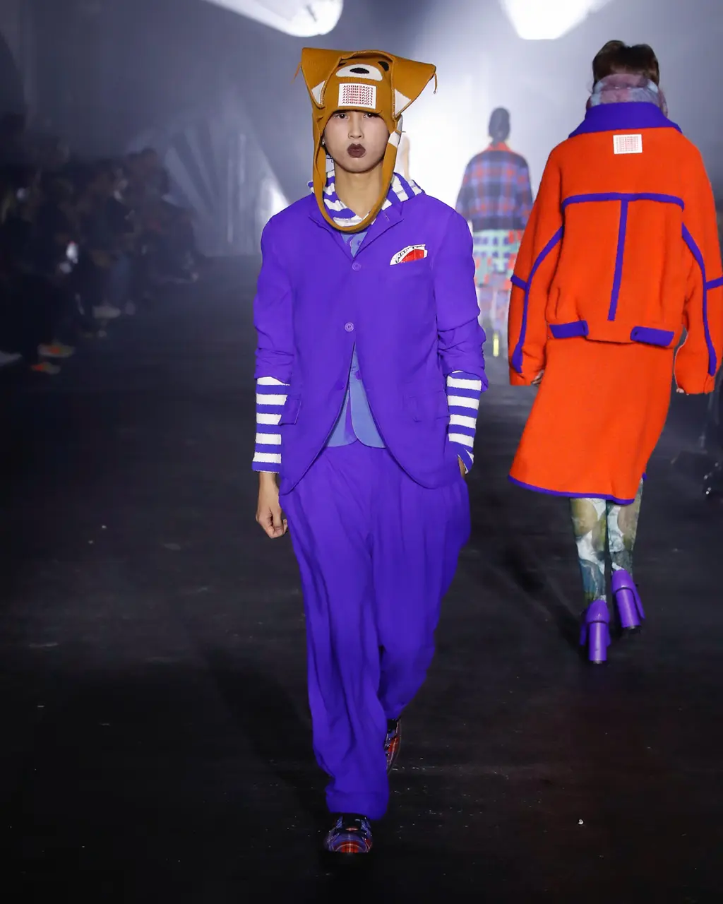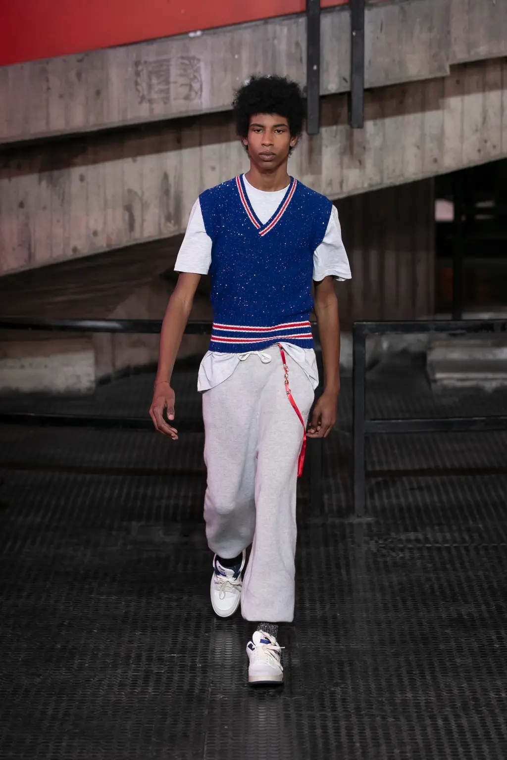 God knows, some big room somewhere. It was quite dark inside until the lights came on and illuminated a teenage bedroom, filled with Pac-Man paraphernalia, at the end of the runway. “Junior?” yelled a voice off-stage as a floppy-haired model pulled on a pair of pink cowboy boots and fringed jacket. “Get out of that bed if you ever want to be somebody!” Then, for some reason, the Grease soundtrack came on and– oh, who cares, it’s so much fun.