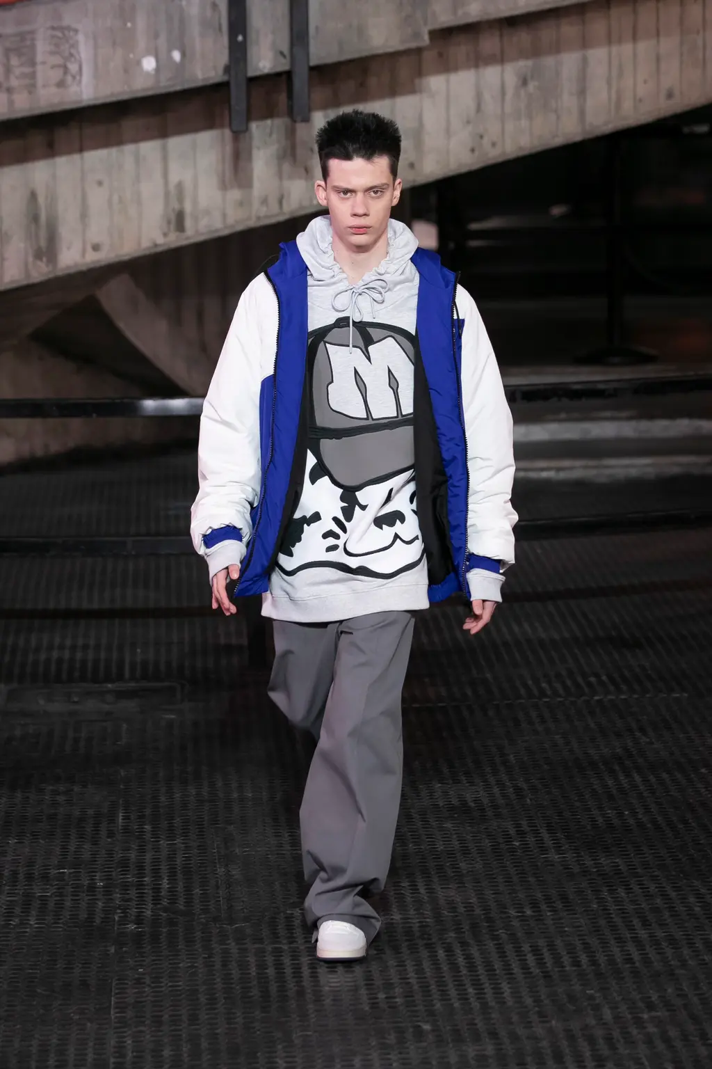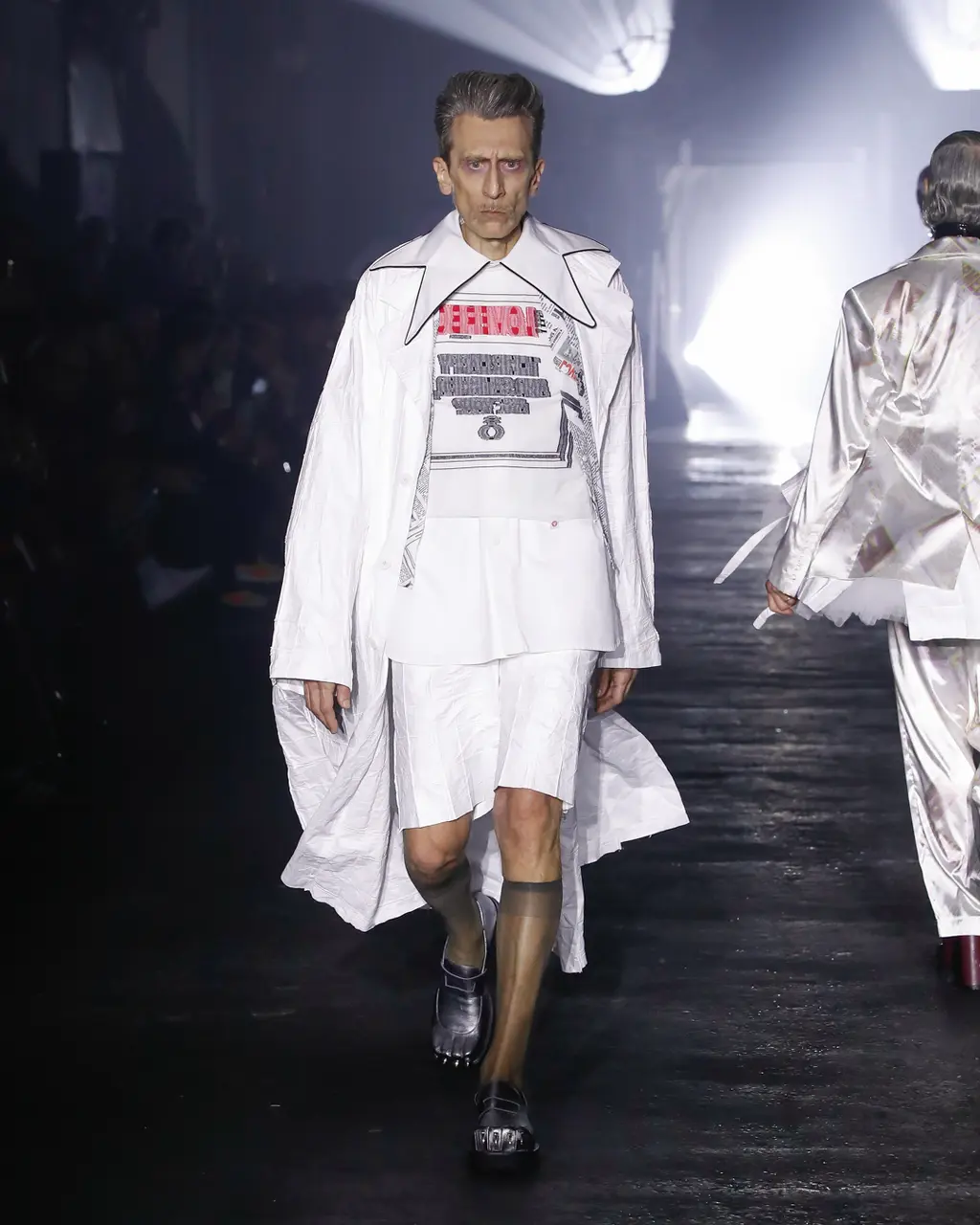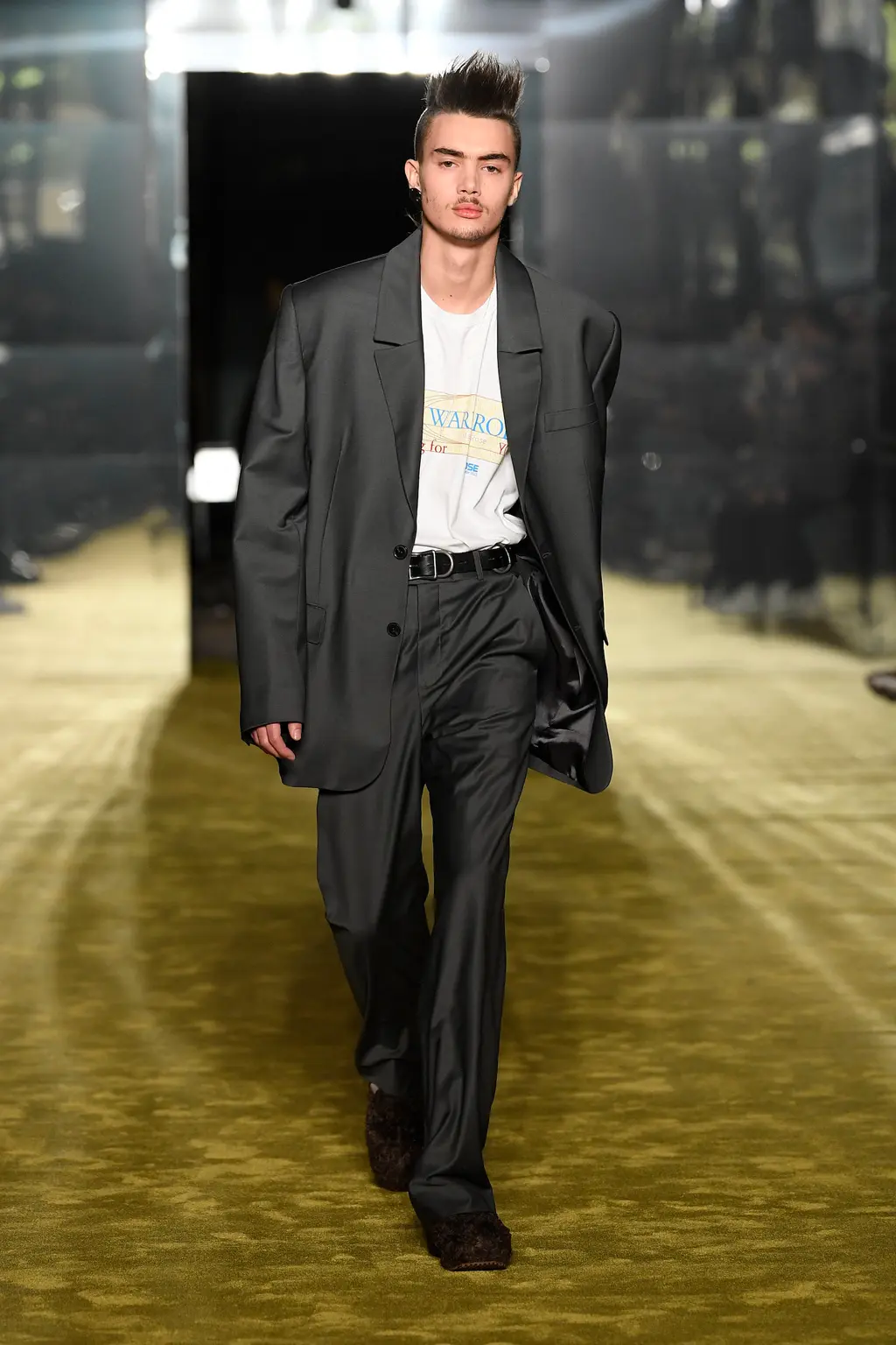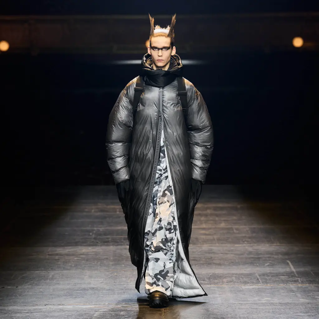 In keeping with the coming-of-age theme, the collection was peppered with childlike prints, TV screen and Internet explorer-inspired graphics, outfits and accessories made from letters, and outerwear spray-painted with statements like “fantastic imagination” and “blurry vision of a bright future”. Elsewhere, we saw grey tailoring of enormous proportions, rhinestone monogram-embellished denim, patchwork camo co-ords and a space man-esque silver leather jacket.