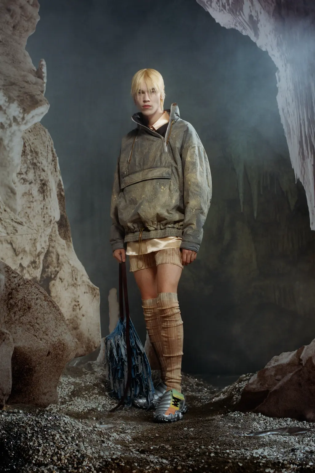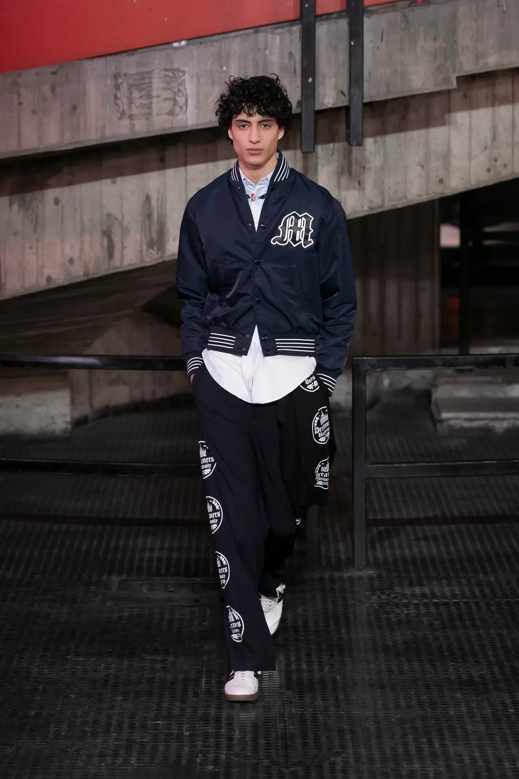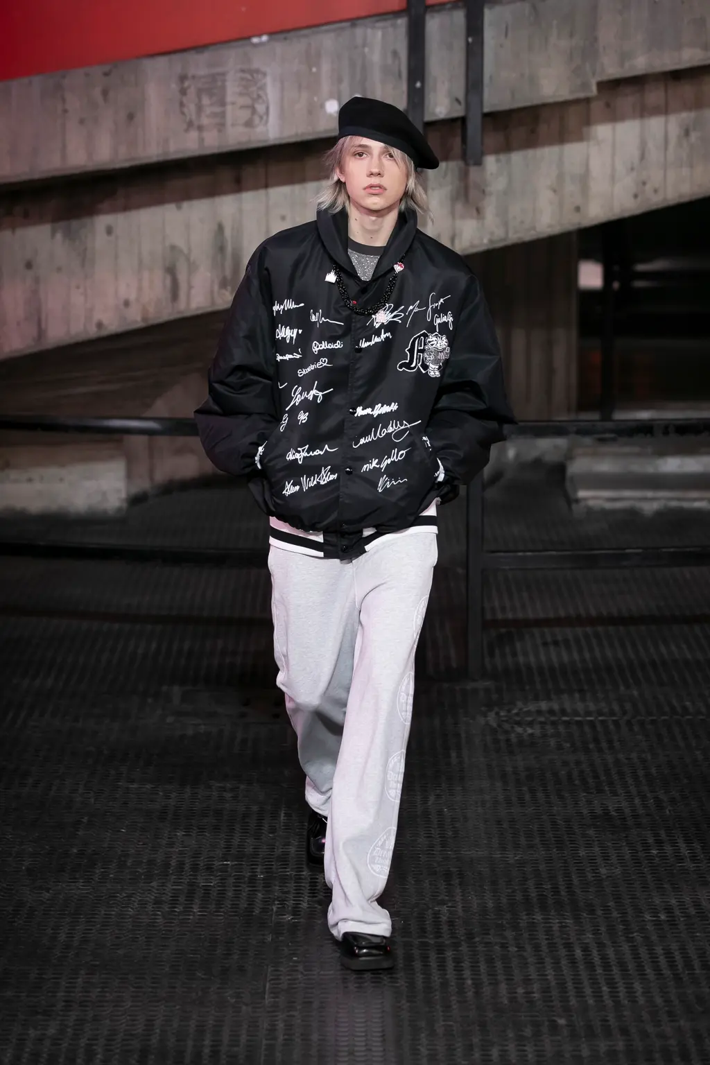 In keeping with the coming-of-age theme, the collection was peppered with childlike prints, TV screen and Internet explorer-inspired graphics, outfits and accessories made from letters, and outerwear spray-painted with statements like “fantastic imagination” and “blurry vision of a bright future”. Elsewhere, we saw grey tailoring of enormous proportions, rhinestone monogram-embellished denim, patchwork camo co-ords and a space man-esque silver leather jacket.