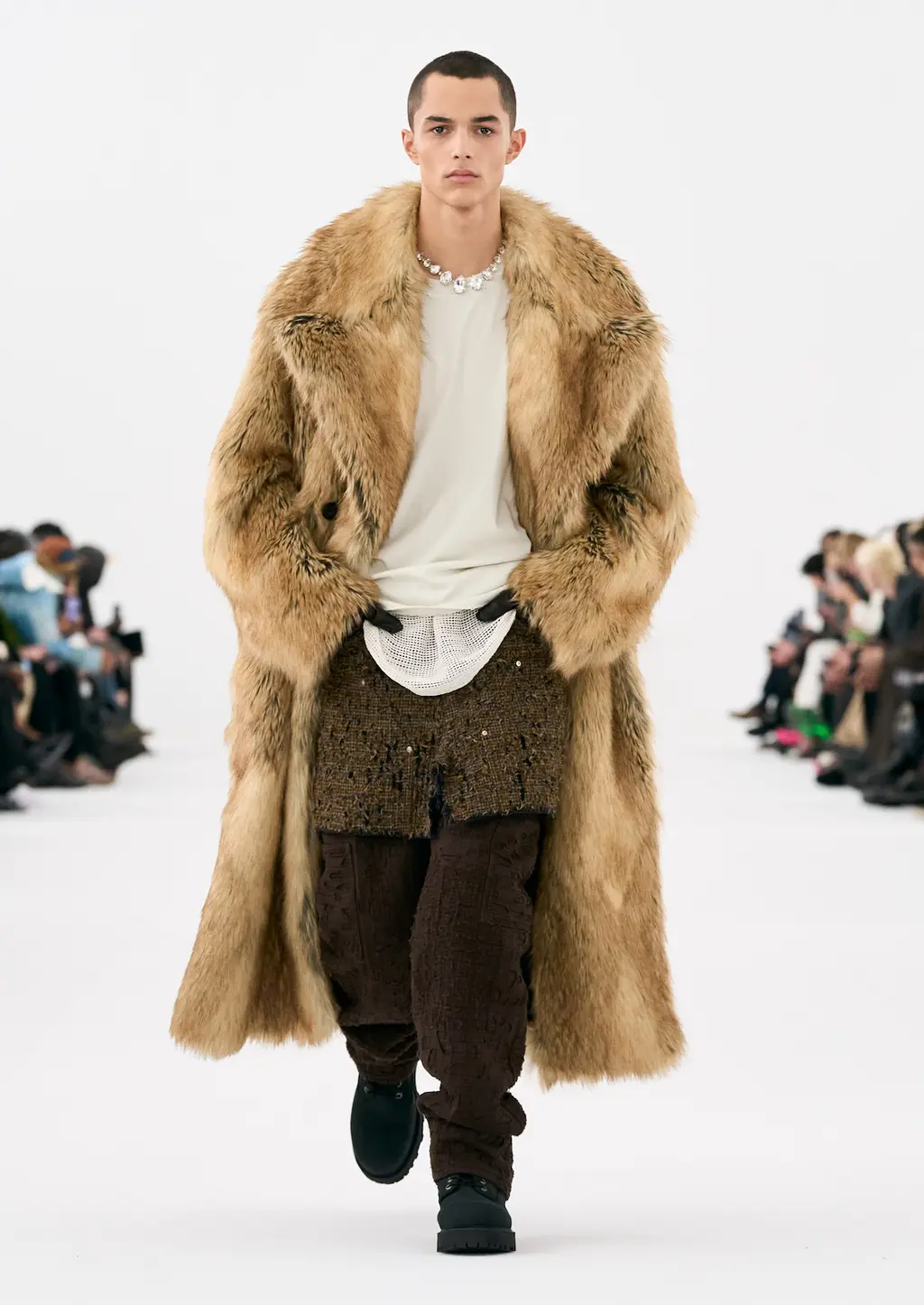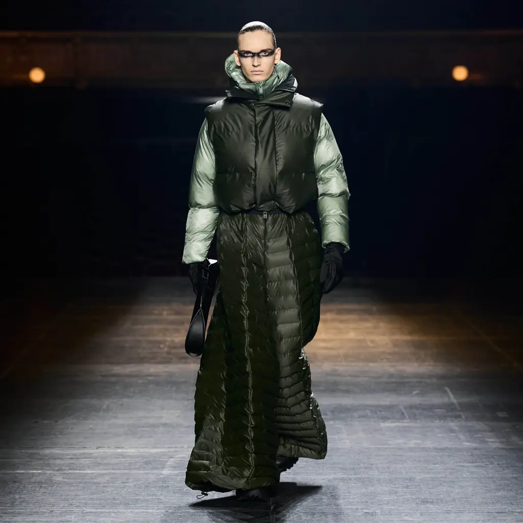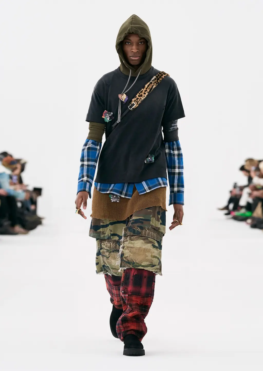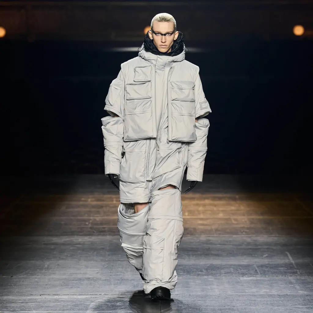 It was all about the styling, the way that people express themselves via the way they wear their clothes. Sure, the usual tropes were present: sharp tailoring, killer outerwear and bold streetwear staples. But it was clear that Williams was thinking about real use cases for the pieces in his collection with a new, pared-back vision for formality, elevated workwear and a grungy take on casuals. This all came together by way of shrunken hoodies, plaids tied around the waist, stone-washed denims, metallic shell suits, spliced-open cargo pants, oversized fur coats and a deconstructed “sweat-skirt”, which is said to have been inspired by a 1960s photograph of Hubert de Givenchy with a jumper tied around his waist like a skirt.