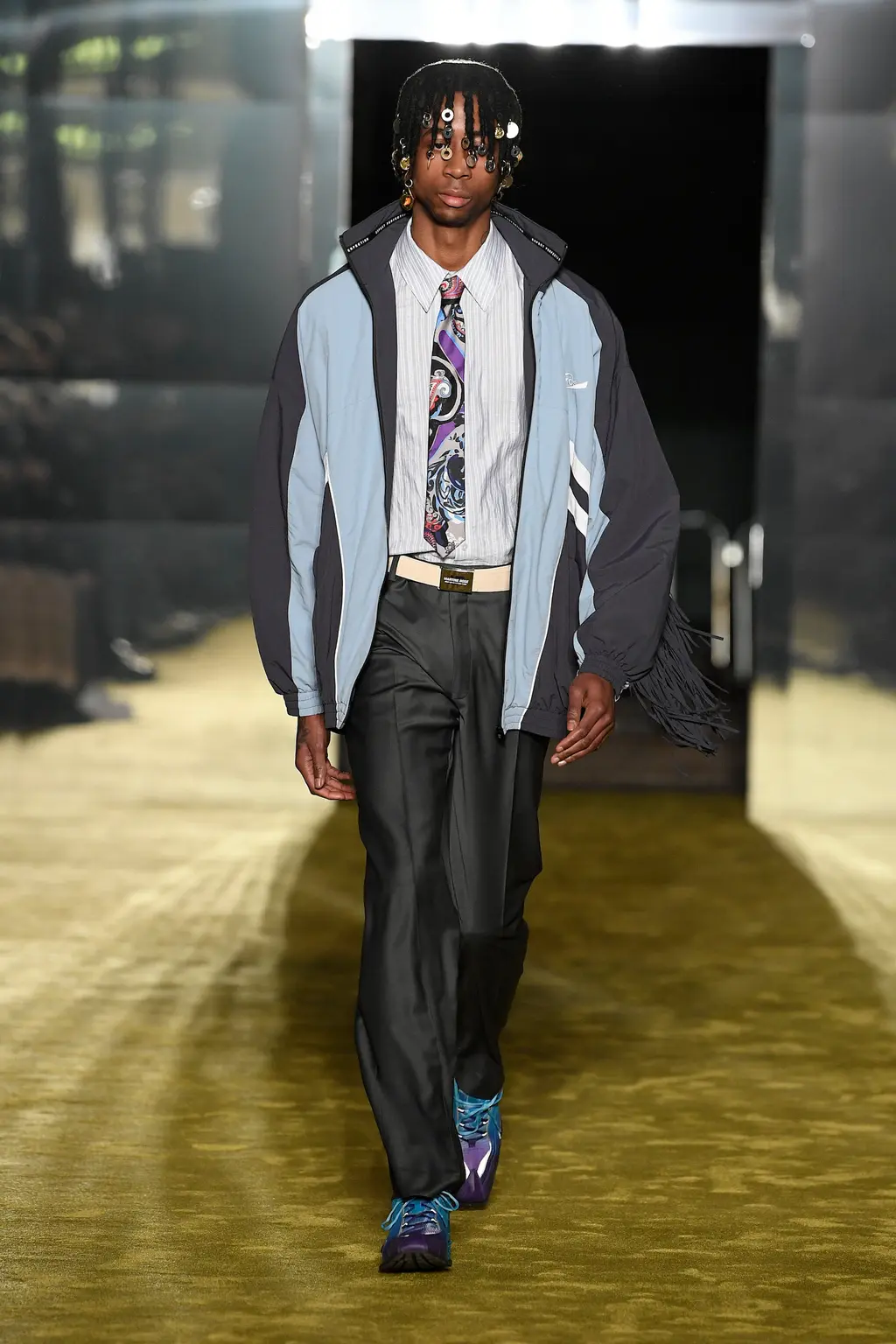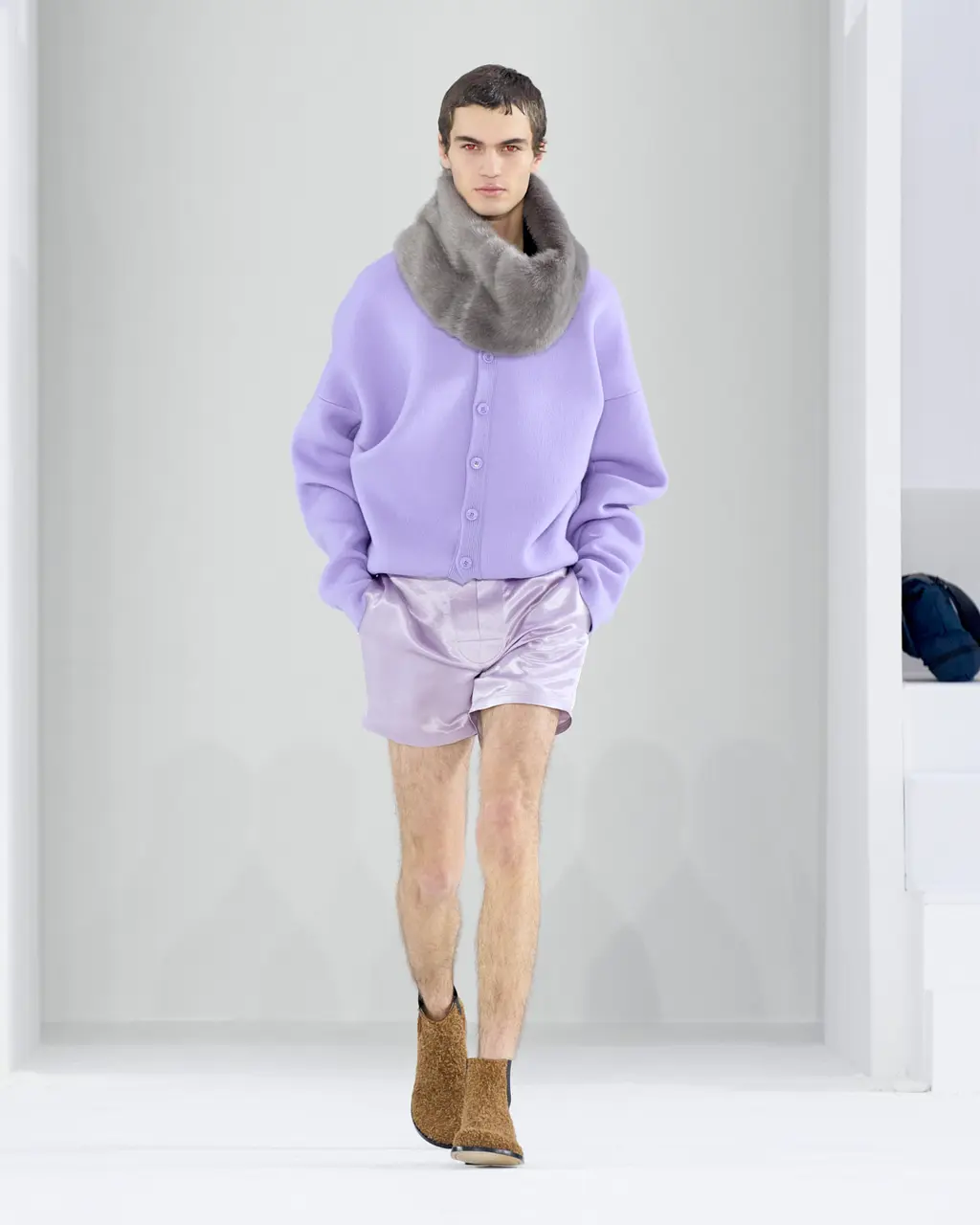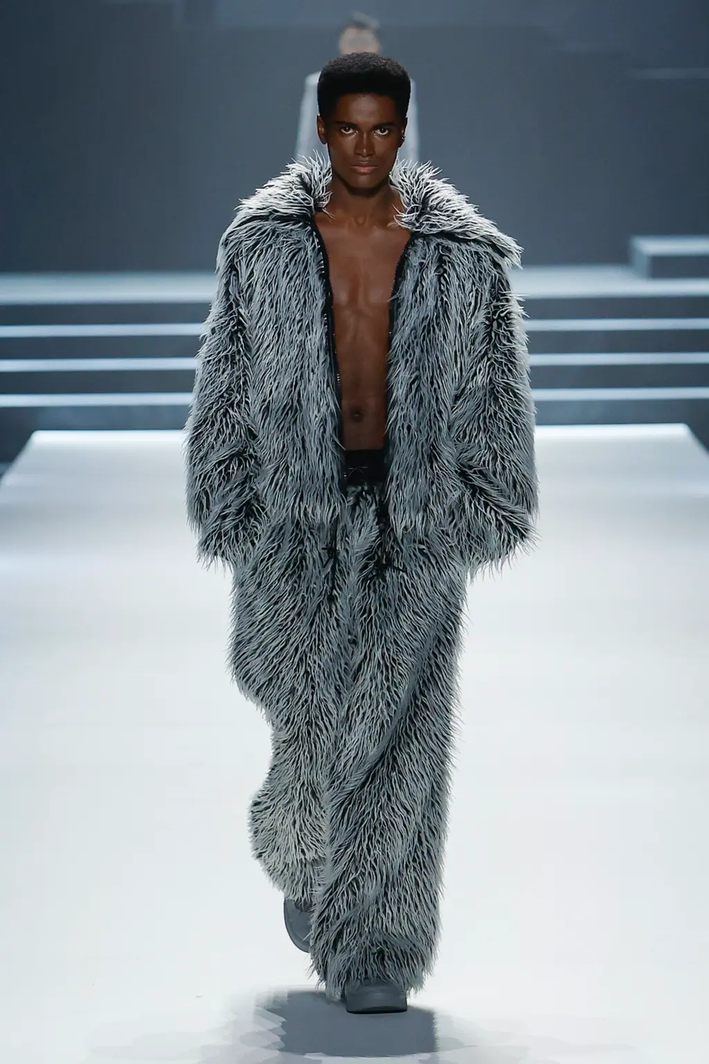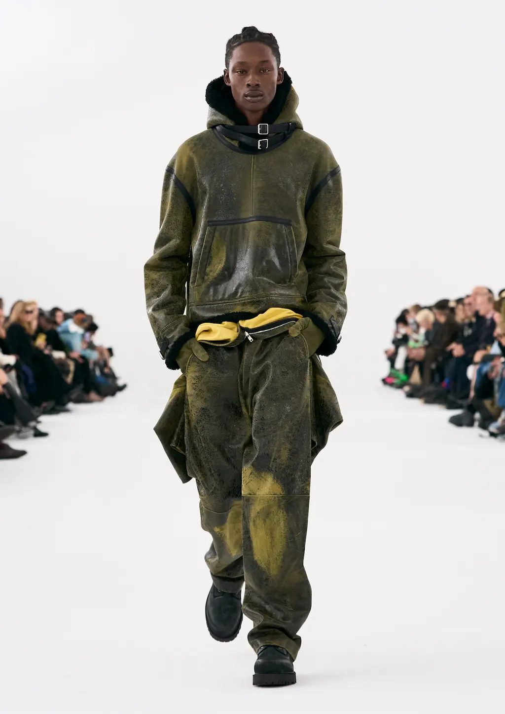 It was all about the styling, the way that people express themselves via the way they wear their clothes. Sure, the usual tropes were present: sharp tailoring, killer outerwear and bold streetwear staples. But it was clear that Williams was thinking about real use cases for the pieces in his collection with a new, pared-back vision for formality, elevated workwear and a grungy take on casuals. This all came together by way of shrunken hoodies, plaids tied around the waist, stone-washed denims, metallic shell suits, spliced-open cargo pants, oversized fur coats and a deconstructed “sweat-skirt”, which is said to have been inspired by a 1960s photograph of Hubert de Givenchy with a jumper tied around his waist like a skirt.