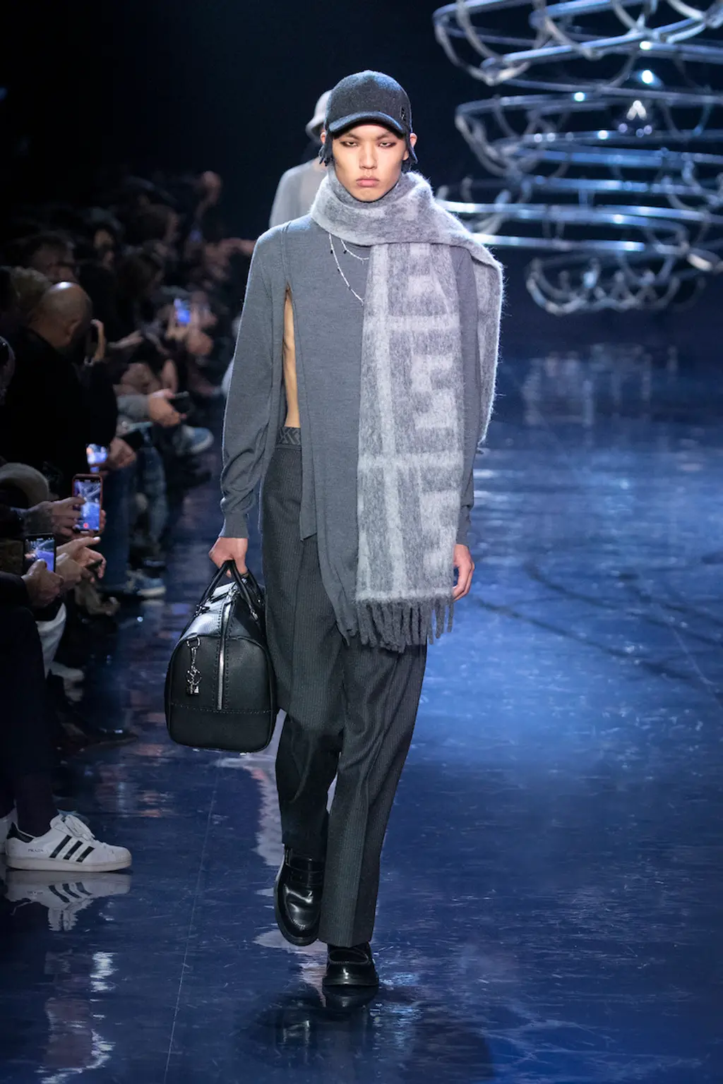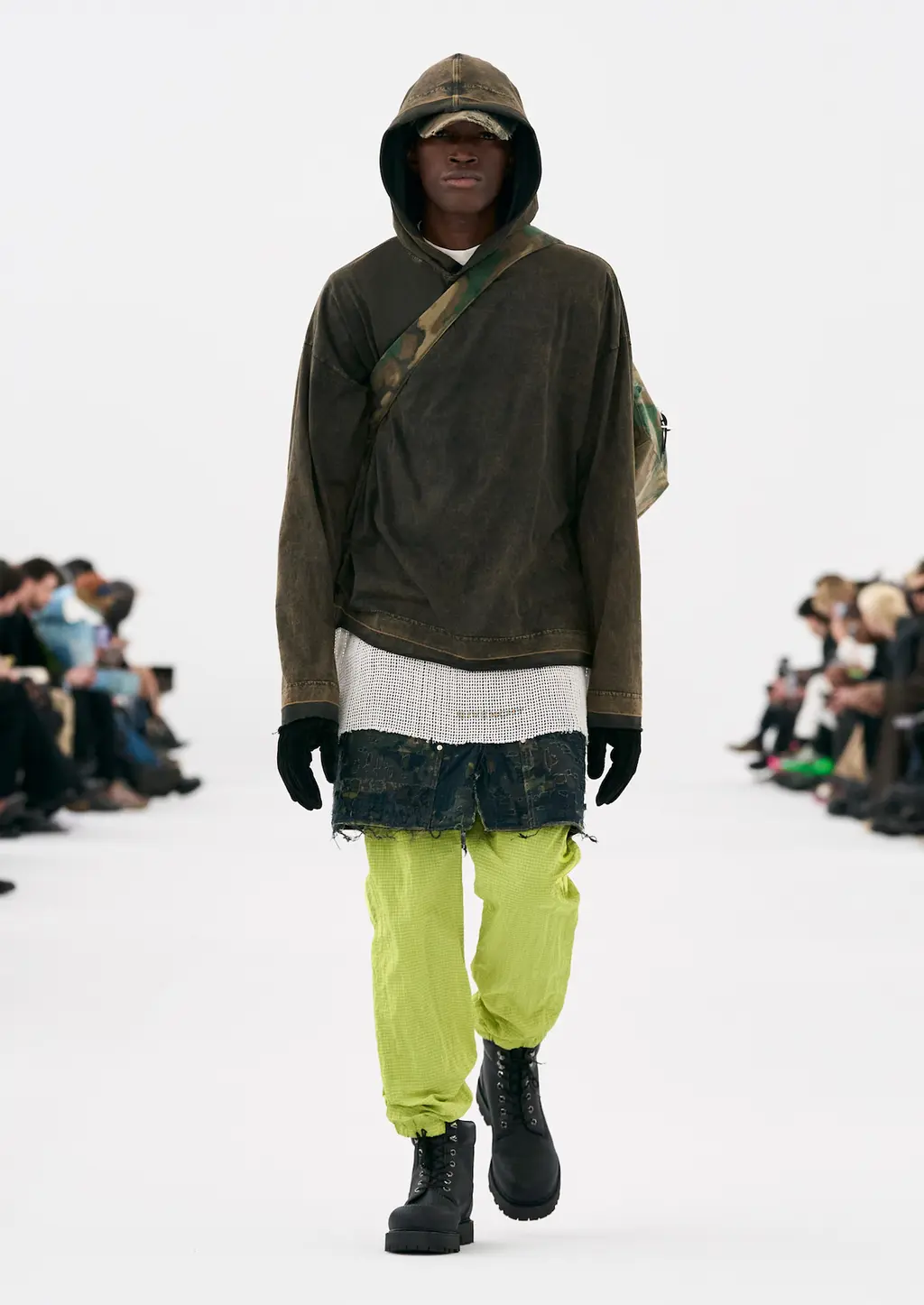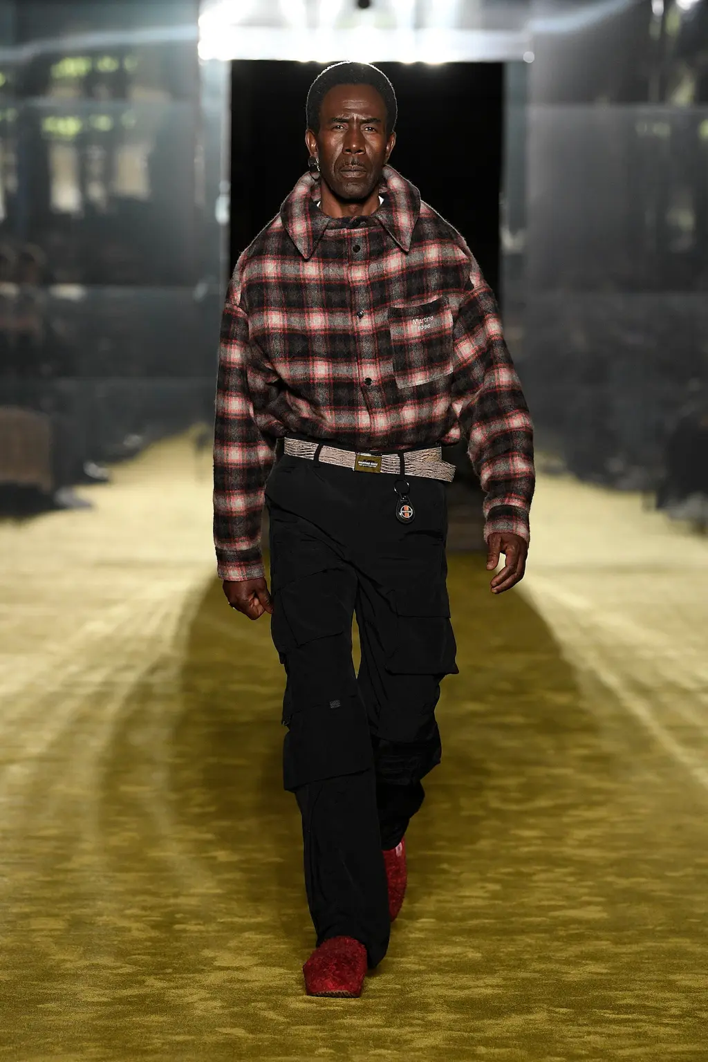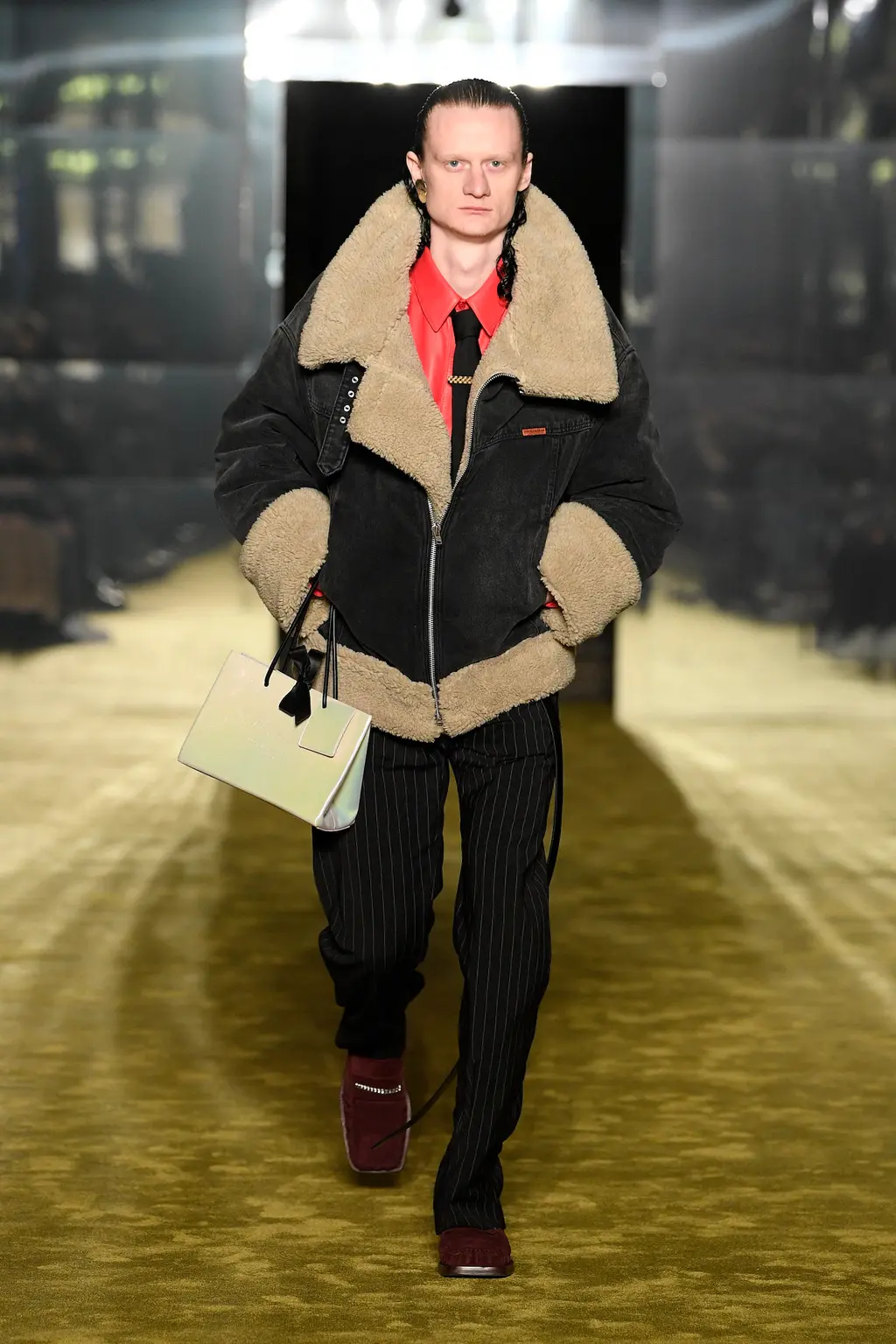 It was all about the styling, the way that people express themselves via the way they wear their clothes. Sure, the usual tropes were present: sharp tailoring, killer outerwear and bold streetwear staples. But it was clear that Williams was thinking about real use cases for the pieces in his collection with a new, pared-back vision for formality, elevated workwear and a grungy take on casuals. This all came together by way of shrunken hoodies, plaids tied around the waist, stone-washed denims, metallic shell suits, spliced-open cargo pants, oversized fur coats and a deconstructed “sweat-skirt”, which is said to have been inspired by a 1960s photograph of Hubert de Givenchy with a jumper tied around his waist like a skirt.