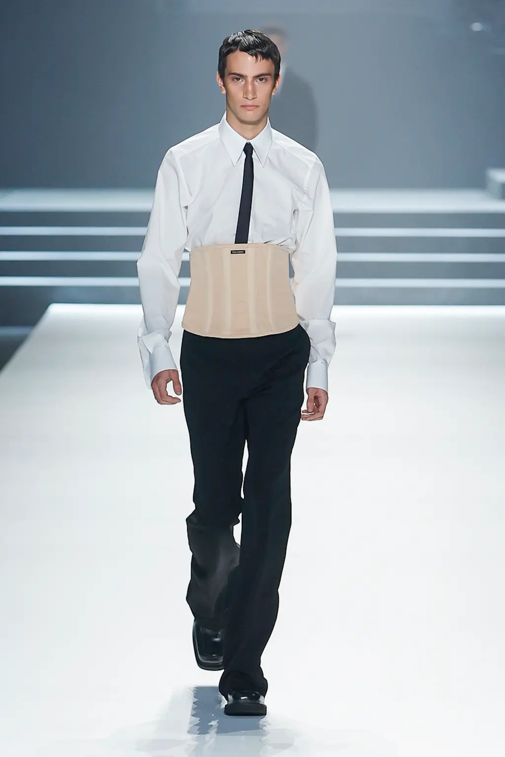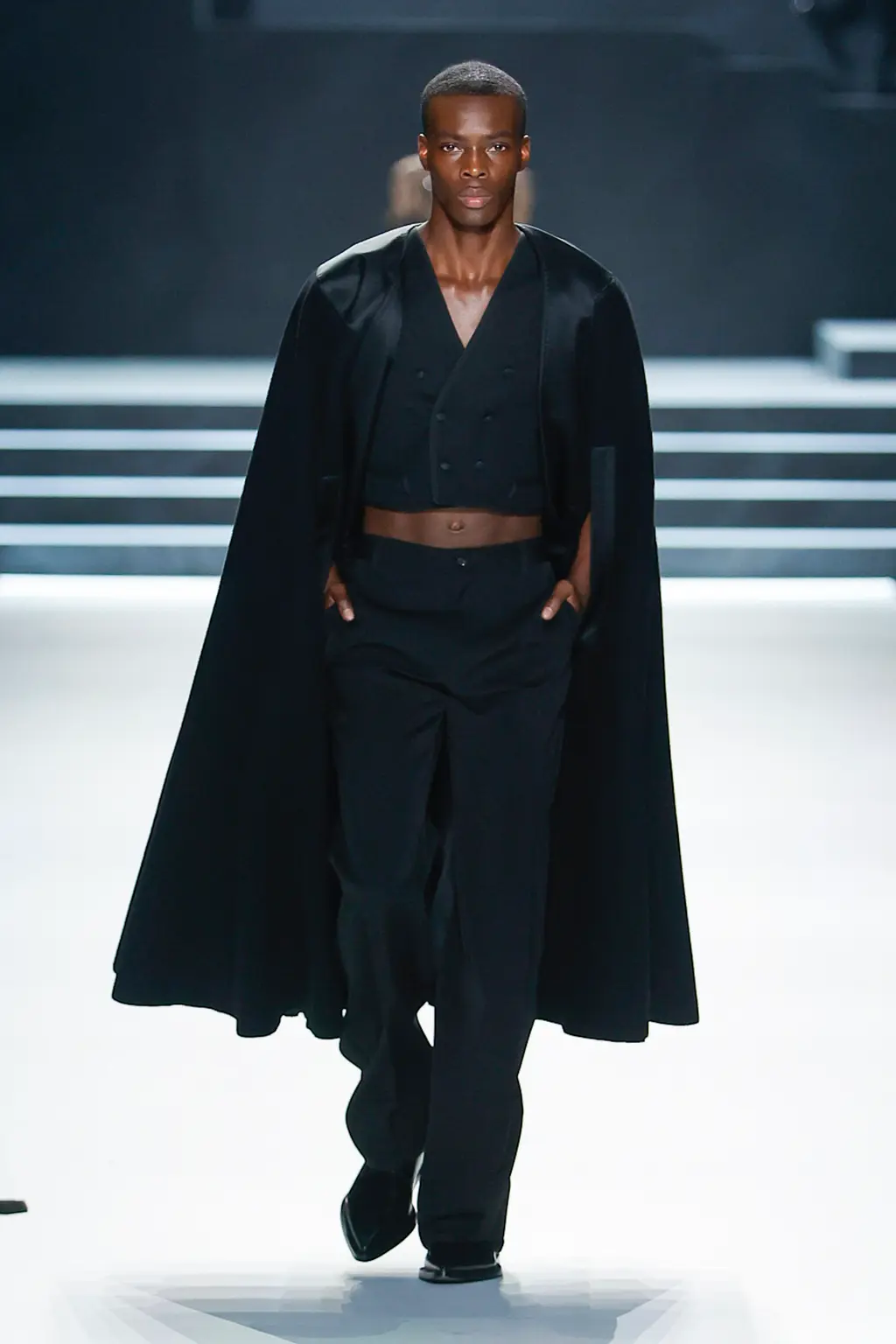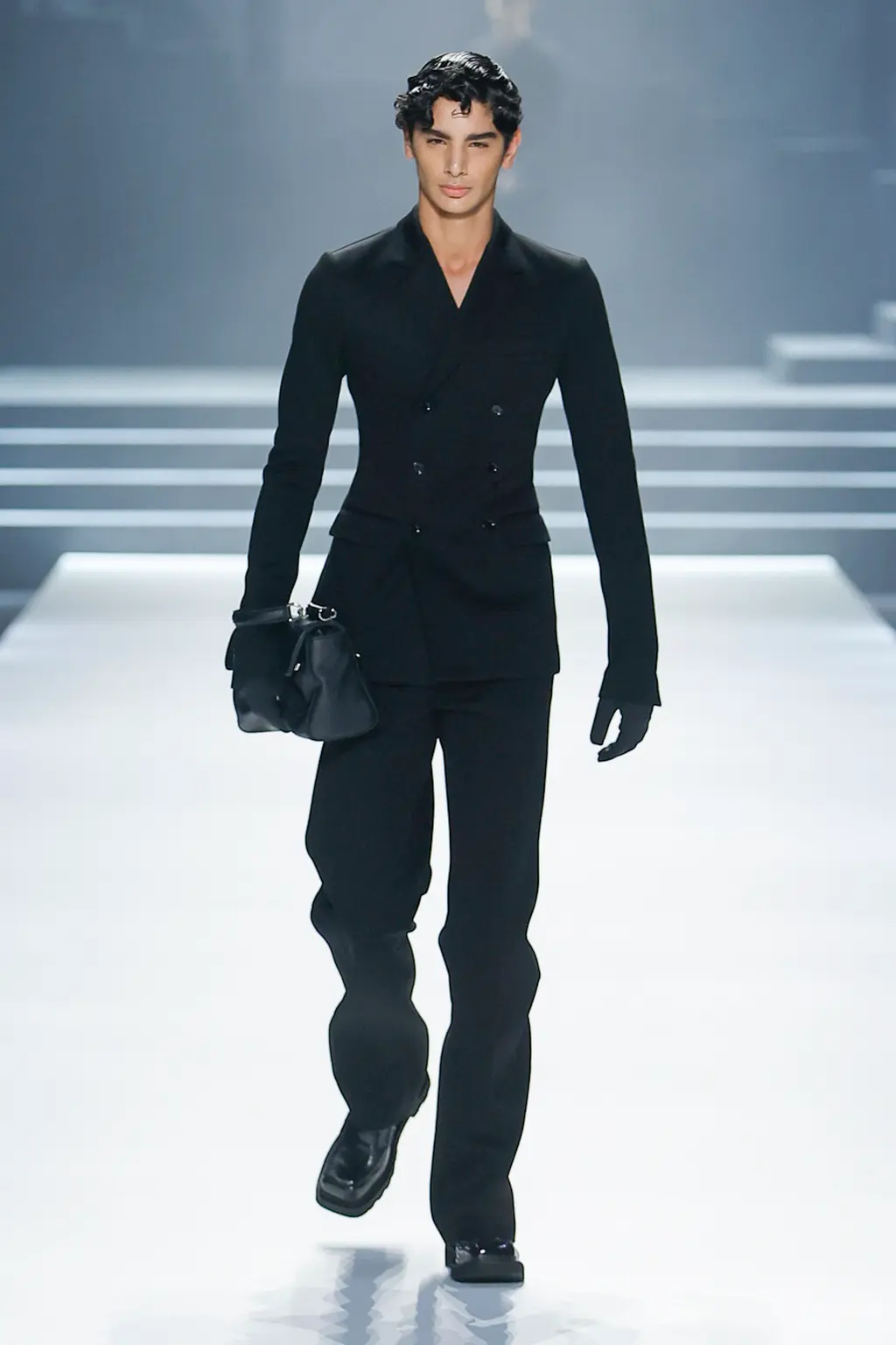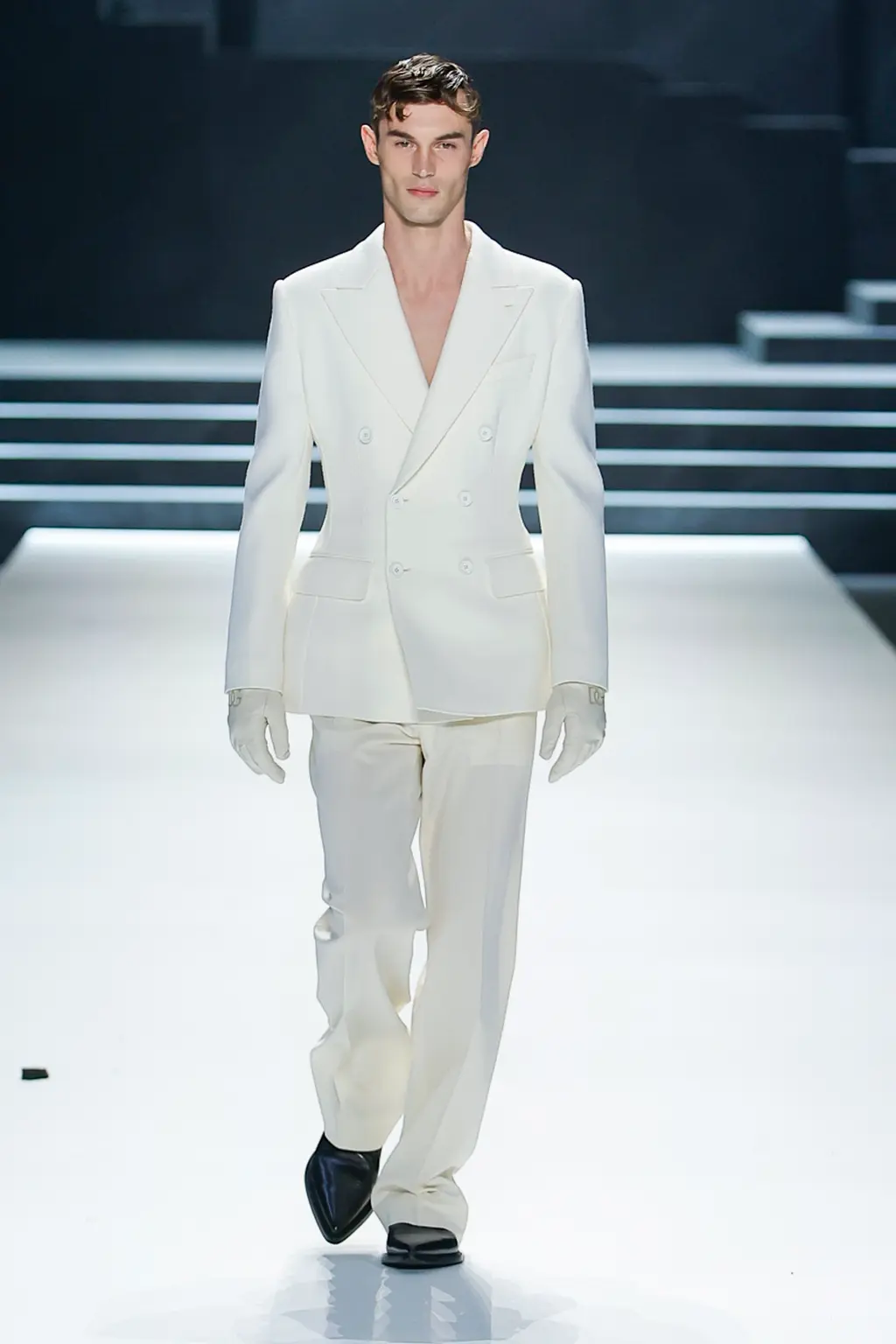 Black; by our estimate a good 80 per cent dedicated to the kind of inky tailoring Domenico Dolce and Stefano Gabbana do so well. Shirts, if worn at all, were embraced by exterior corsets, while crucifixes bounced atop pecs, like an IRL version of the hot priests calendar. Titled “Essence”, the show was an impressive display of the house’s sharply tailored codes.