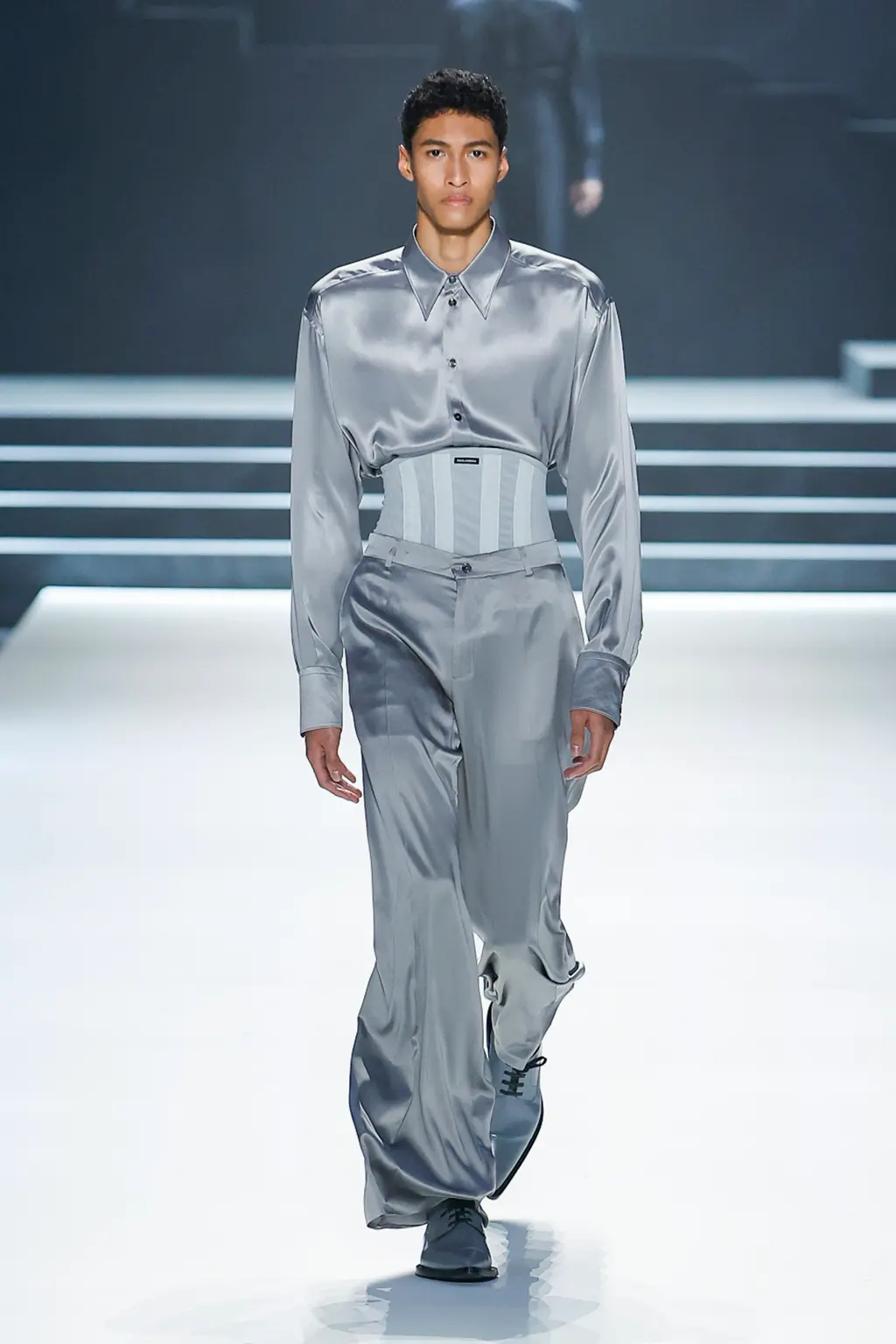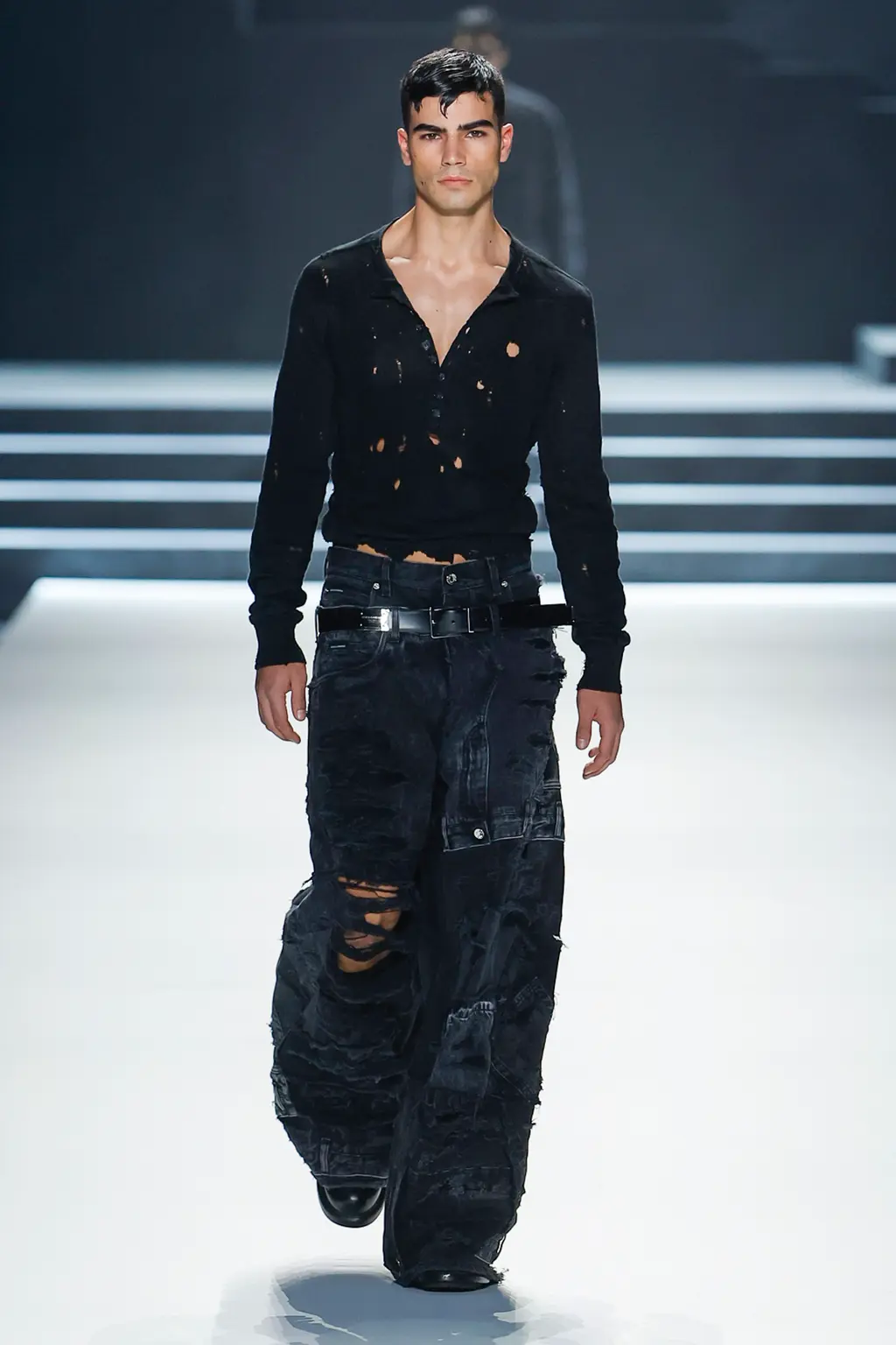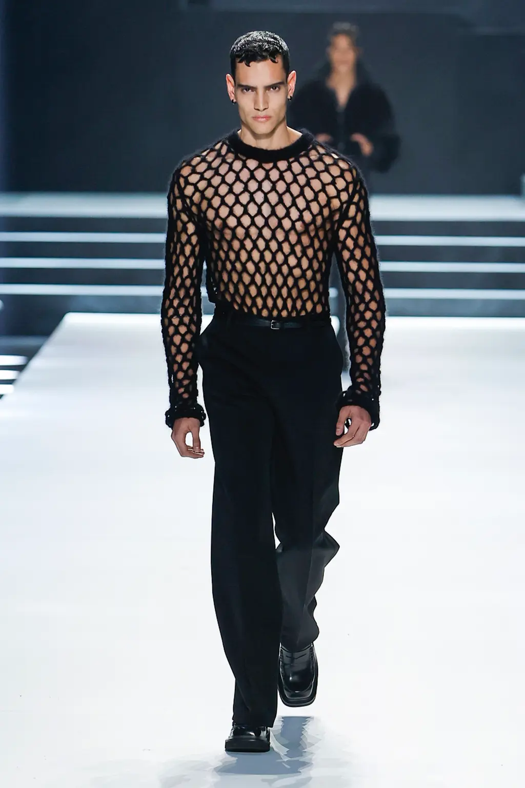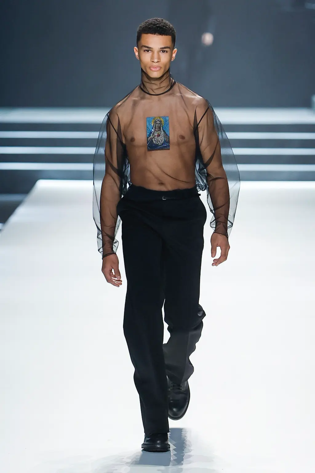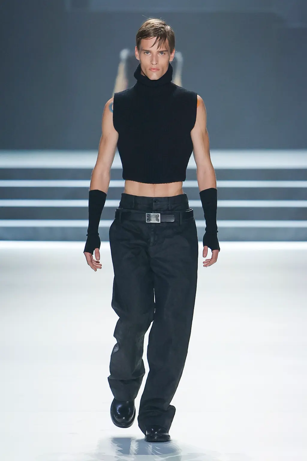 Black; by our estimate a good 80 per cent dedicated to the kind of inky tailoring Domenico Dolce and Stefano Gabbana do so well. Shirts, if worn at all, were embraced by exterior corsets, while crucifixes bounced atop pecs, like an IRL version of the hot priests calendar. Titled “Essence”, the show was an impressive display of the house’s sharply tailored codes.