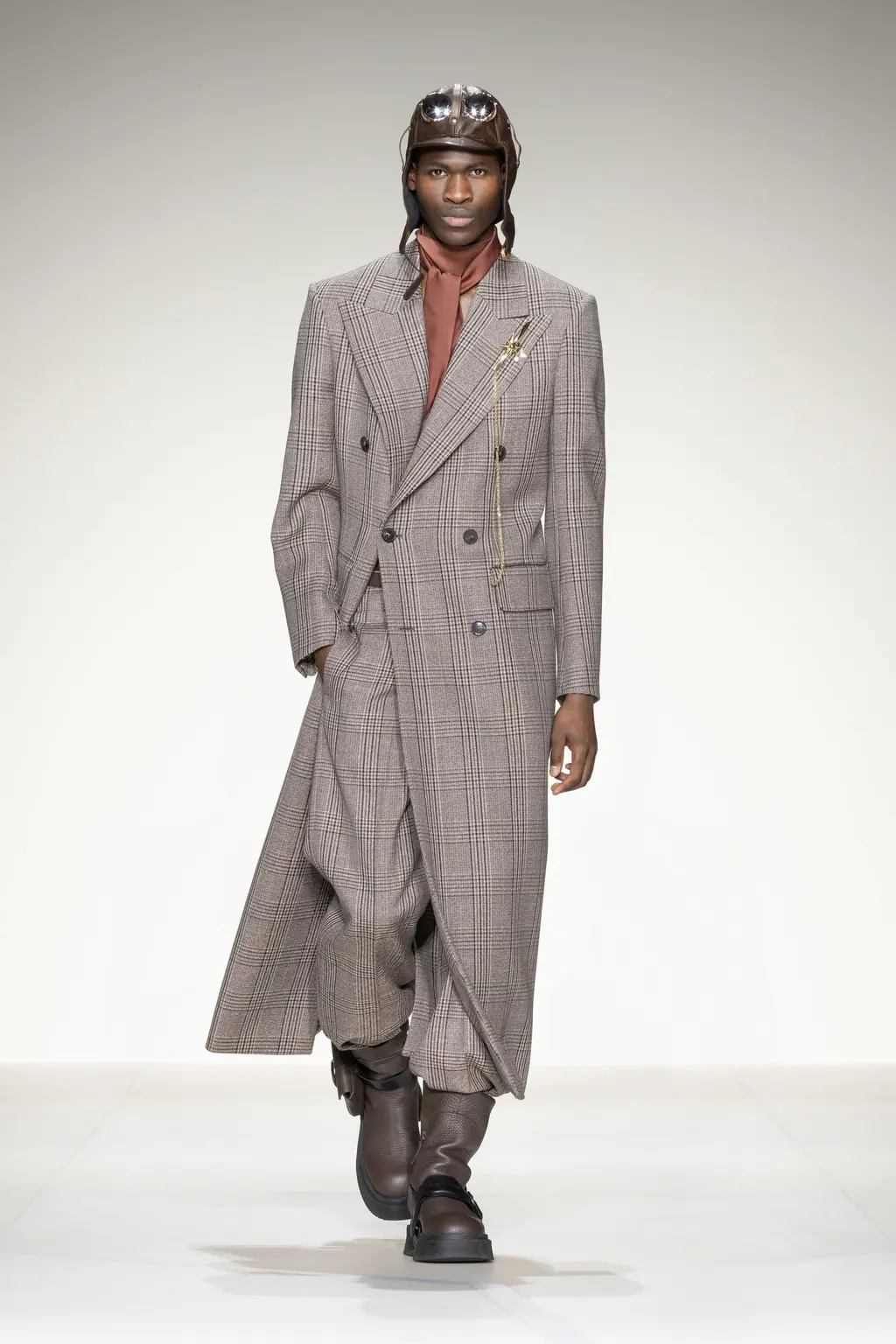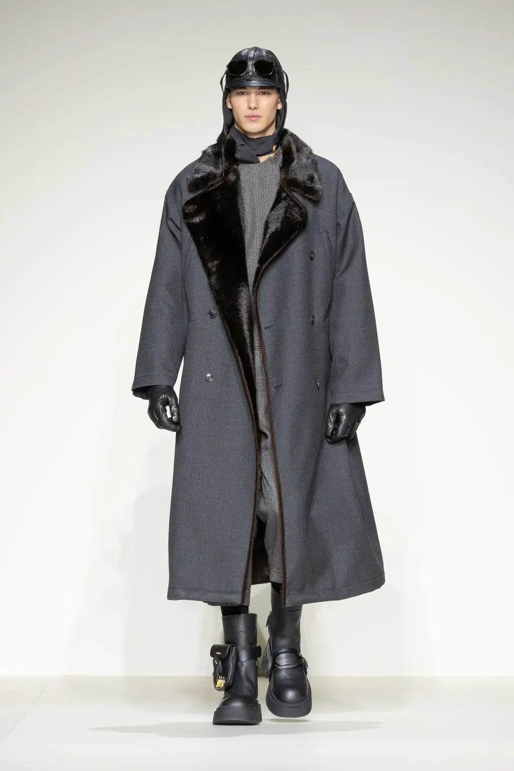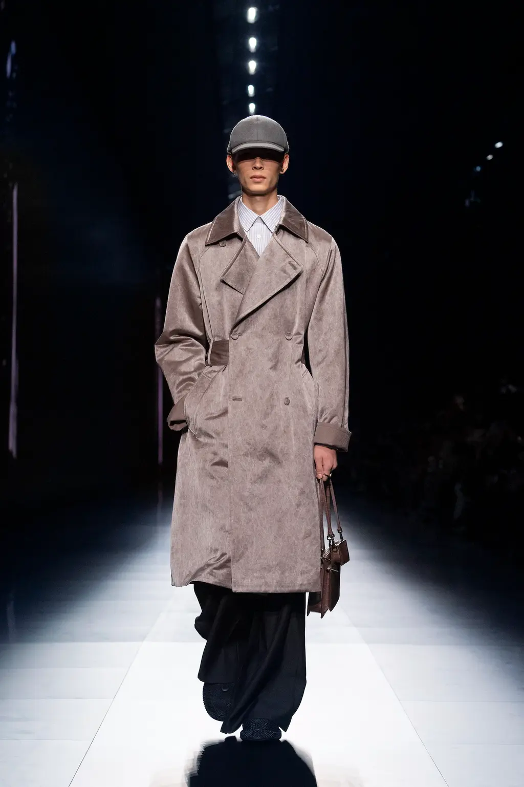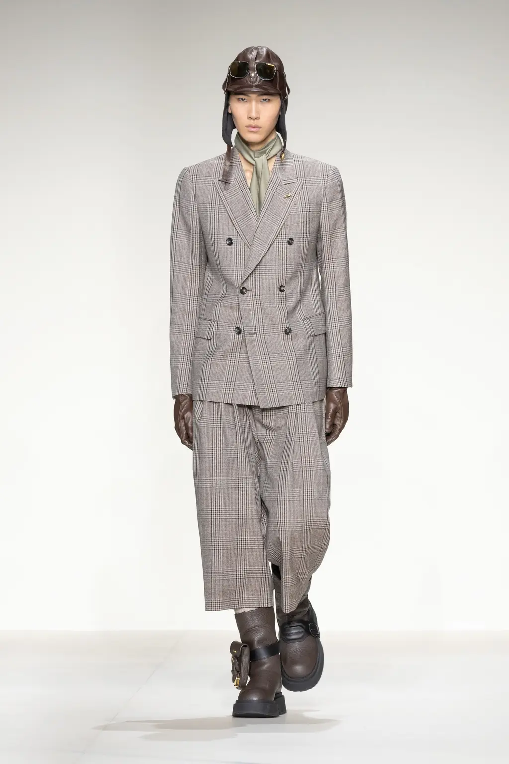 Models walked out on, and literally circled, a map of Milan on the runway floor, wearing leather gloves, leather boots and leather flight caps. Dark sunglasses completed several looks (worn on the head like a pulled back pair of flight goggles), and the silk scarf-accessorised tailoring of the latter half felt indebted to the Golden Age of Air Travel. With Masters of Air coming to Apple TV+ this year, Armani will be hoping it takes off in the way Top Gun: Maverick did.