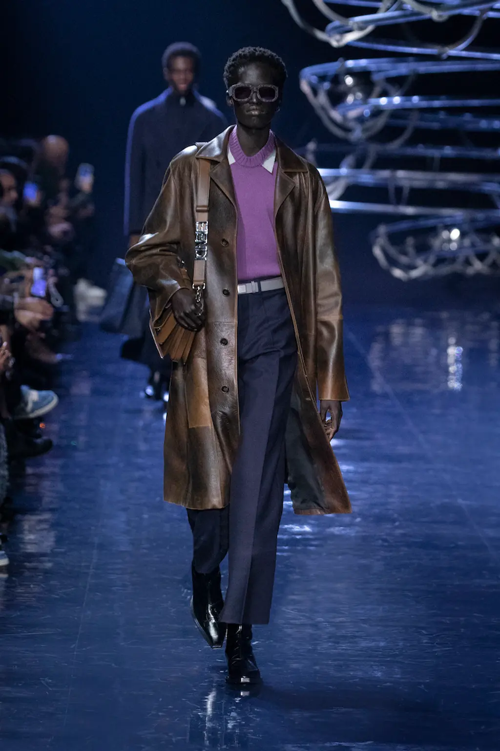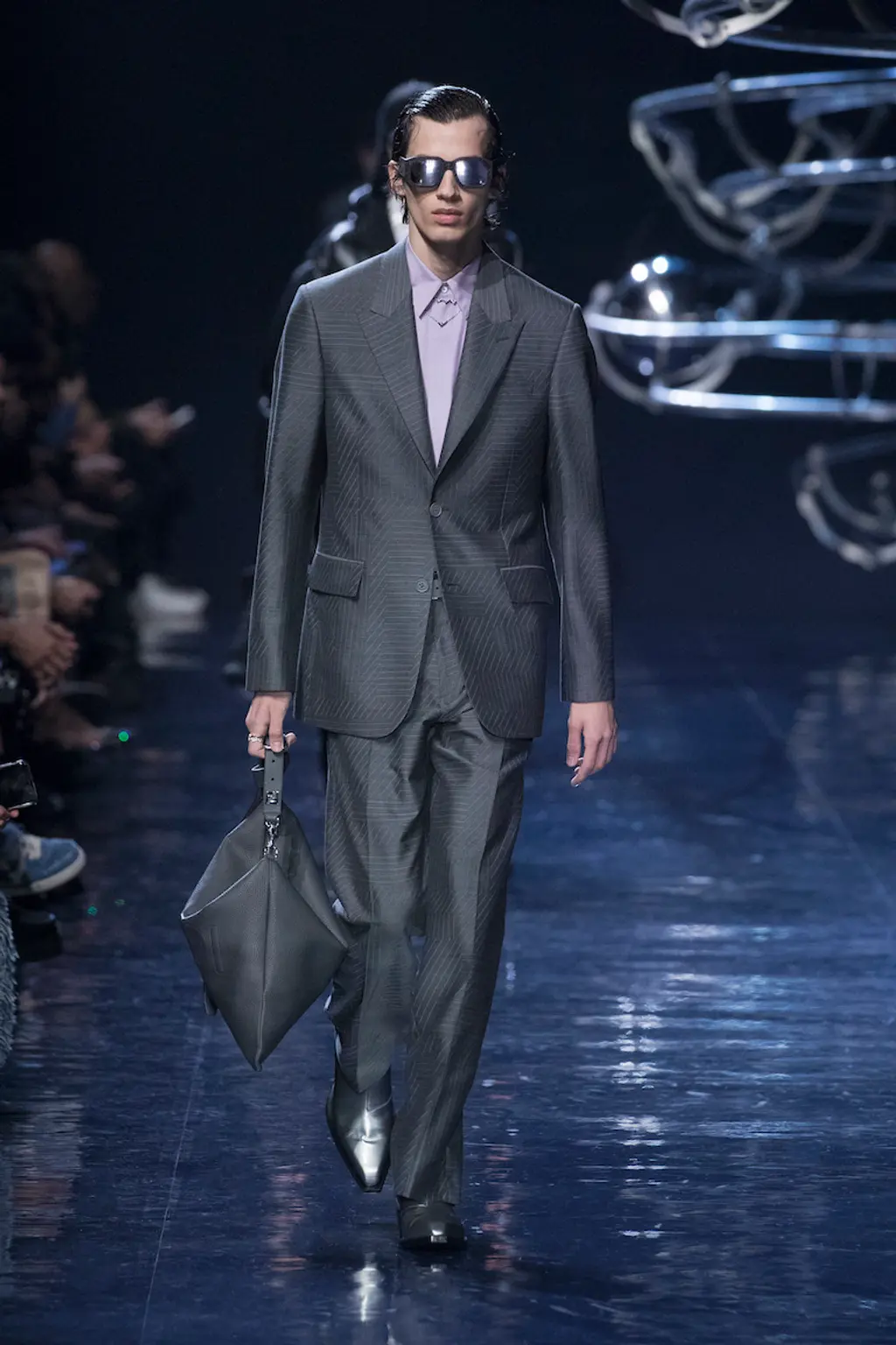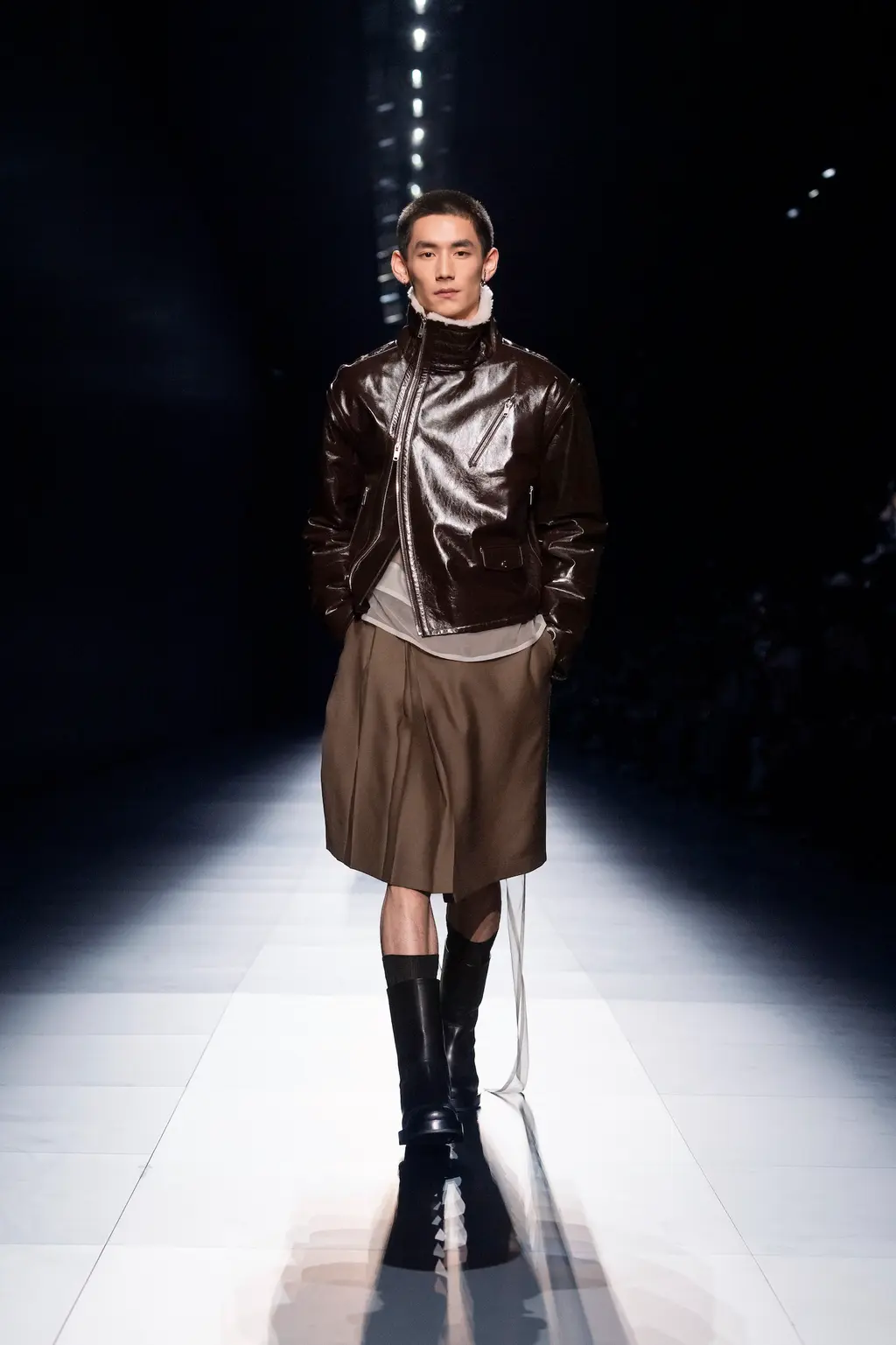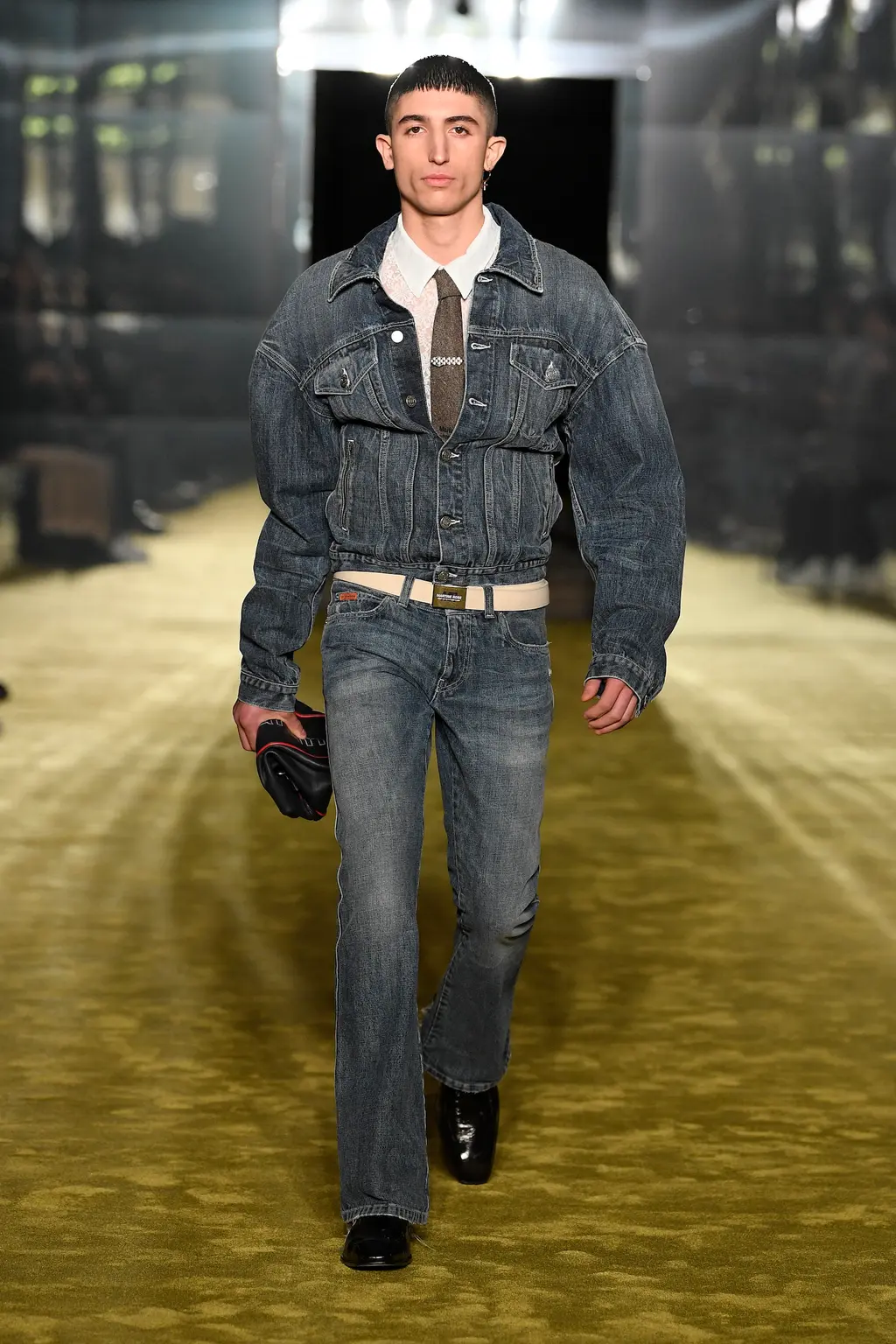 Models walked out on, and literally circled, a map of Milan on the runway floor, wearing leather gloves, leather boots and leather flight caps. Dark sunglasses completed several looks (worn on the head like a pulled back pair of flight goggles), and the silk scarf-accessorised tailoring of the latter half felt indebted to the Golden Age of Air Travel. With Masters of Air coming to Apple TV+ this year, Armani will be hoping it takes off in the way Top Gun: Maverick did.