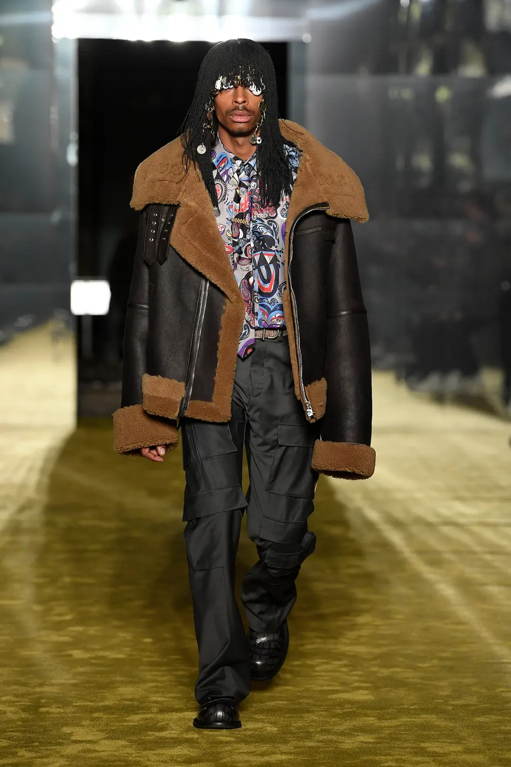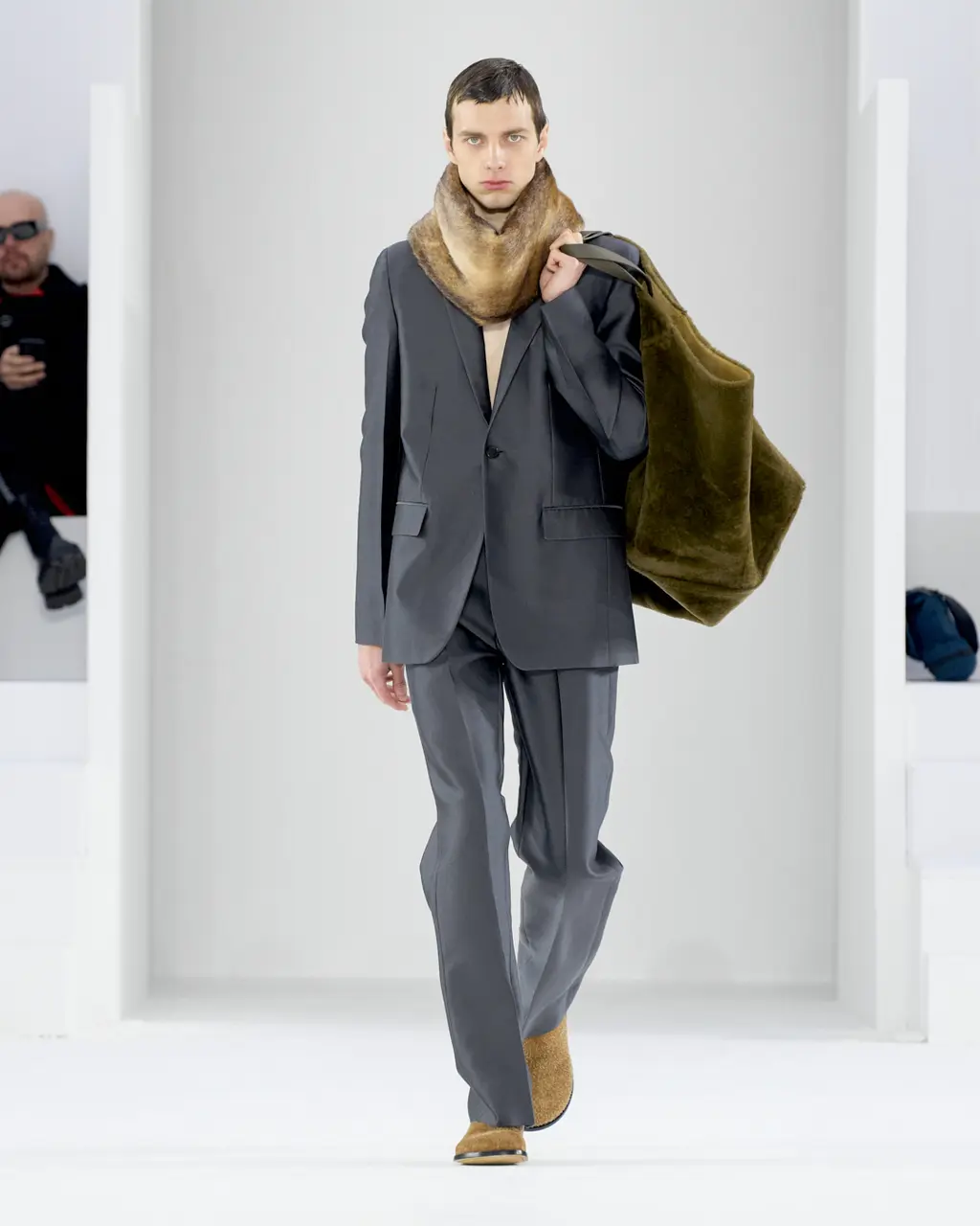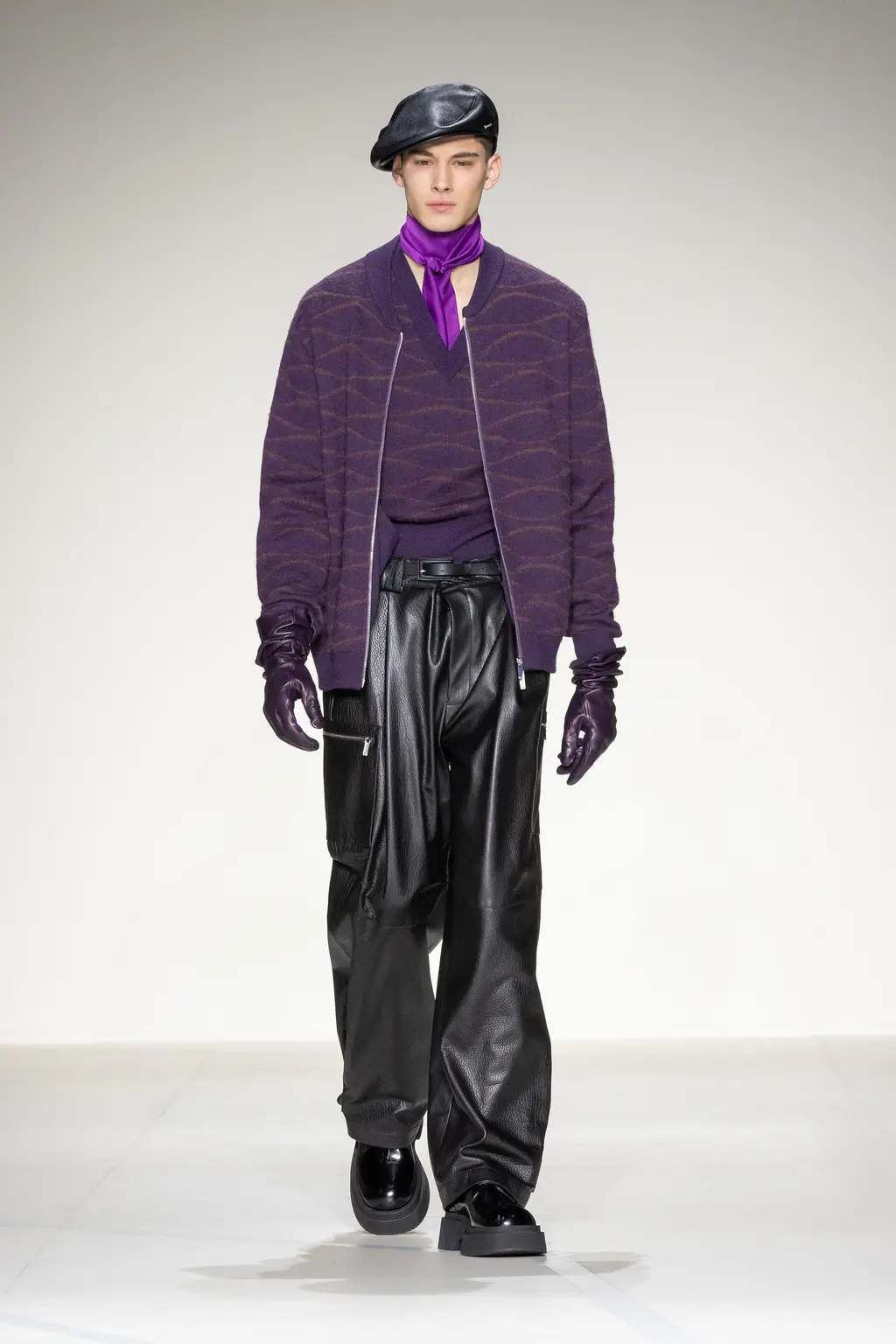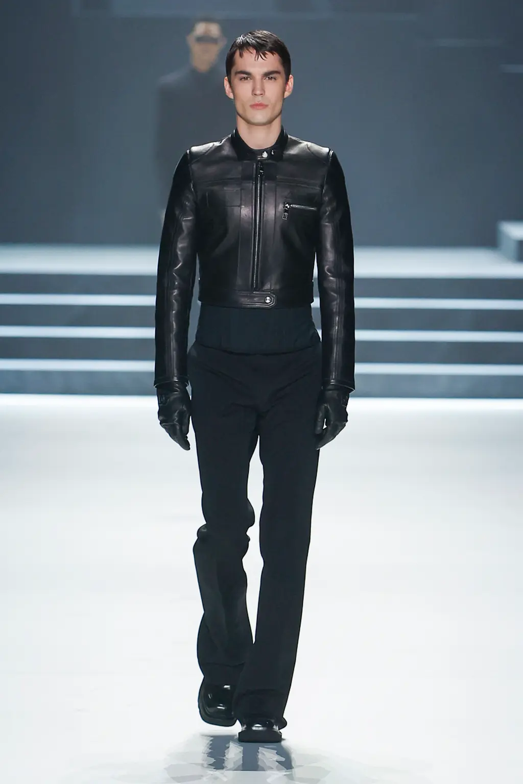Models walked out on, and literally circled, a map of Milan on the runway floor, wearing leather gloves, leather boots and leather flight caps. Dark sunglasses completed several looks (worn on the head like a pulled back pair of flight goggles), and the silk scarf-accessorised tailoring of the latter half felt indebted to the Golden Age of Air Travel. With Masters of Air coming to Apple TV+ this year, Armani will be hoping it takes off in the way Top Gun: Maverick did.