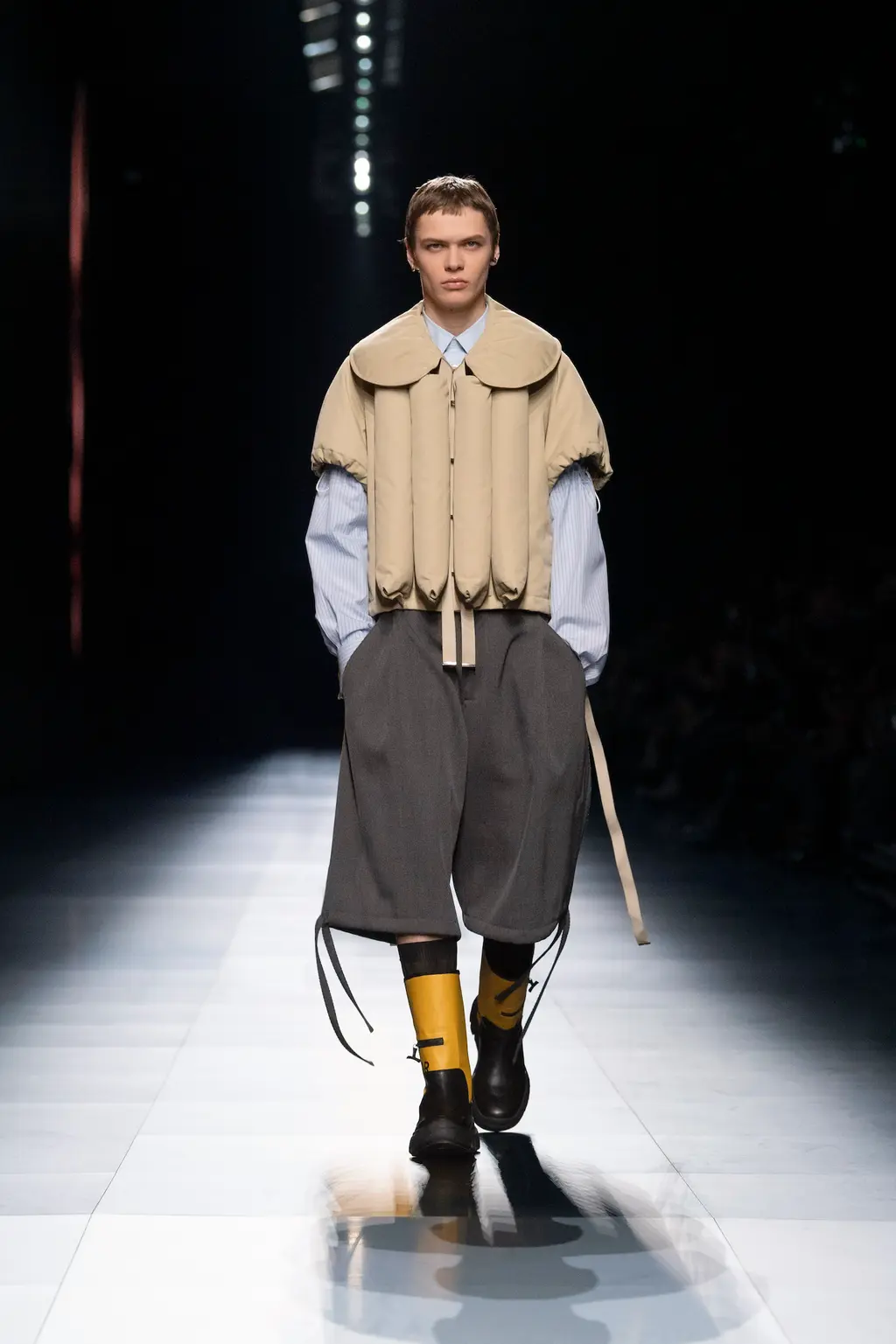 A typical Rick Owens affair: dystopian and devilishly good – and said to be inspired by the designer’s winter retreat to Luxor, Egypt. Owens’ trademark architectural shapes engulfed the bodies of their wearers, this time with an emphasis on high shoulders, nipped in waists and flared hems – something Owens referred to as an “almost Victorian silhouette”. As ever, the boots were nothing short of brilliant. See: a wader-esque version of the brand’s cult Kiss boot and a padded flatform style that’s not dissimilar to an ankle walker boot (hospital chic?).