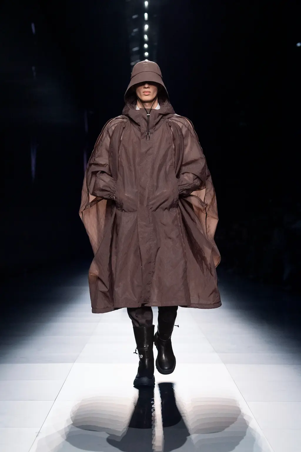 Much like the themes explored in Eliot’s watershed poem – reinvention and renewal – Jones explored the brief period in Dior’s history when Yves Saint Laurent was at the house’s helm from 1958 – 1960, aged 21, with a future-facing outlook. Referencing traditional fisherman attire, the collection featured a series of oversized splash-proof anoraks, Aran knits, buoyant life-jacket-esque gilets, rubberised rain hats and Wellington boots. Elsewhere, these silhouettes were met with lighter, looser pieces: wide skirts, wafer-thin, transparent tent-like layers and velvet trench coats in a palette dominated by neutrals and greys.