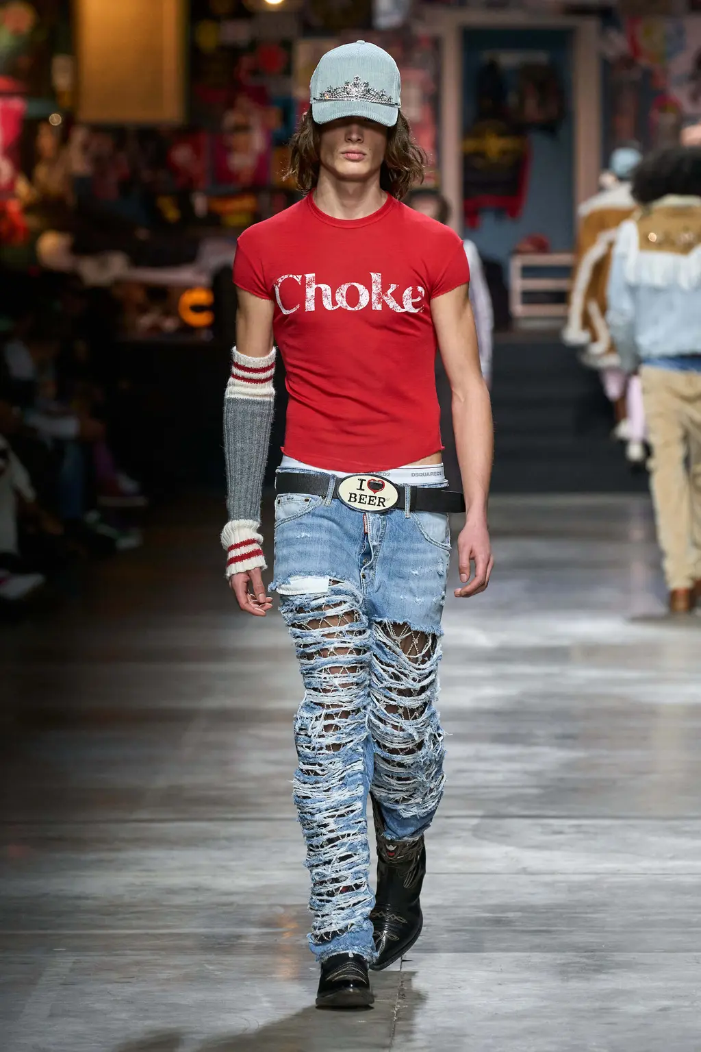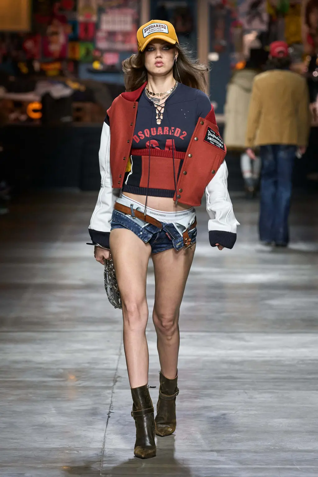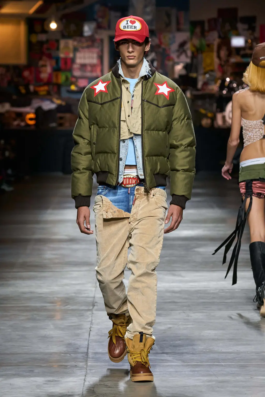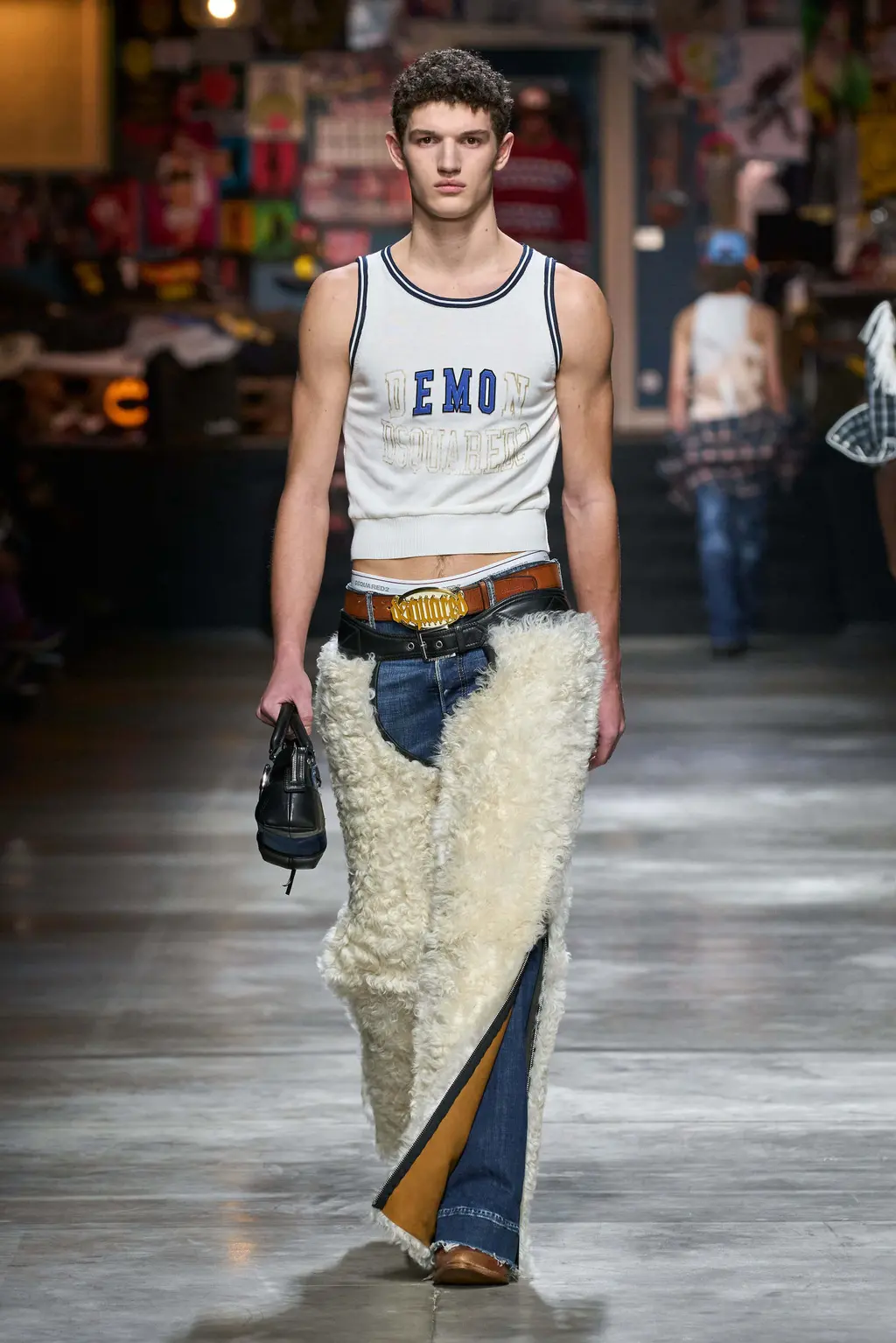 A teenage wet dream. Tops tight, flies open, bums out, the Grease soundtrack mega-mixing into Britney Spears’s 2003 Outrageous (released the same year as the first Dsquared2 women’s runway show). You could feel that era in the designs too, where trucker caps, big buckled belts and slogan T‑shirts worked alongside frayed denim, Western style fringing and shearling chaps. There was a preppy touch to some of the looks, with socks pulled up over tennis pumps, and varsity style pieces here and there. The effect was to create a high school collection with the entire studentry catered for: from jock kids to rock kids and nerdy nose pickers in between.