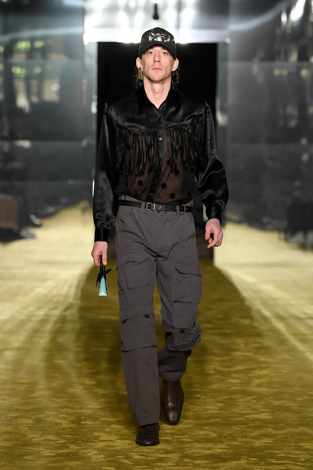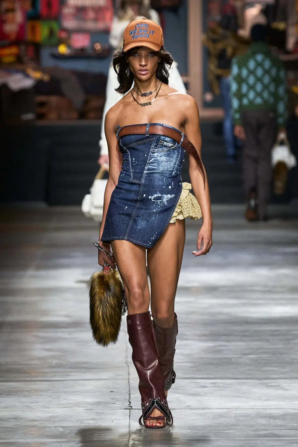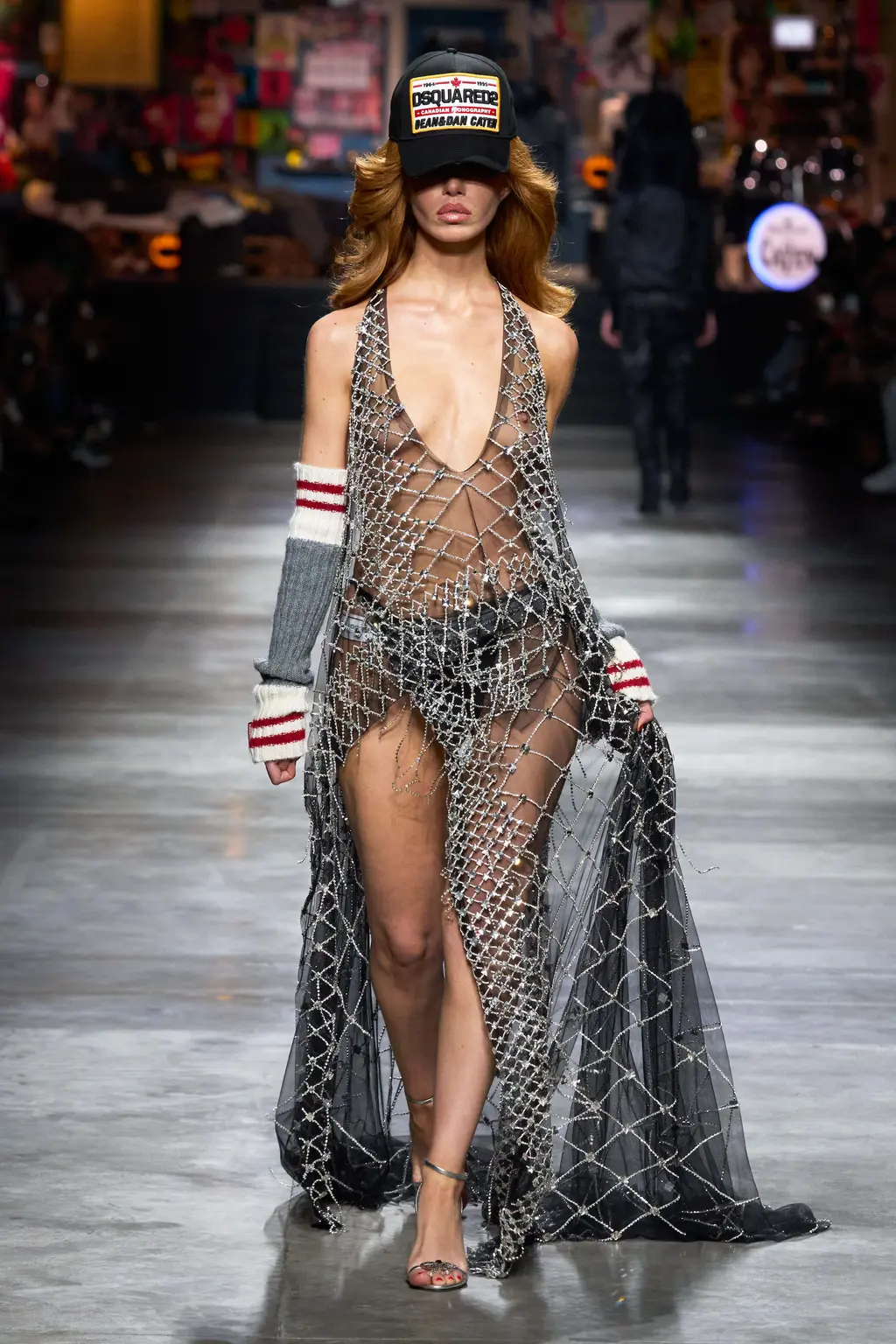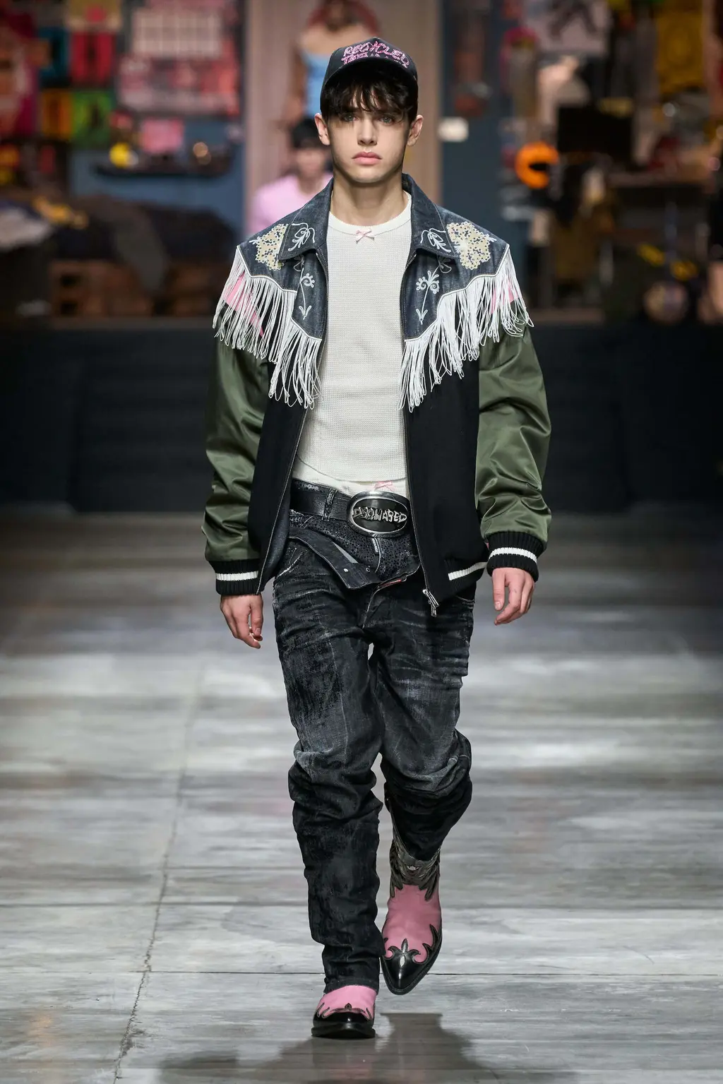 A teenage wet dream. Tops tight, flies open, bums out, the Grease soundtrack mega-mixing into Britney Spears’s 2003 Outrageous (released the same year as the first Dsquared2 women’s runway show). You could feel that era in the designs too, where trucker caps, big buckled belts and slogan T‑shirts worked alongside frayed denim, Western style fringing and shearling chaps. There was a preppy touch to some of the looks, with socks pulled up over tennis pumps, and varsity style pieces here and there. The effect was to create a high school collection with the entire studentry catered for: from jock kids to rock kids and nerdy nose pickers in between.