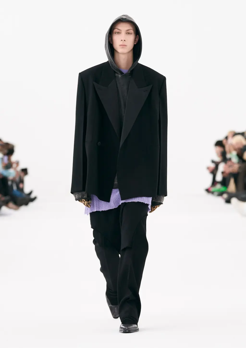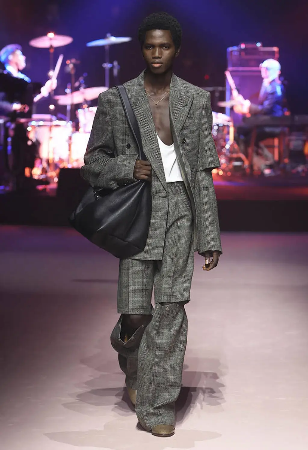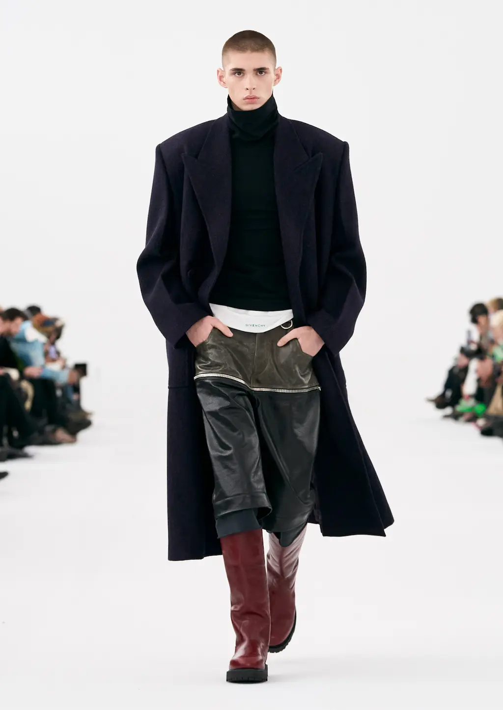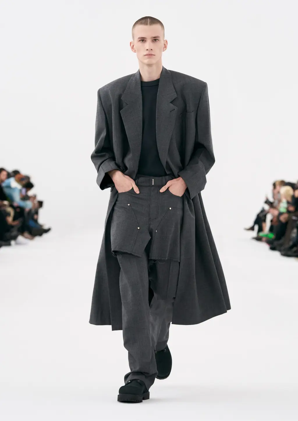 A series of leather chemical waste disposal squad style boiler suits that, when folded down, revealed the Givenchy logo. And a deconstructed grey tracksuit remixed with a sharply tailored white suit, that’s sure to spice up grey tracksuit season. Wahey.