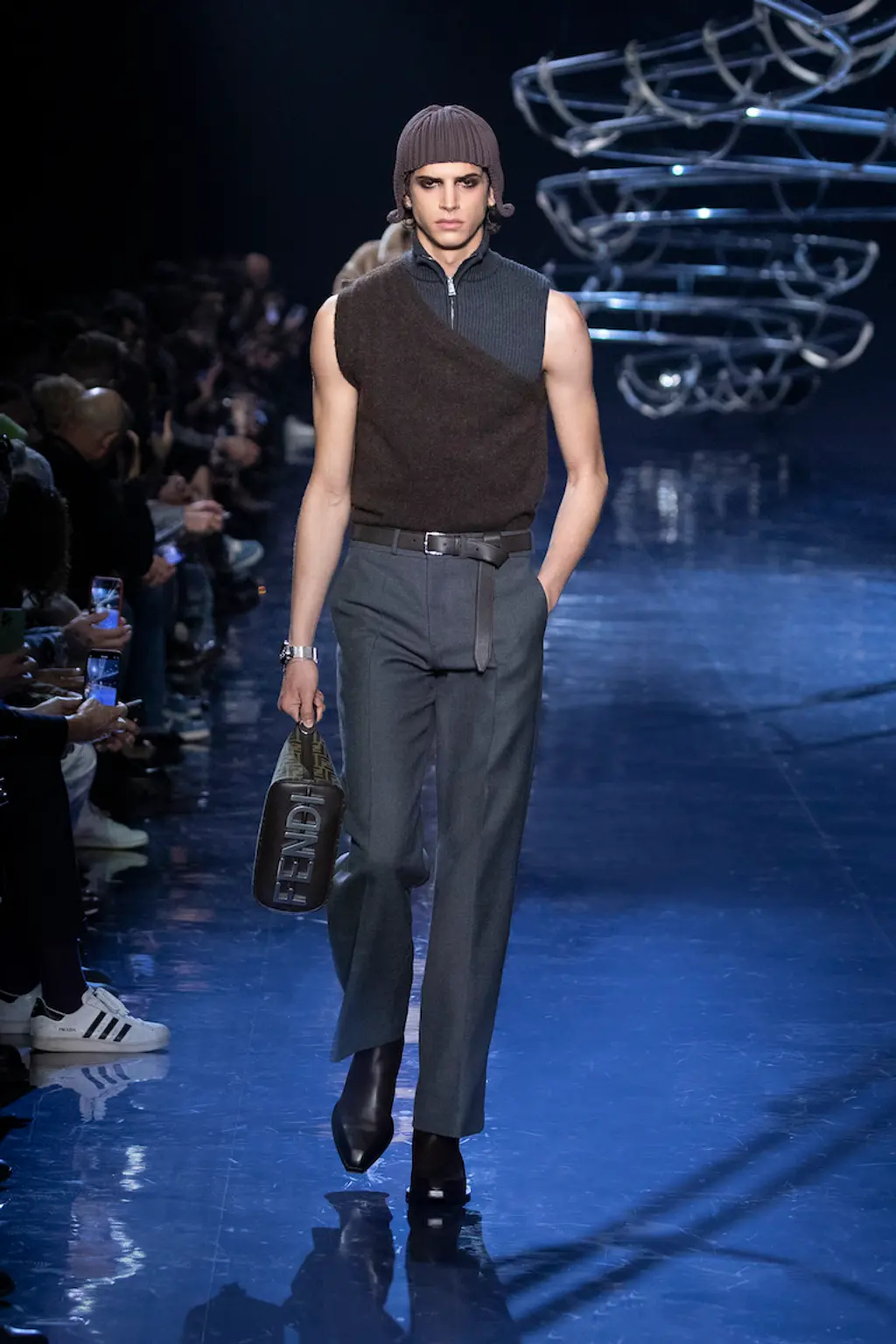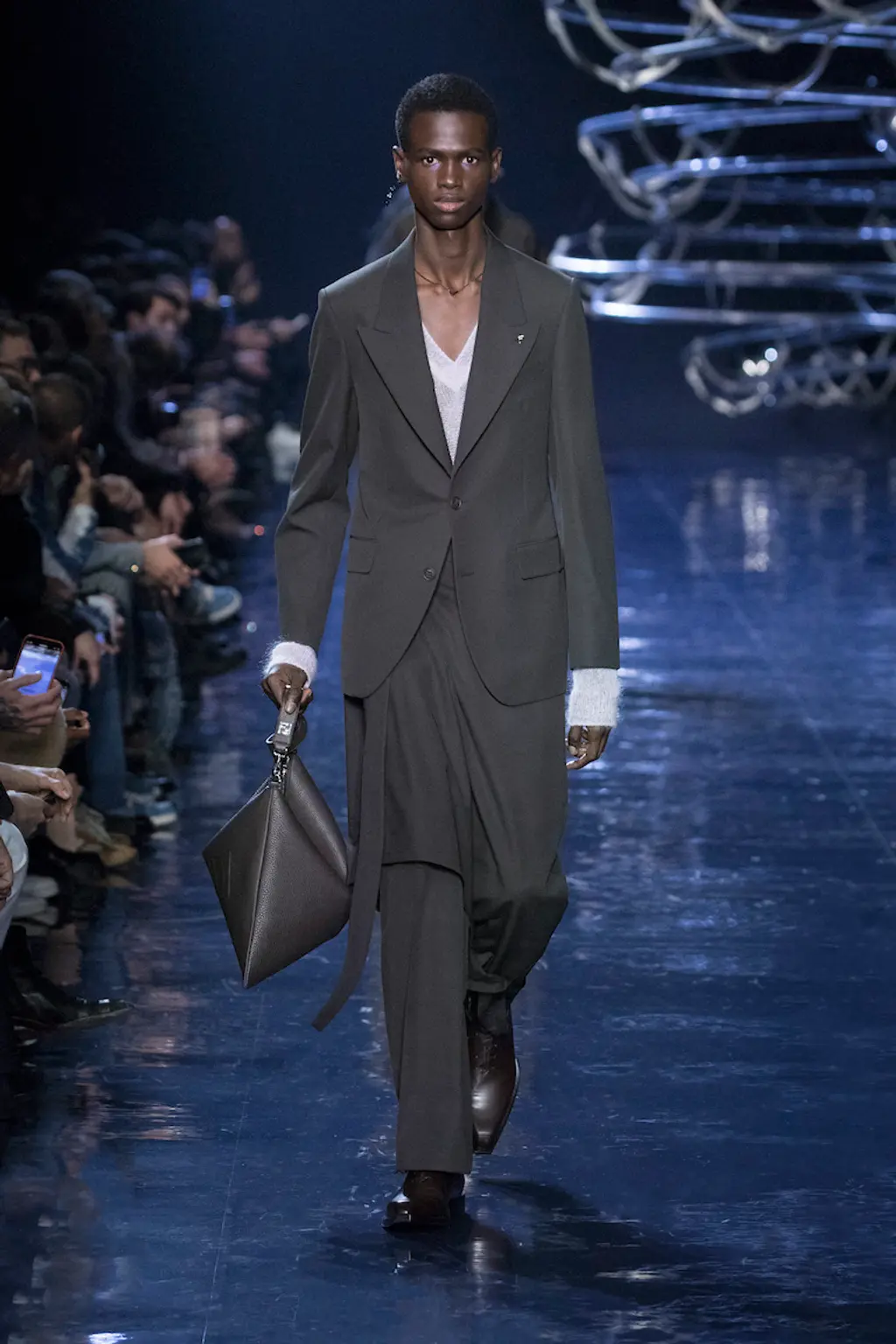 Opening with the voice of Italian songwriter and producer Giorgio Moroder, this was a collection inspired by the roller disco. Or more specifically, a pinball machine inside the roller disco, a succession of large, metallic balls rolling on tracks above the audience’s head. The dance floor is something artistic director Silvia Venturini Fendi has explored before, most recently in the brand’s SS22 collection, created with Kim Jones, and prior to that in her socialite days at Studio 54. This time, however, the mood was captured by the “disco ball hues” of the clothes.