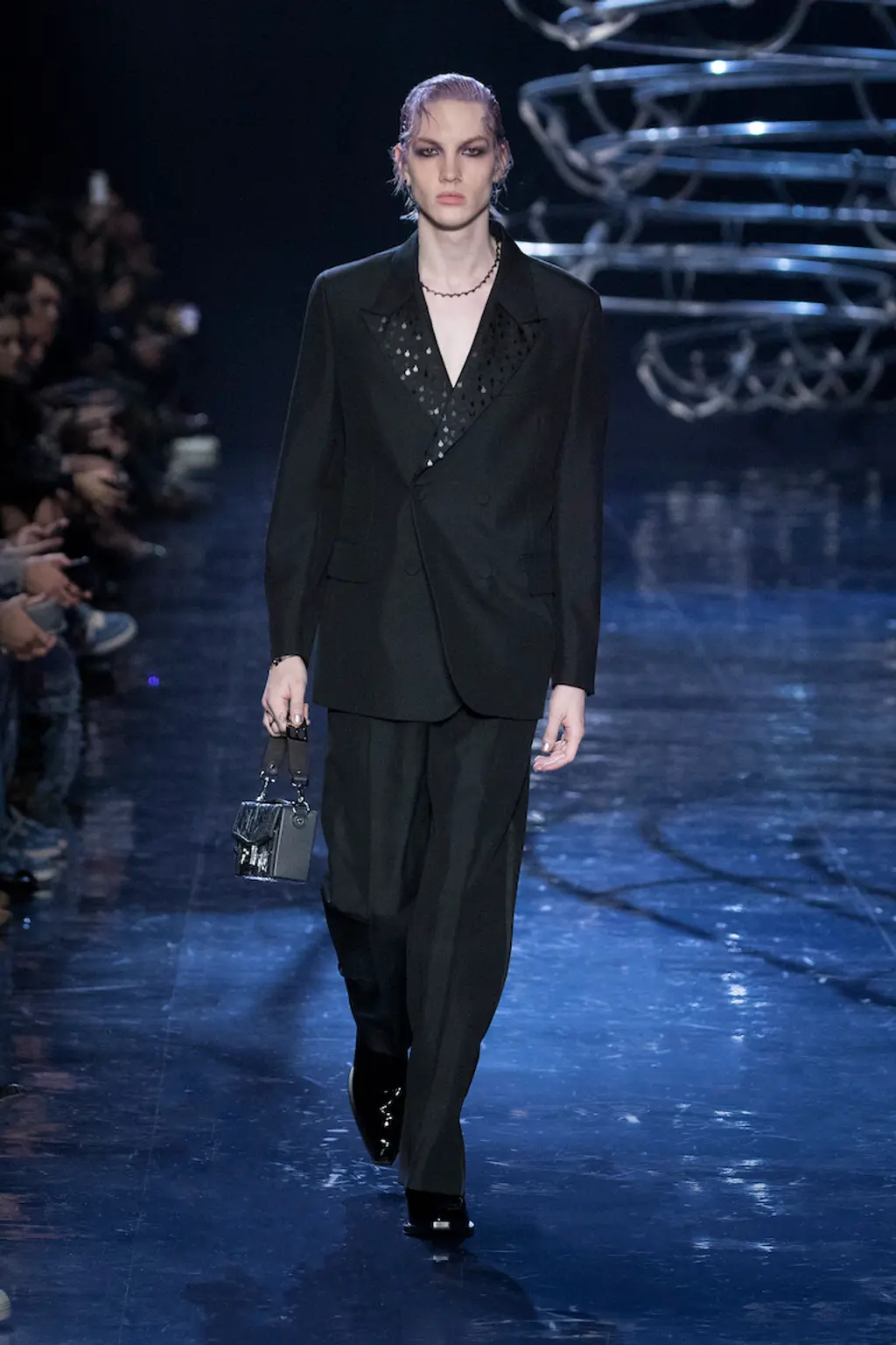 In Dior’s usual venue: a gigantic space erected just for the occasion at Paris’ Jardin des Tuileries. Inside the all-black box, the faces of Robert Pattinson and Gwendoline Christie were projected larger-than-lifesize on screens, each reciting T.S. Eliot’s post-war poem The Waste Land, which focuses on disillusionment in the contemporary world, in deep, dramatic voices.