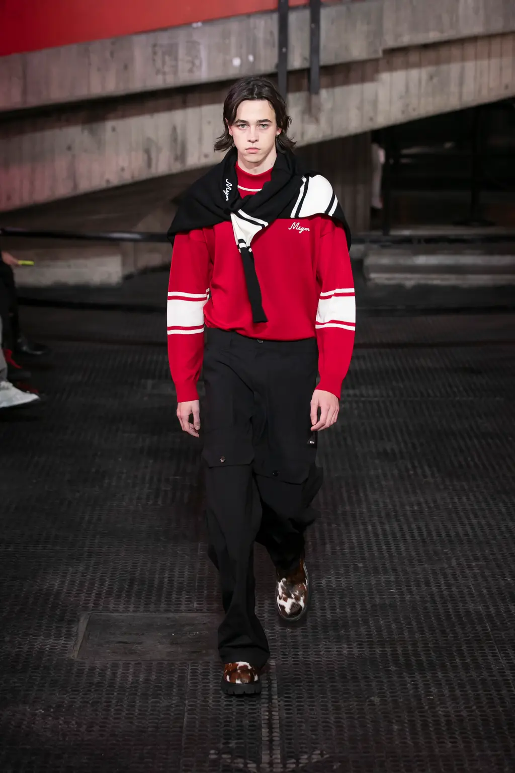 Collegiate. Massimo Giorgetti’s MSGM picked up where last night’s heaps of fun Dsquared2 show left off. The kids have graduated high school and started college. Campus looks came stamped with MSGM college insignias and cat mascots. Sports team hoodies were branded with “University of Dreamers” logos (a nod to AW18’s “University of Casualty” collection). Socks were pulled up, jumpers were tied around necks and pennant flags hung from layers of Oxford shirts, V‑necks and cardigans.