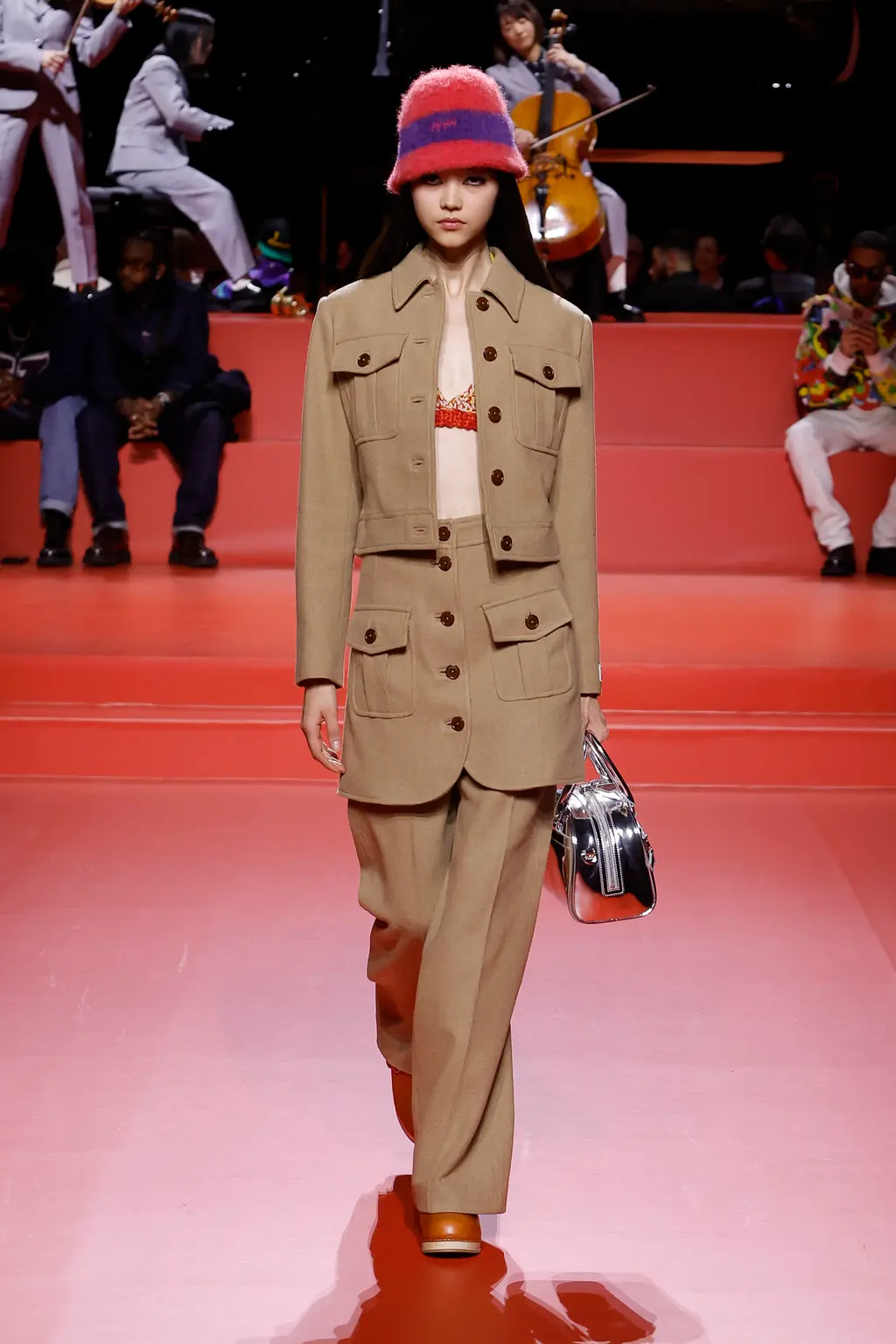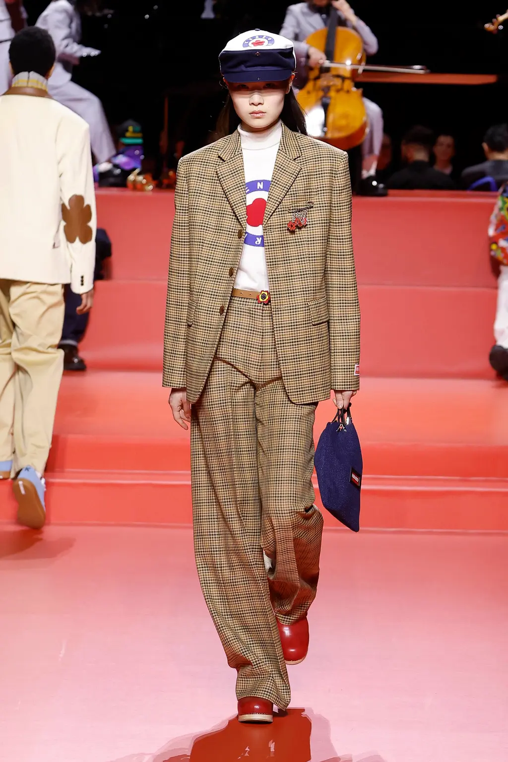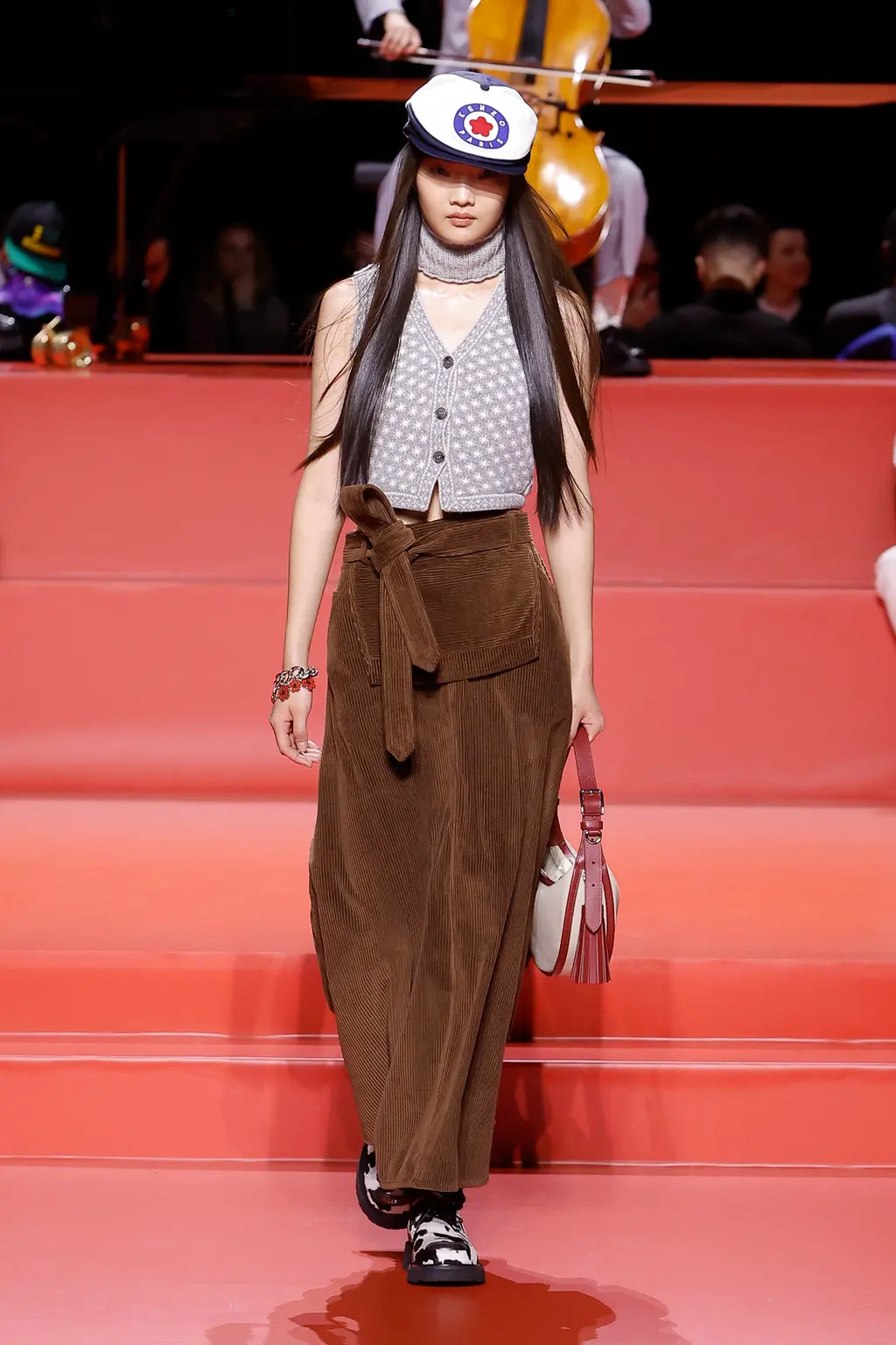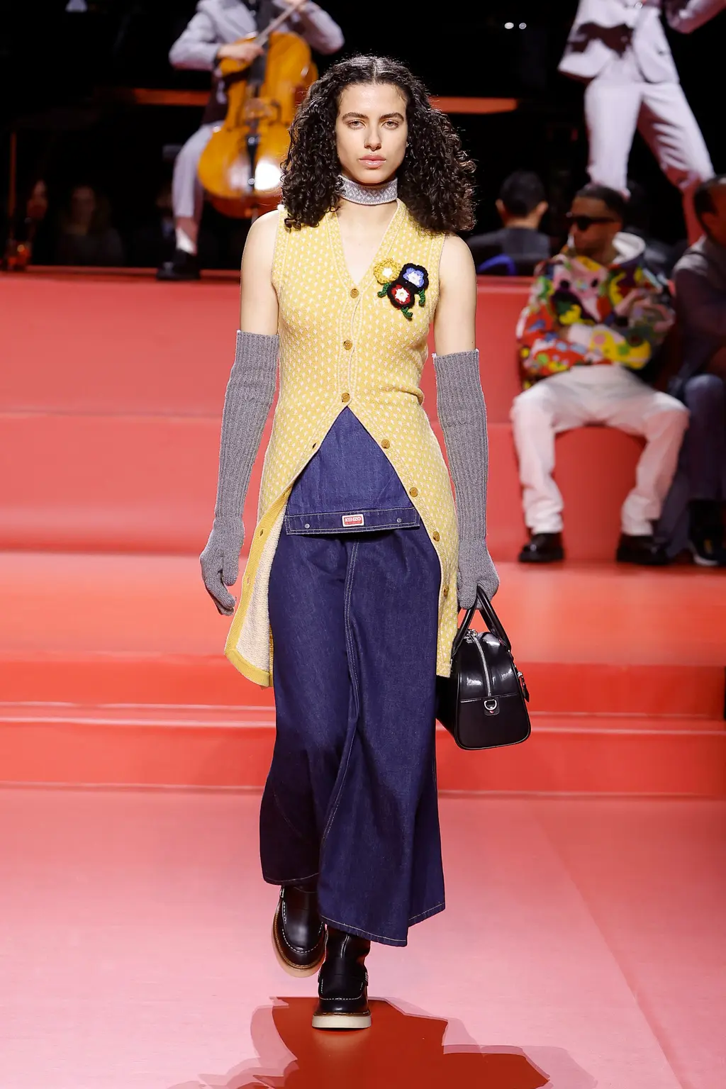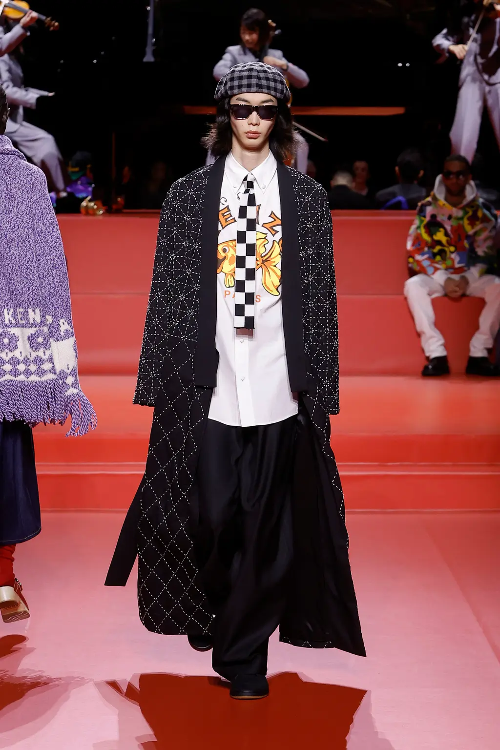 Nigo’s fascination with British dandy style and Saville Row tailoring has long been documented, and his latest collection saw this converge with Japanese street culture and American workwear. Think: checked British country outerwear, trousers with mini-skirts layered atop, Y‑shaped jackets, chocolate and canary-yellow suede mini-skirt suits, duffle coats slung over lurex fairisle knits and ruffled slip dresses. Stand out accessories came in the shape of ’80s sports bags, flower-clad wedge clogs, bob hats and oversized berets.