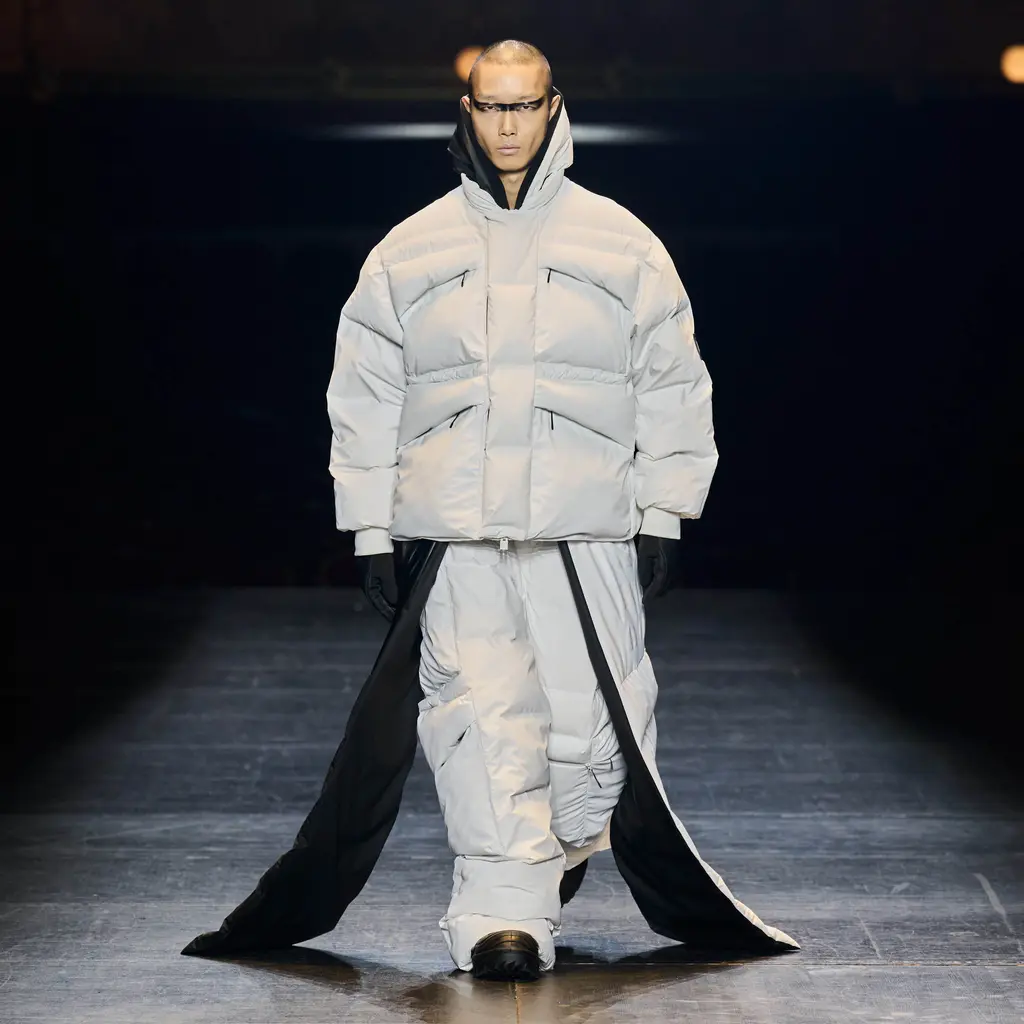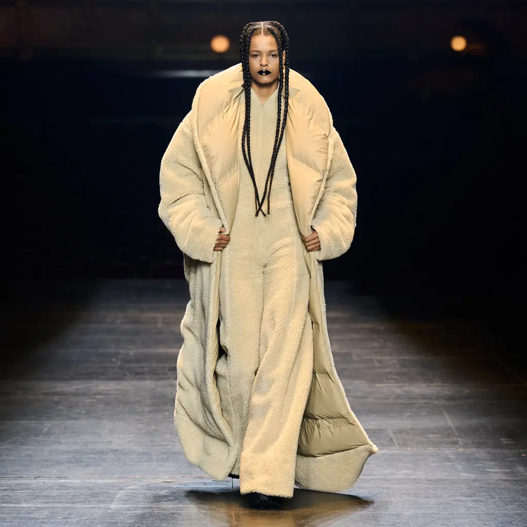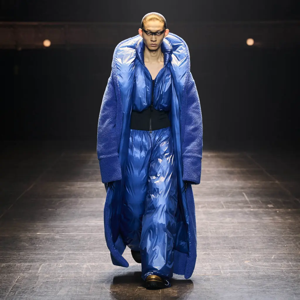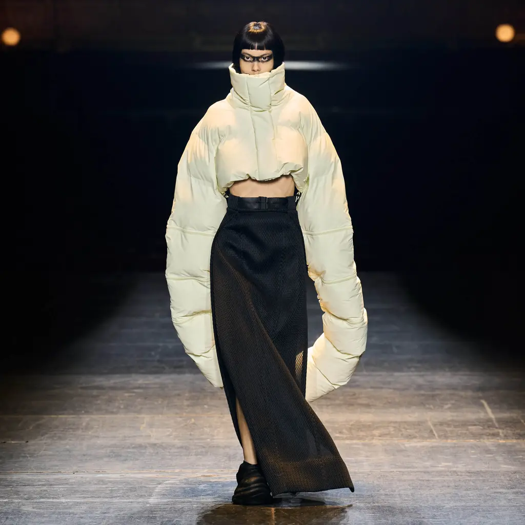 Because this was a proper step-up for the brand, whose first runway show took place at Copenhagen Fashion Week in 2020. Silhouettes were pushed to dramatic proportions and the sense of theatre was upped (quite literally) with floor-length puffer capes.