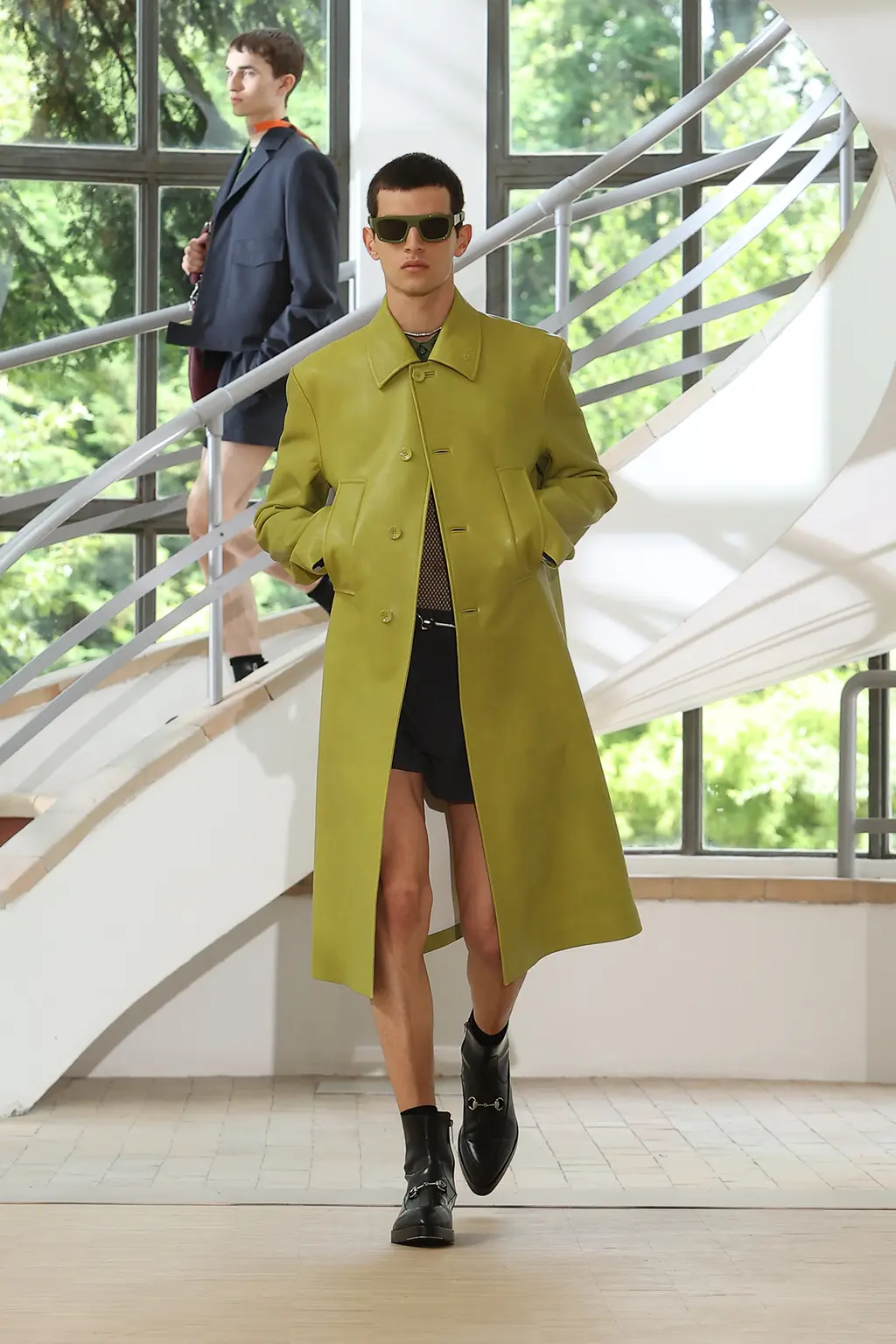 A scorching day and a Gucci show to close – what better way to end Milan’s menswear run? De Sarno injected some culture into the last show of the season as he brought the fashion circuit to the Triennale di Milano Art and Design Museum for his fashion-meets-surfer vision. A model in a pea-green calf-skimming jacket in the smoothest of leather, goggle-like sunglasses strapped around his neck, and board shorts kicked things into gear, shortly followed by an array of models wearing shirts – in palm, dolphin and hibiscus print, if you’re feeling particularly spirited – that came with matching shorts. Fringed jackets, sequin tops and hybrid loafer/boots with Gucci buckles kicked things up a notch. You can practically smell the saltwater.
