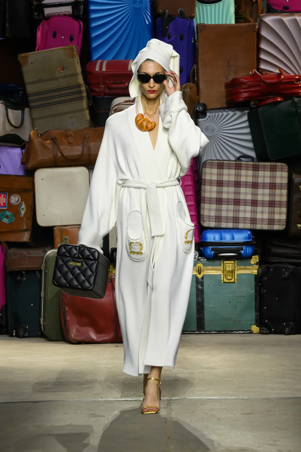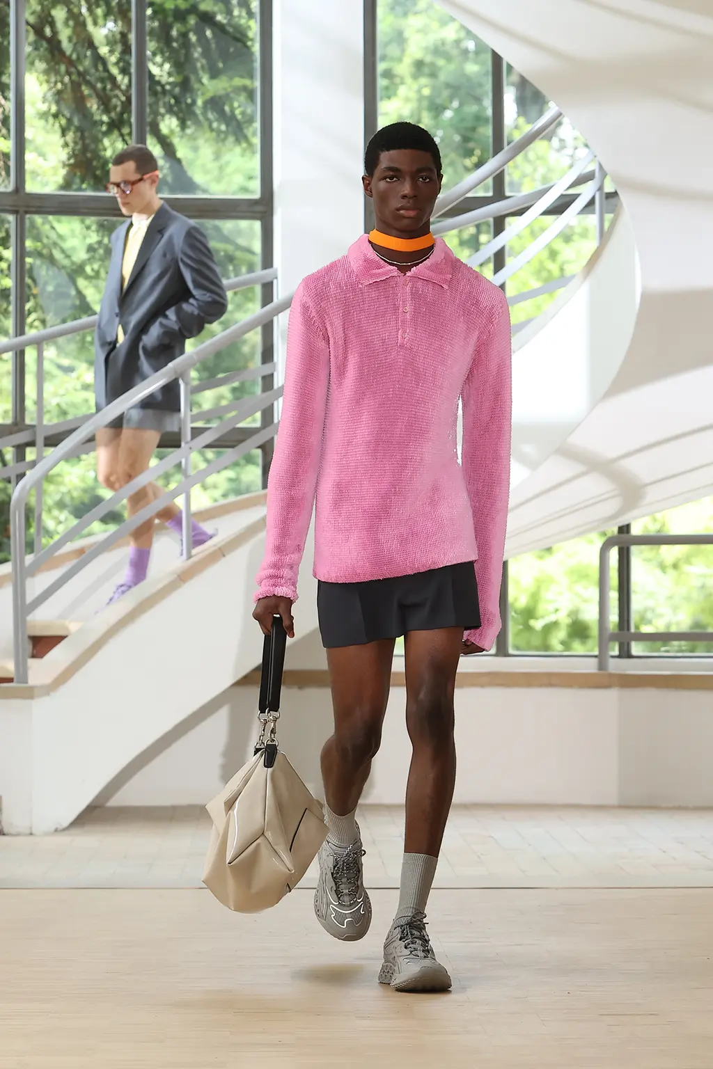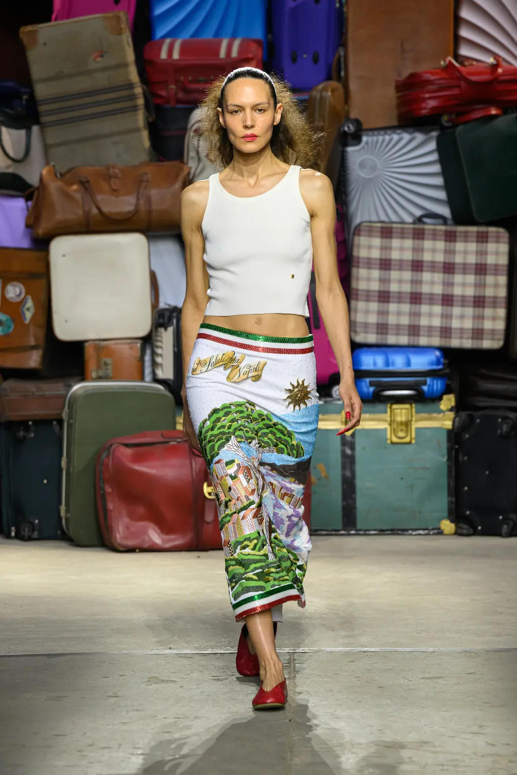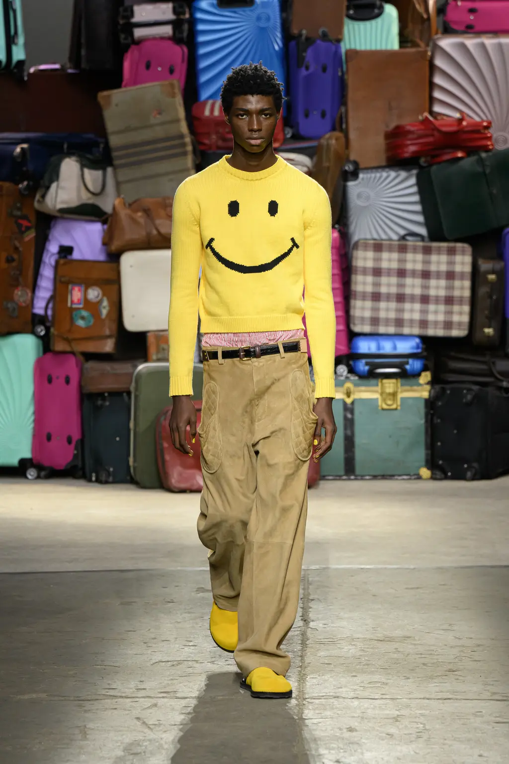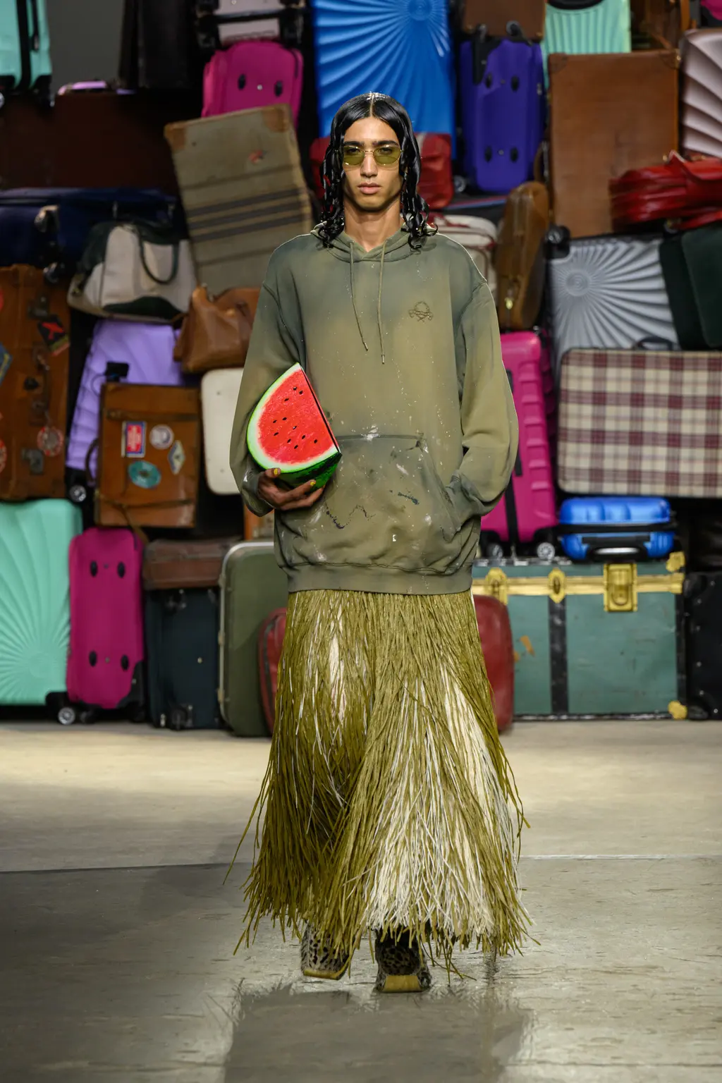 Adrian tapped into a world where each look represented a character of sorts. Taking a similar approach to his predecessor Jeremy Scott, who exited the Italian brand after 10 years in 2023, a tongue-in-cheek, OTT collection kicked off the first day of men’s shows: suitcases stacked on top of each other; pizza slices doubling as clutches; fried egg trouser sets and accessories reigning supreme. The magic, though, was in the tailoring: immaculate suiting engulfed in hand-written love notes, a deconstructed pinstripe tailored to sit on the side of the body and roomy linen separates.
