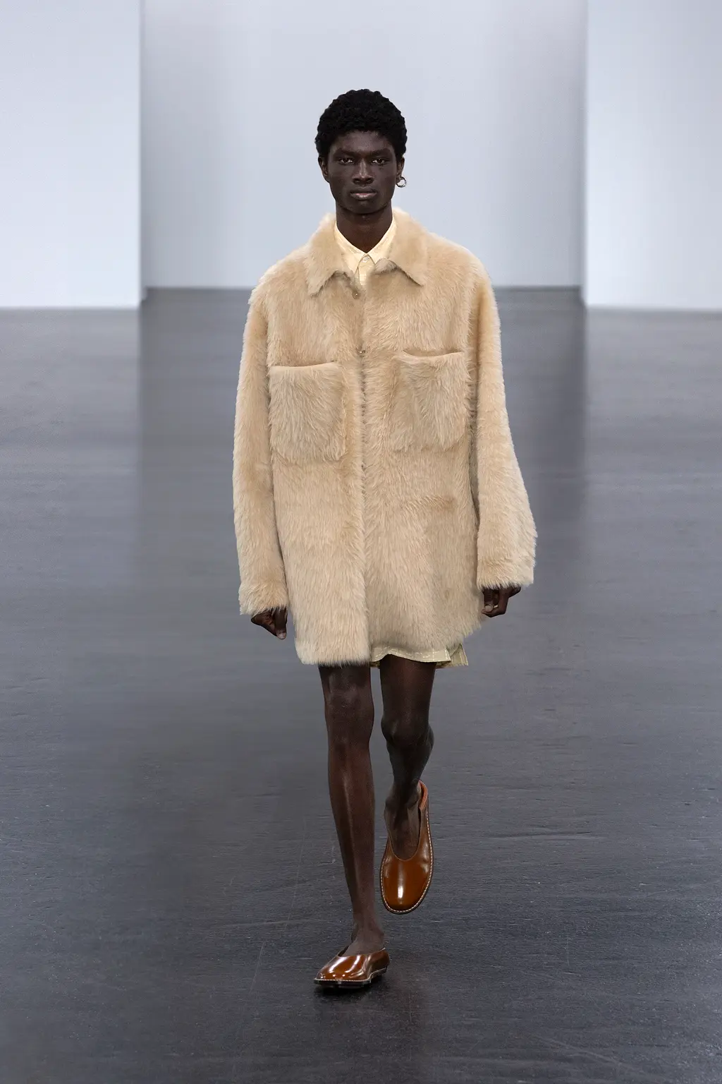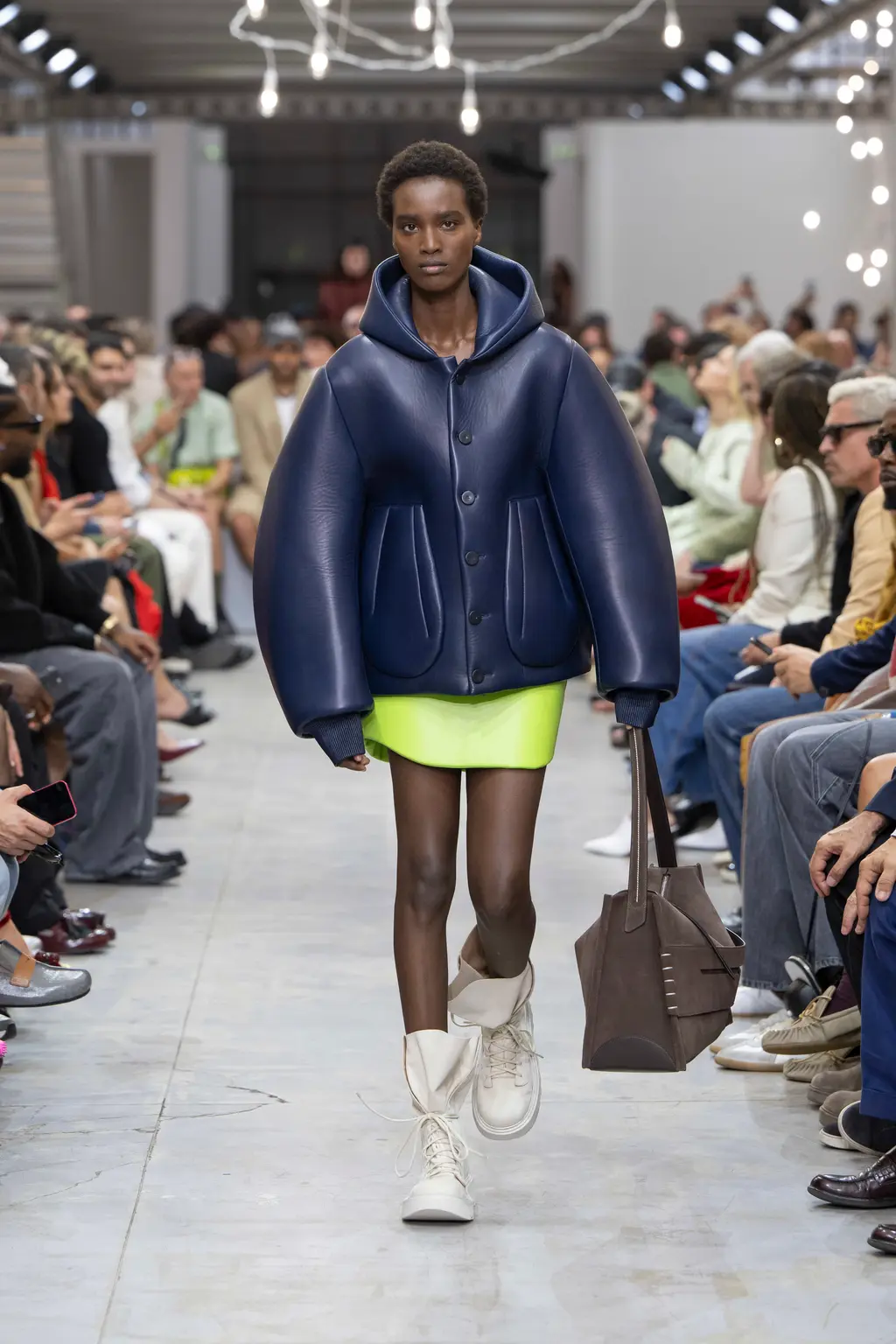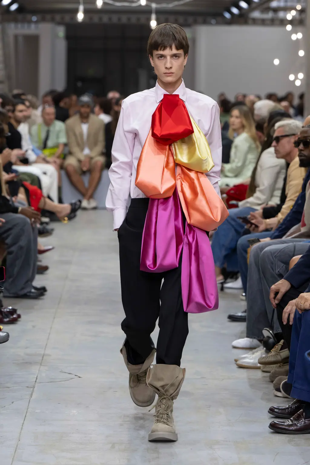 Jonathan Anderson’s “Real Sleep” collection closed the penultimate day of menswear shows. His concept for SS25 was plucked from the idea of off-the-wall clothing, which perfectly sums up the line. Rife with coed garments, outerwear was a sight to behold, as blown-up bomber jackets in soft, buttery navy and black shades emerged, followed by quilted jackets with combat boots and sizeable waffle-textured jackets. And the designer’s well-documented sense of humour made an appearance through joyous pussy-bow blouses with kaleidoscopic, exaggerated bows.