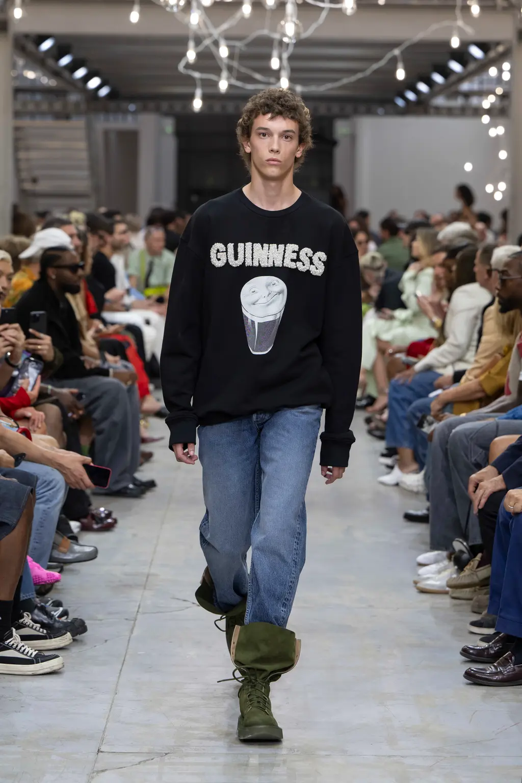 Anderson wasn’t done flexing his design muscles just yet, though, with more highlights including but not limited to: a belt acting as a semi-circle fabric rack, a cardigan illustrating a house with a bird perched on the right shoulder, a floor-skimming black dress with a shortened hemline, and the revelation of a collaborative capsule line with iconic brewery Guinness.