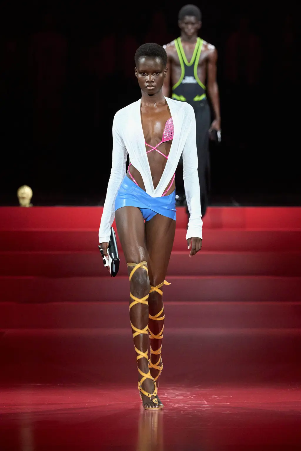 Erotically charged – and the clothes weren’t bad either. You could practically see the steam filling up the legendary Teatro Lirico theatre last night. A dimming red light – perhaps a nod to the red light district – brought the room to a standstill as a group of muscly dancers in translucent second-skin vests and black cargo trousers seduced the audience from the confines of cages, before breaking free and running amok onstage. Grinding on the floor and humping the air, they prepared the audience for the equally sensual, lip bite-inducing collection. Oscillating between sheer, delicate fabrics and leather lace-ups and barely-there tops, there was something for everyone. First to hit the stage was a model in a cropped black top layered under a sheer dress, with strappy heels boasting tie-up details snaking up to the upper thigh.