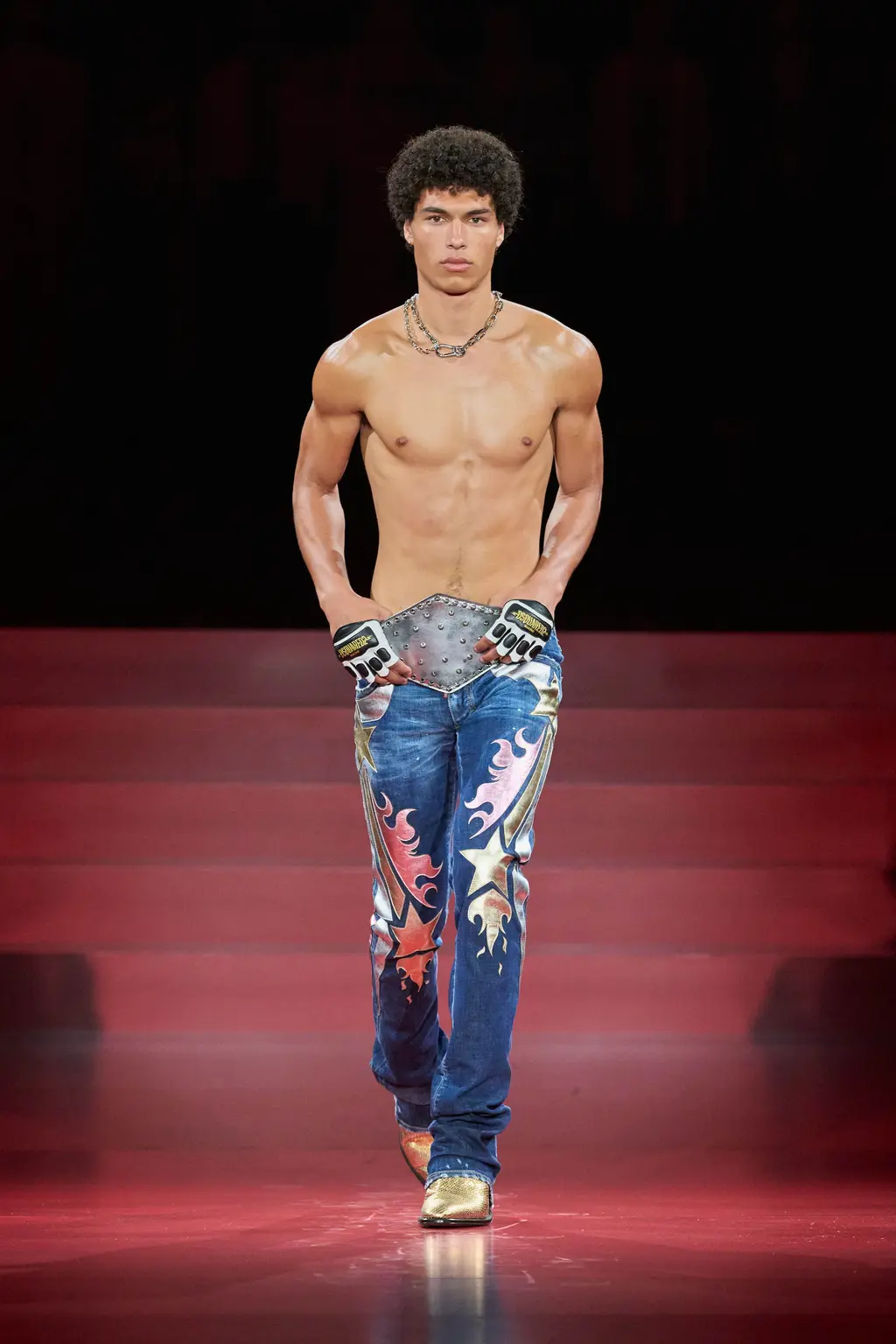 What came next was a rotation of models in bumsters, itsy-bitsy lace-up leather shorts, glossed vest tops with low-slung trousers comprising exposed zips, slices of flesh peeking out through fitted trousers and ample wrestling references. Sexy! As the show was heading to a close, a topless model strutted out in skin-tight jeans with a replica wrestling belt attached to the front, alongside gloves and gold Western-inspired boots. What more could you ask for on a Friday night?