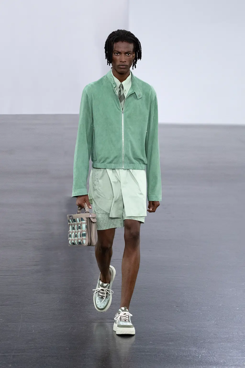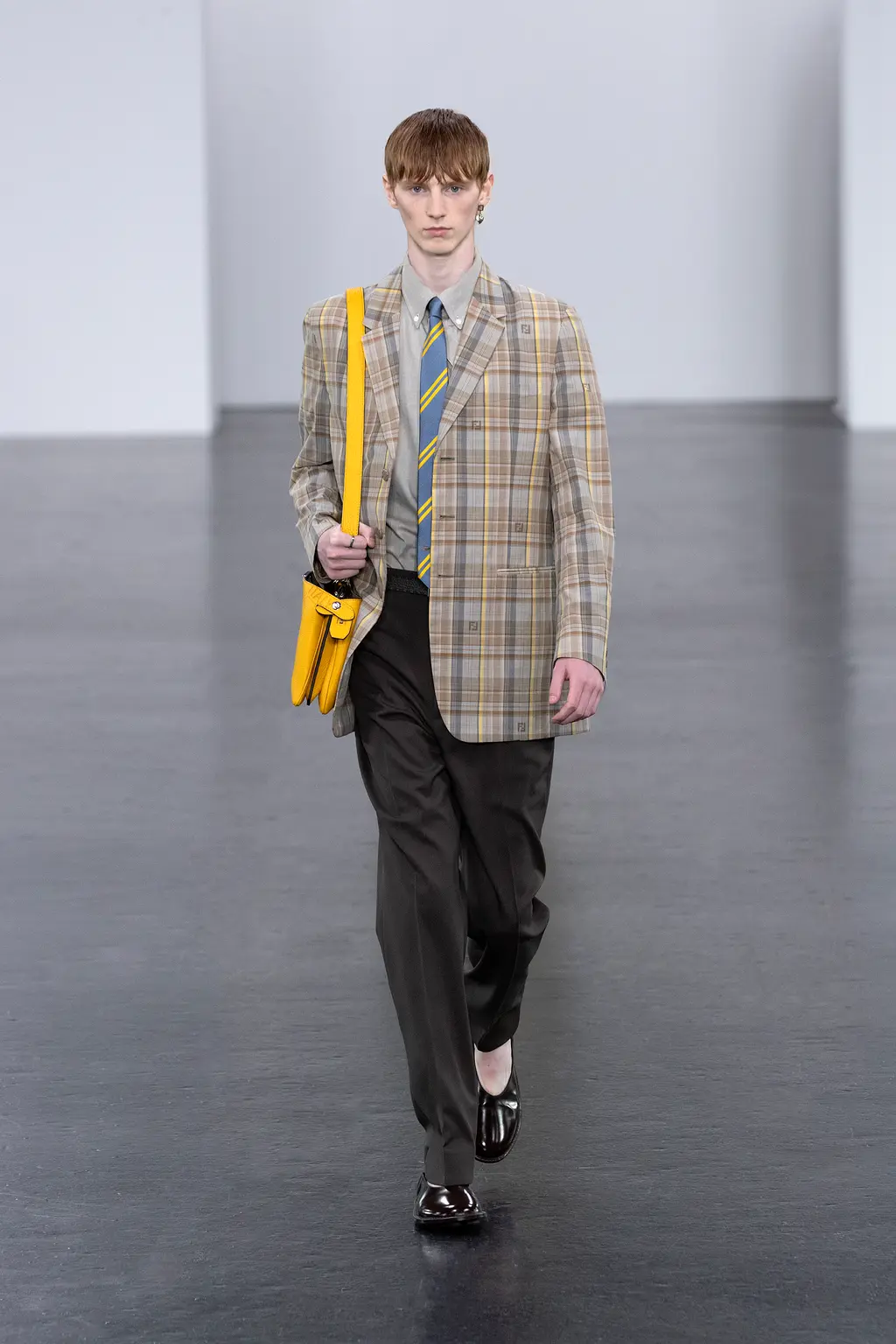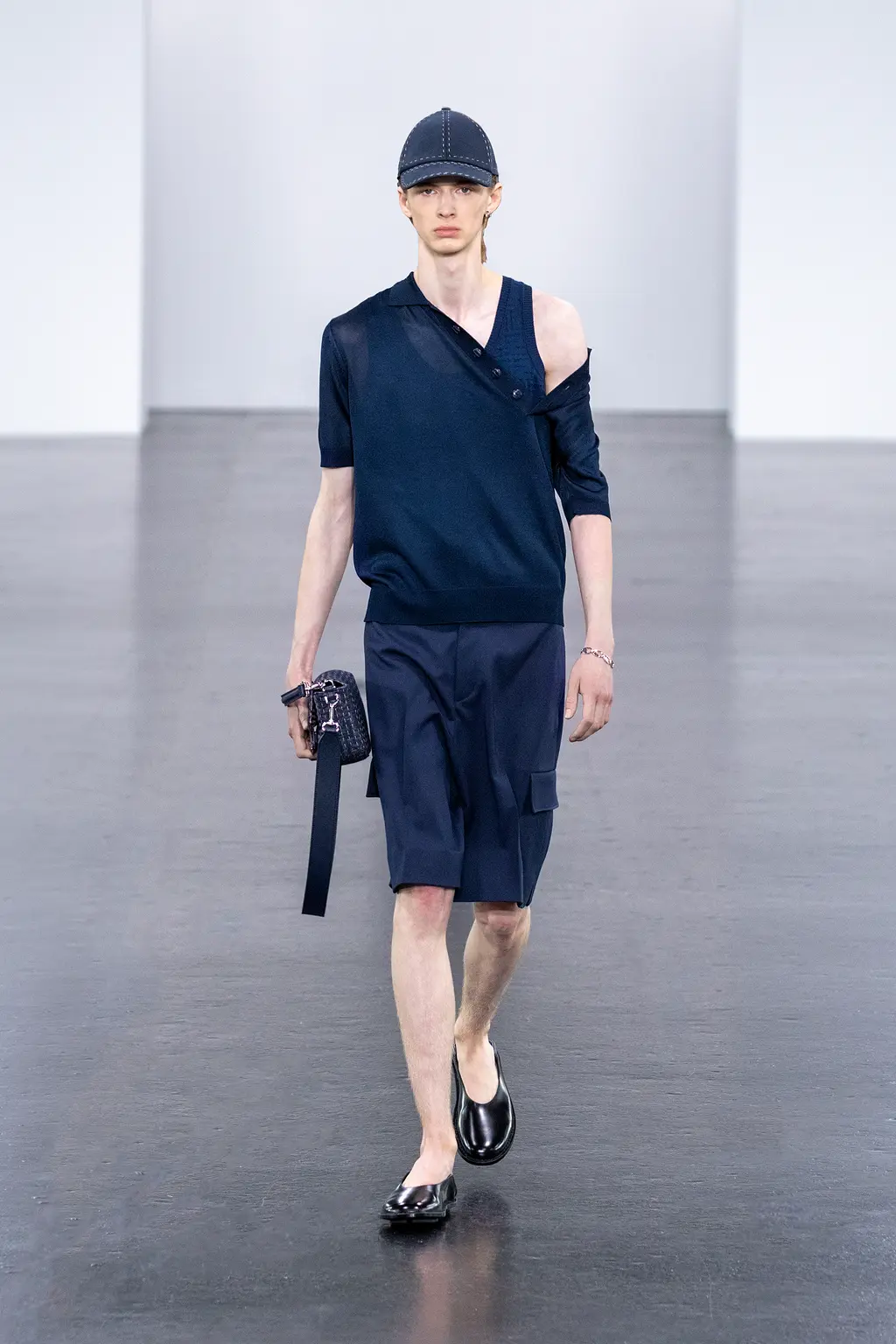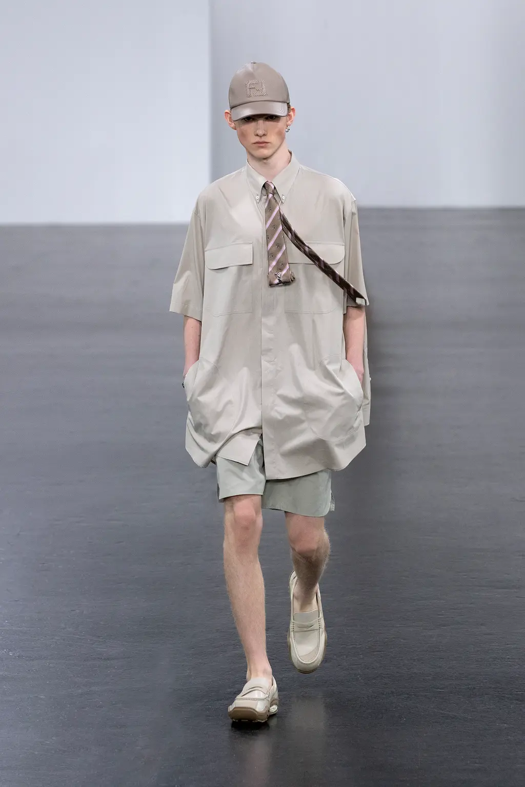 And boy, did Silvia deliver. Four mirrored columns rotating every which way jump-started the show, unveiling a new uniform for the schoolboy-meets-dapper gentleman. Instrumental to the collection were ribbed knits that doubled as shirts, blazers hacked off at the cuff and asymmetric henley tops with a sliver of a vest peeking through. Check ties brought Silvia’s studious-minded SS25 line together, and Fendi even tapped into the Euros hysteria via a football-style top with the logo across the front. The “F” Fendi caps atop models’ heads will no doubt fly off the shelves when they drop.