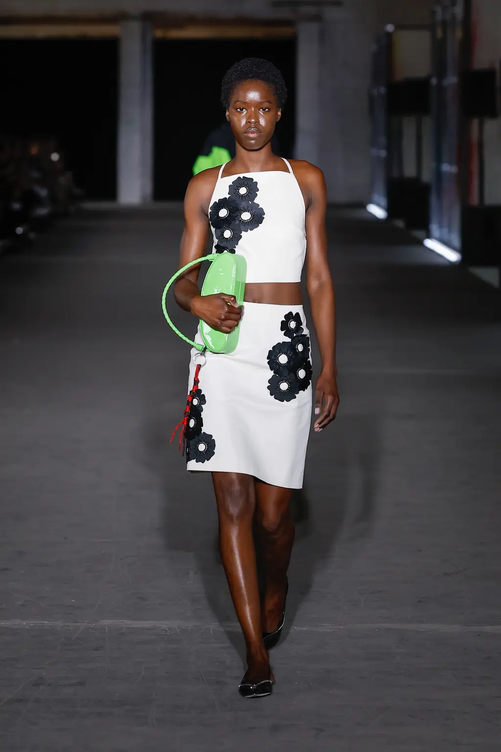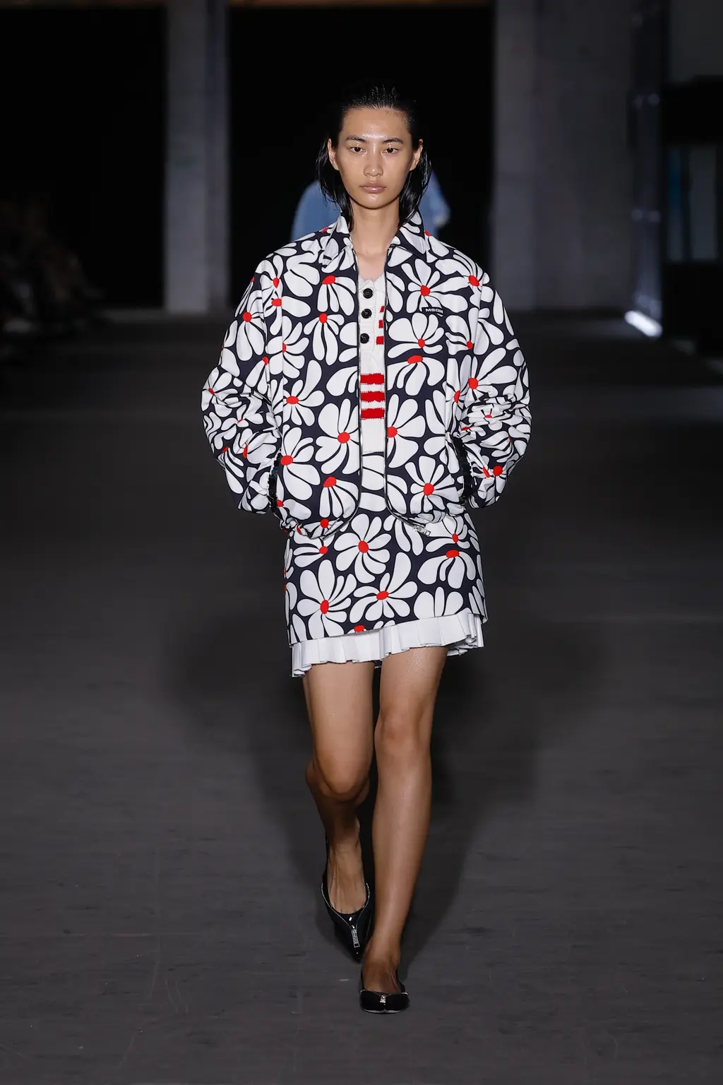 MSGM knows how to commit to a theme. Taking the audience under the sea, the SS25 through-line was marine life, as silhouettes were dominated by polished lines, vertical stripes and origami hats mimicking sailor hats. Serving as a backdrop were several individual transparent blocks with a blank white canvas, and as models made their way down the catwalk, a collective of artists in white coats aimed blue, yellow and pink paintballs at the boards. A Soulwax mix of MGMT’s Kids blasting through the speakers was apt for a collection rife with childlike reverie. Creative director Massimo Giorgetti focused on sun-drenched designs in the shape of laser-cut dresses, glossy trench coats and platform trainers, including an exclusive New Balance collaboration.