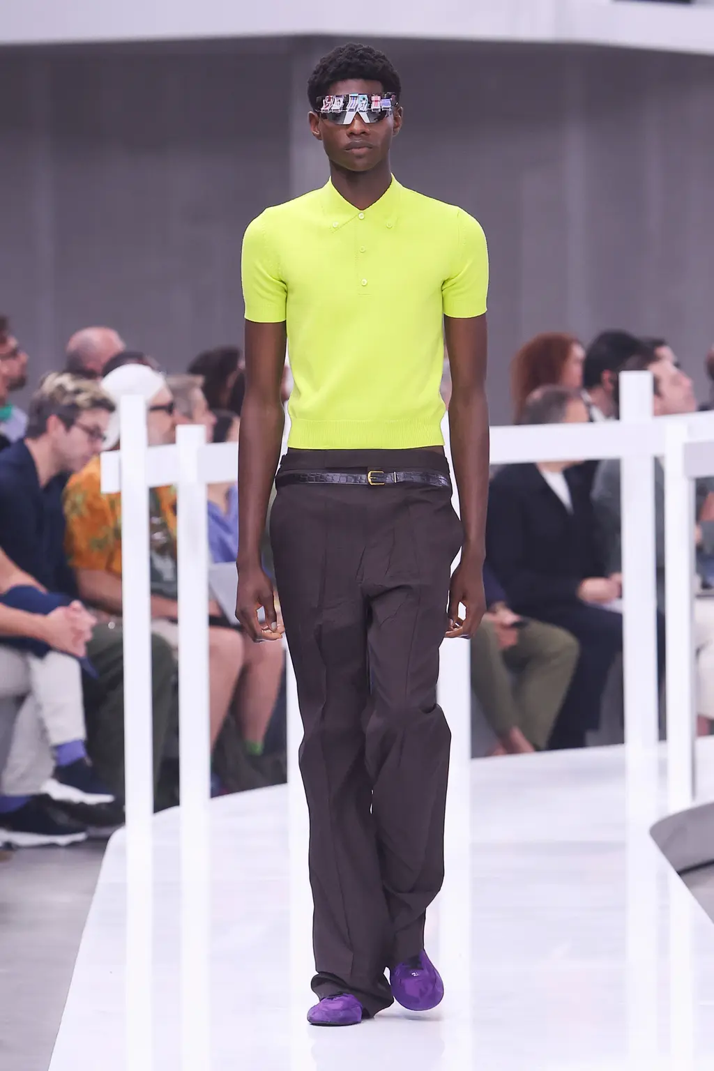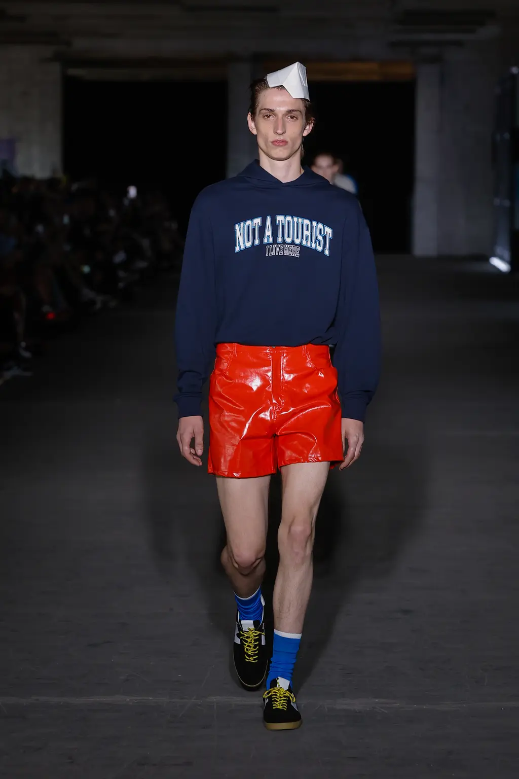 Crinkled suit jackets and matching trousers stole the show, alongside a carmine red jumper with a blue built-in collar. New footwear silhouettes were introduced, combining a trainer with a backless slipper and, for those who’d rather not have their dogs out, silver steel-top iterations were on offer, too. Ingenious printed belts affixed to lightweight trousers accompanied much of the knitwear and boxy leather jackets, while surprises came in the form of striking boilersuits. Screenprinted images of people partying, lounging in water and idyllic landscapes adorned visors.