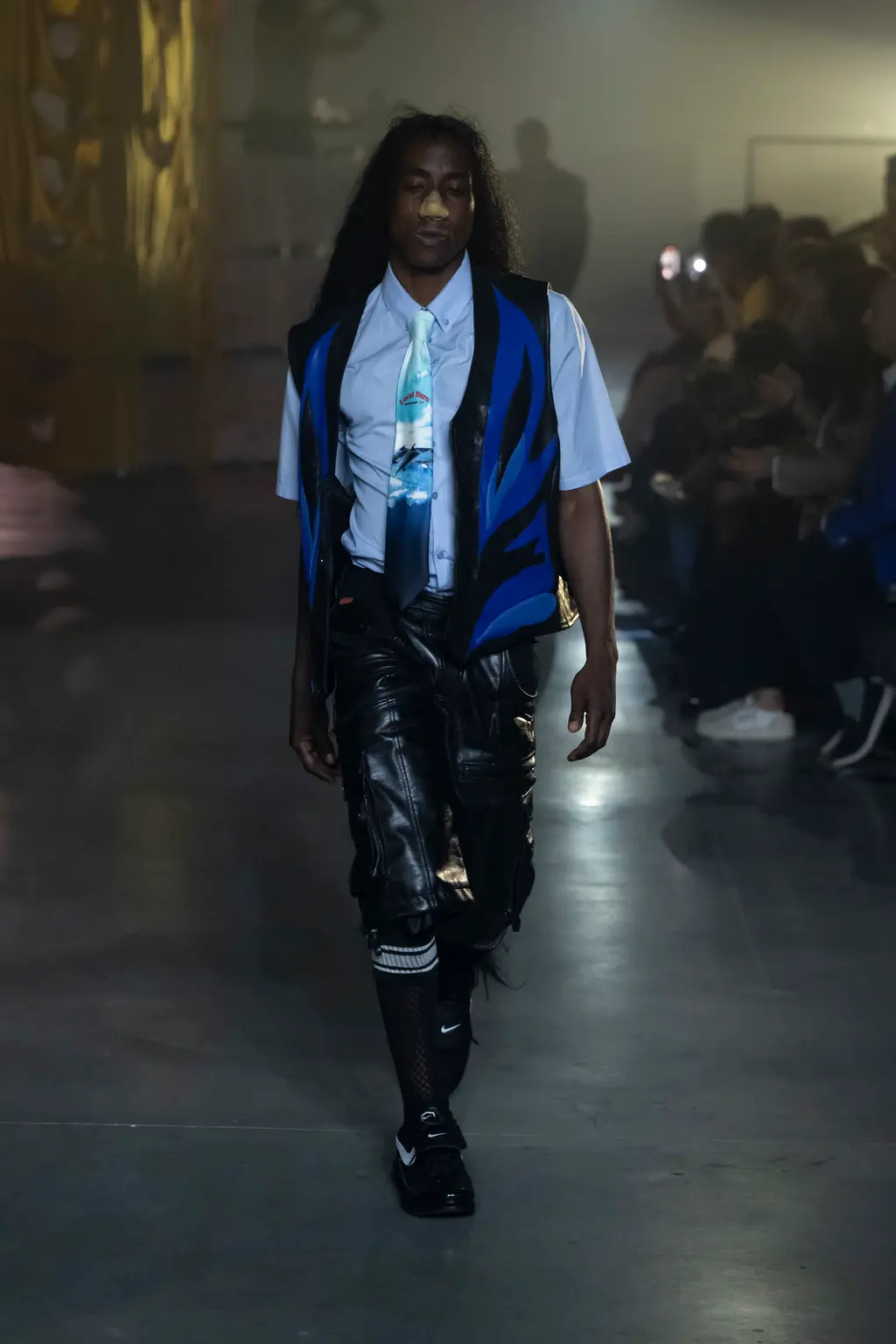 Unsurprisingly, the ever-unpredictable designer kept the fashion circuit on their toes. As guests walked in, they were surrounded by an array of flyers with archive and never-before-seen Martine Rose looks on the ground. Scraps of material hung from the ceiling, as attendees such as Kaytranada watched models stomp around the space in prosthetic fake noses, matted, lengthy wigs and long, bejewelled talons.