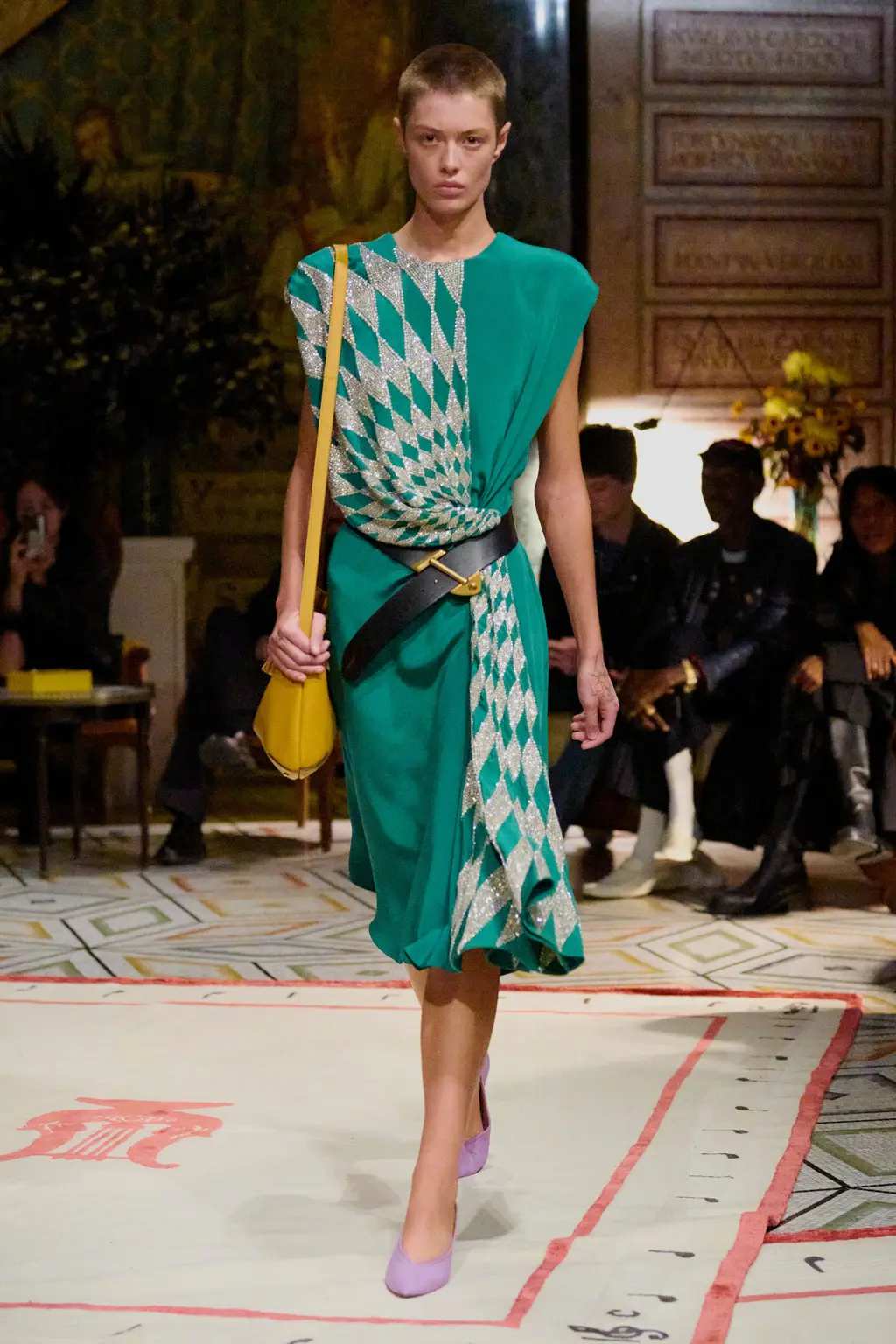 At the Ferrari show, supers Anok Yai, Iman Hammam and Amelia Gray hit the fast lane, wearing searing red dresses and bejewelled get-ups against a stark-white backdrop. Ending proceedings with a bang, a garage shutter lifted to reveal a line-up of models wearing white slouchy jumpers, suiting and belted trenches. At Moschino, creative director Adrian Appiolaza amped up everyday objects such as trench coats loaded with scraps of material or floral applique dresses and paired them with playful accessories – think bags that replicated cooking pots, flower bouquets and “Moschino” branded bags overspilling with garments.