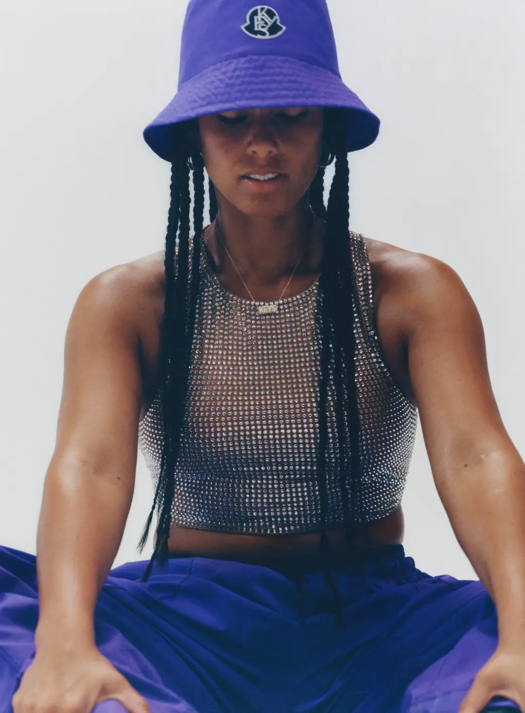 The coolest bit? The collection’s cosmic, glittering pieces. A shimmering silver is applied to the Tribeca Parka Coat, Flatbrush Windbreaker and matching Metallic-Effect Pants while the Black Crystal Crop Top, the most opulent item in the collection, encrusts a lycra tank with chatoyant gemstones.