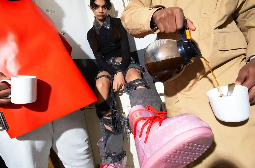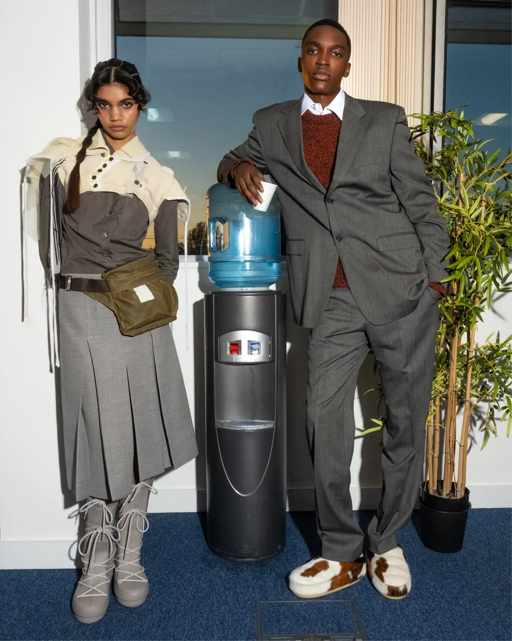 Destiny wears coat MAISON MARGIELA, top and trousers stylist’s own, bag MARTINE ROSE and shoes MOON BOOT (background). Bayu wears T-shirt FREDDY