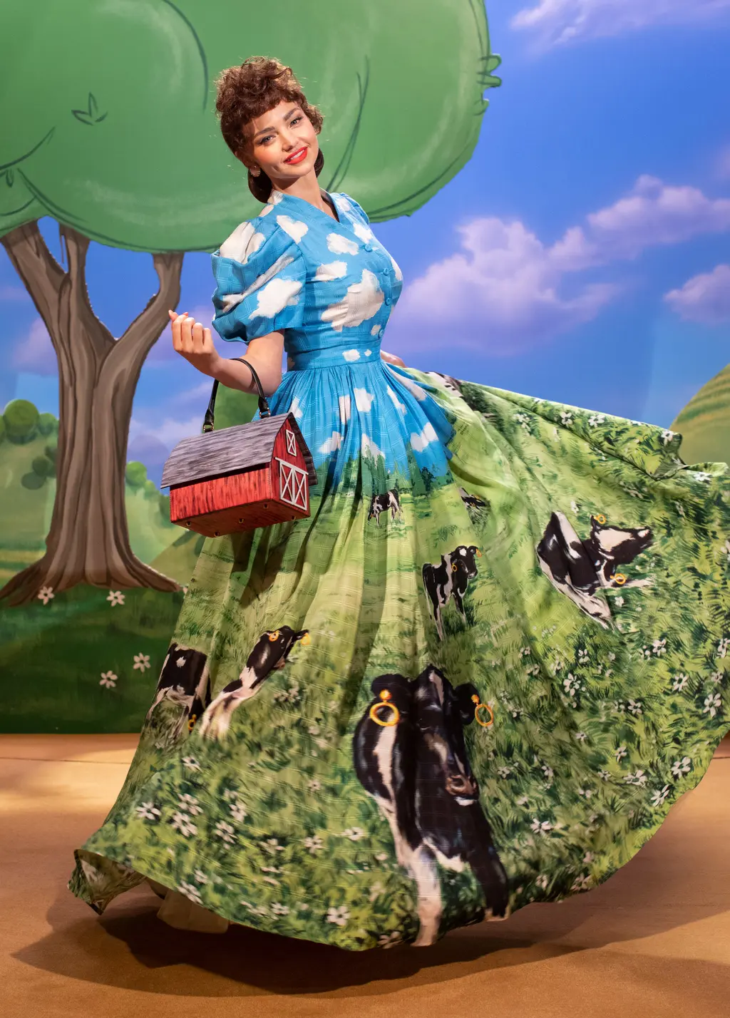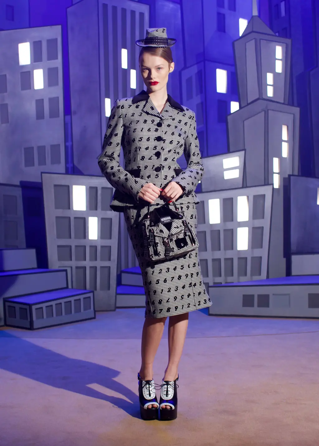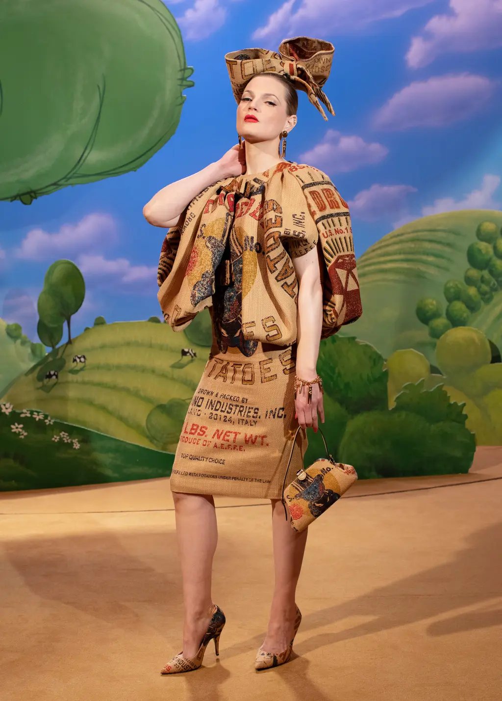 Then it’s off to the farm, with potato sacks elevated into glittering suits and cocktail dresses, mini-bags and headwear, nonchalantly bearing the remainders of their original form: “potatoes”, emblazoned across the midsection. And the Francoisms return, with Moschino’s archival clouds and cows printed onto a flowing tea dress à la Julie Andrews, and a three-piece ensemble complete with a teeny-tiny bag.