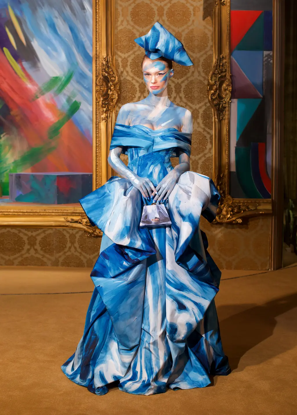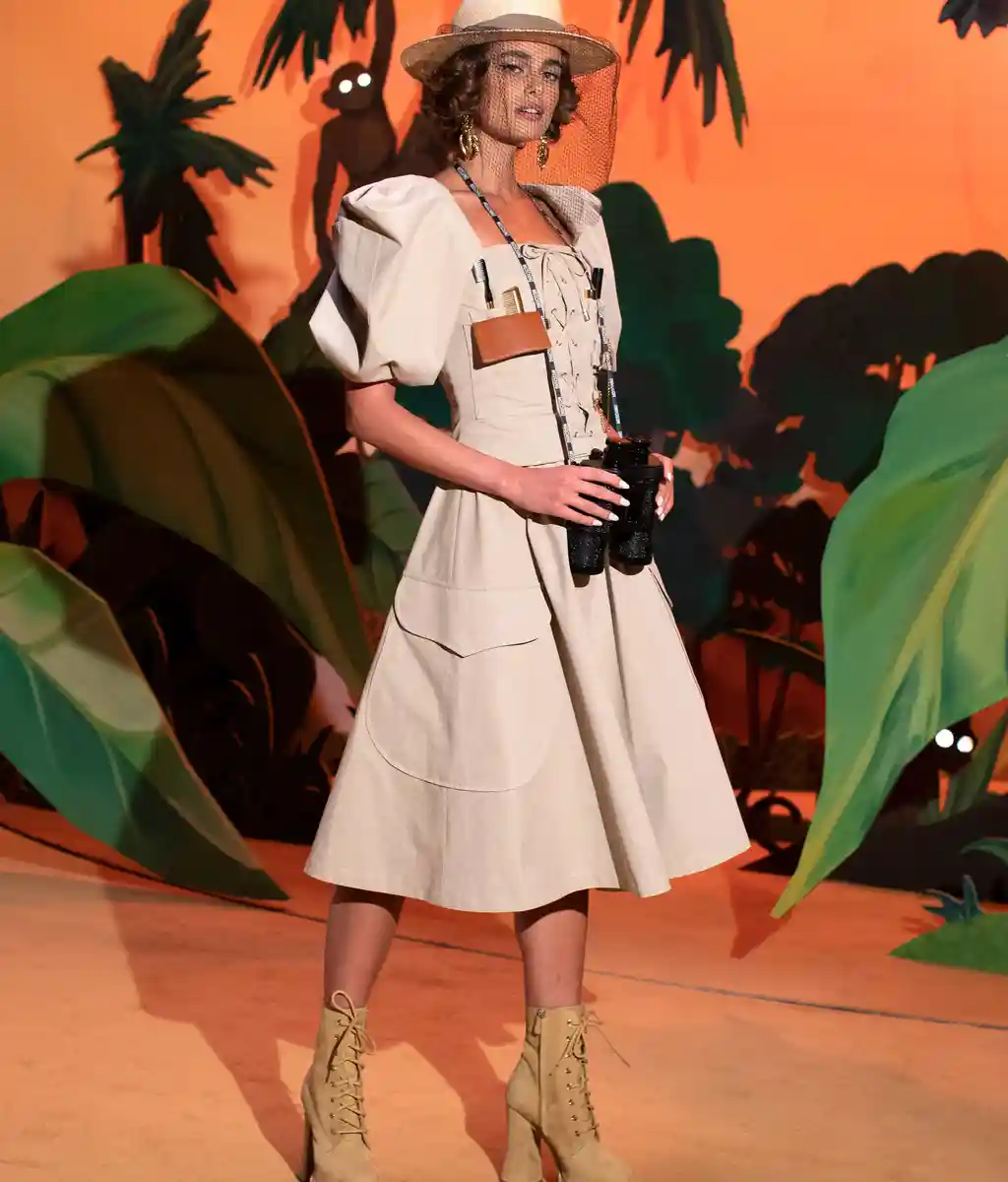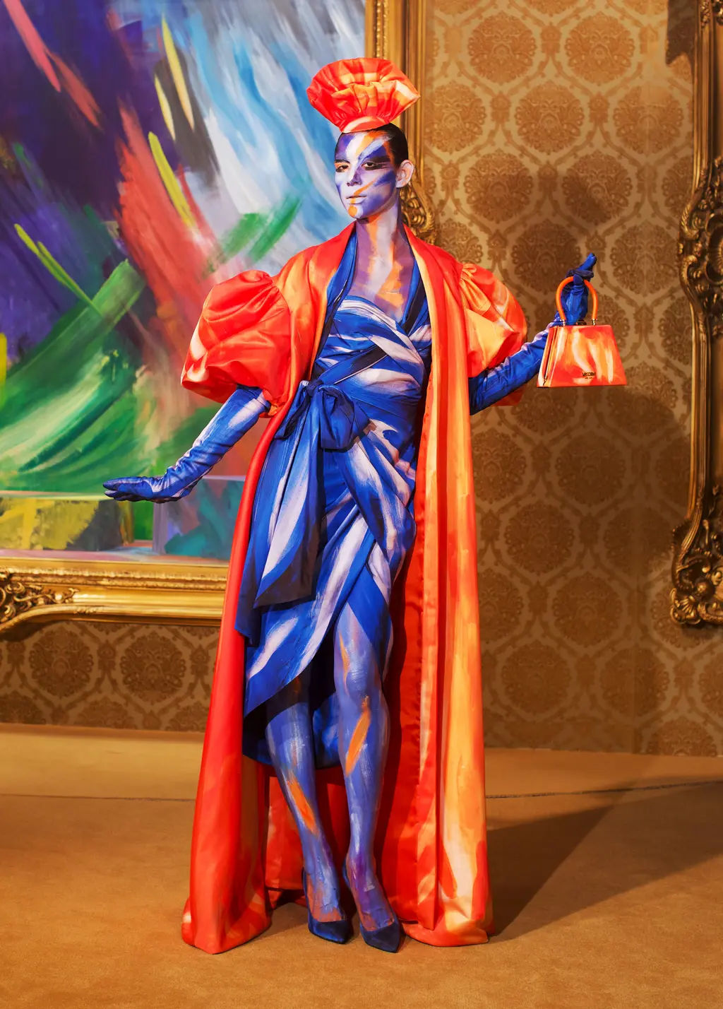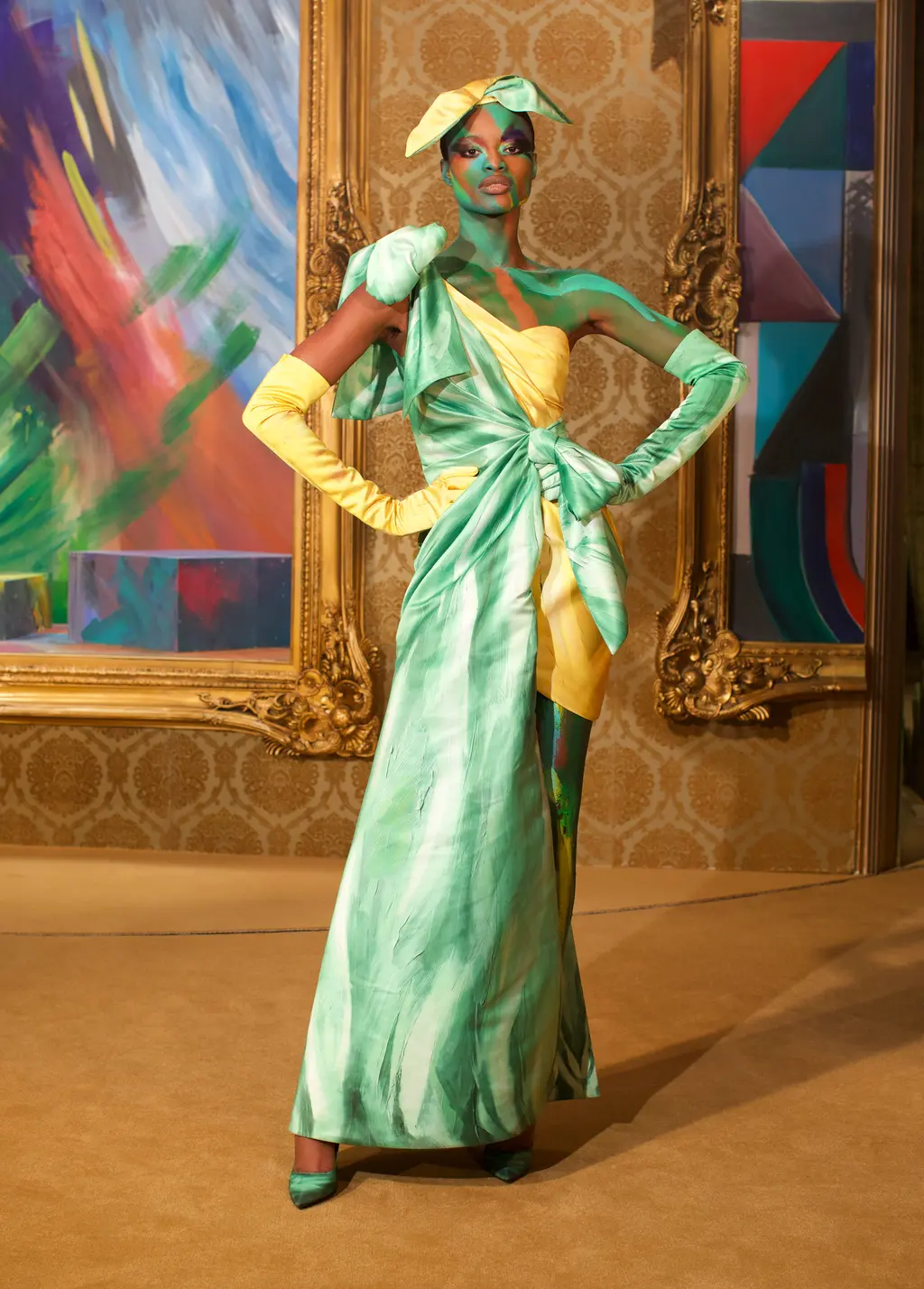 But a day in the life of Scott’s Moschino woman doesn’t end there. He presents a selection of evening gowns rendered in an expressionistic style, painted with brushstrokes as though to emulate a canvas. A “shopping safari” is the next pitstop, with zebra, cheetah and giraffe prints accompanying flamingo motifs on skirt suits, structured mini-dresses and thigh-high boots. Then comes Scott’s grand finale: a night at the opera, where the likes of Winnie Harlow, Precious Lee and Dita von Teese slip into full length satin gloves, sweetheart busts and shimmering gold gowns.
