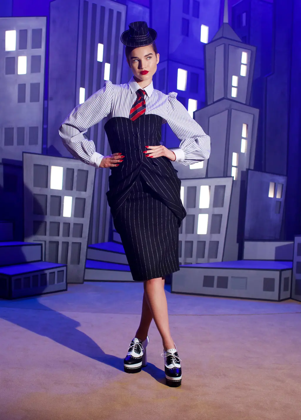 Steeped in old Hollywood, the collection and accompanying film, Jungle Red – a name taken from an infamous nail bar scene in The Women – takes the Moschino woman through the “different possibilities they would have in their daily life”, as the show opens with a Wall Street-inspired take on businesswear. It was Scott’s intention to flip the gender roles for the women who would not have been allowed to work in these sectors during late ’30s America. And so he subverts a traditional suit jacket, cutting out the bustier and leaving the top as a bolero. Traditional crisp white shirts and ties are worn underneath, but humorously blown up in proportion – a nod to Franco Moschino’s archive by turning a jacket upside down so the sleeves become a bustle. Throughout, prints of numbers and dollar signs appear on the fabric, which could be a reference to the western recession or an irreverent nod to the busy, money-making businesswoman in Scott’s Moschino fantasy.