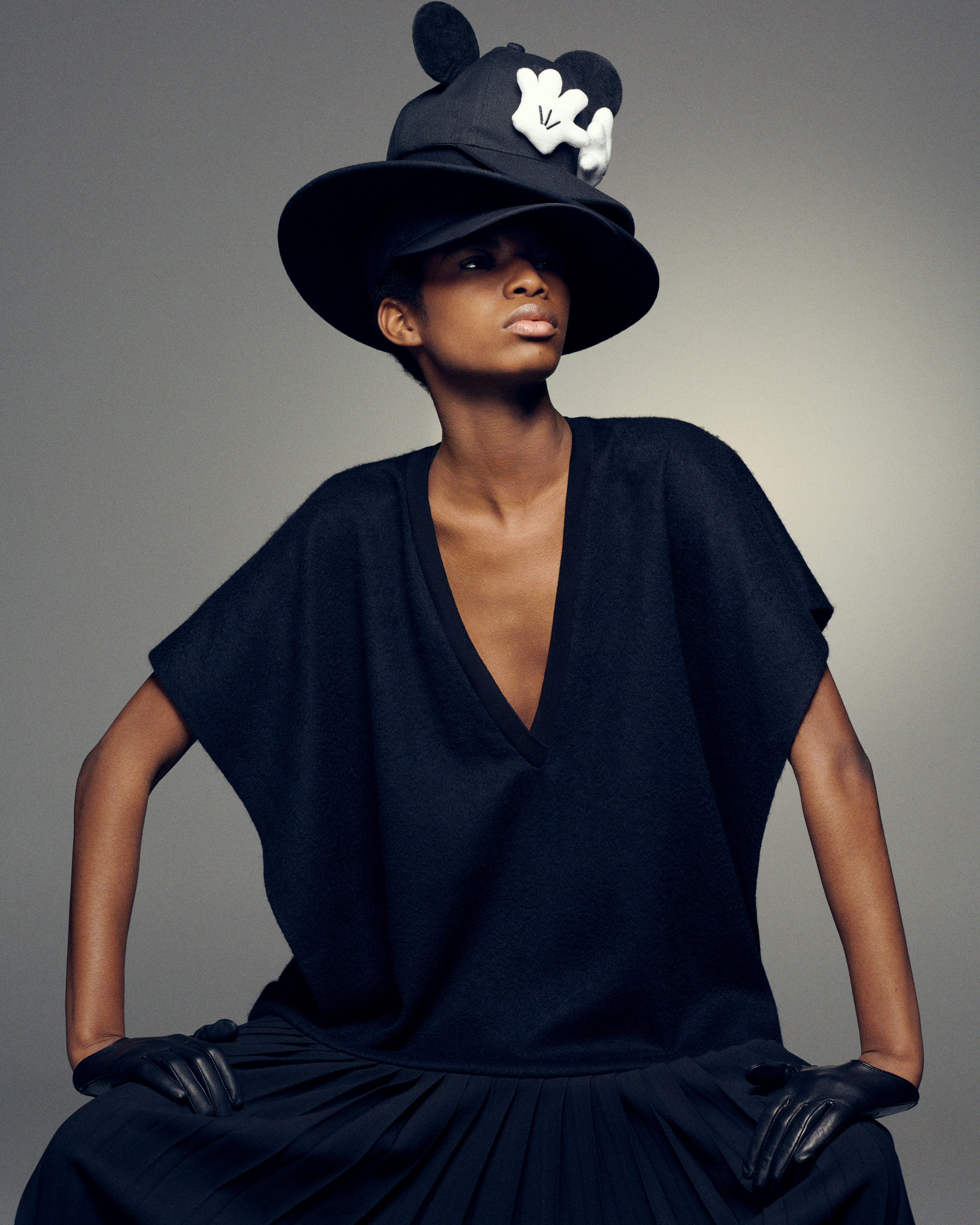 George wears dress HERMÈS, hat NOEL STEWART, gloves PAULA ROWAN and tassels stylist’s own