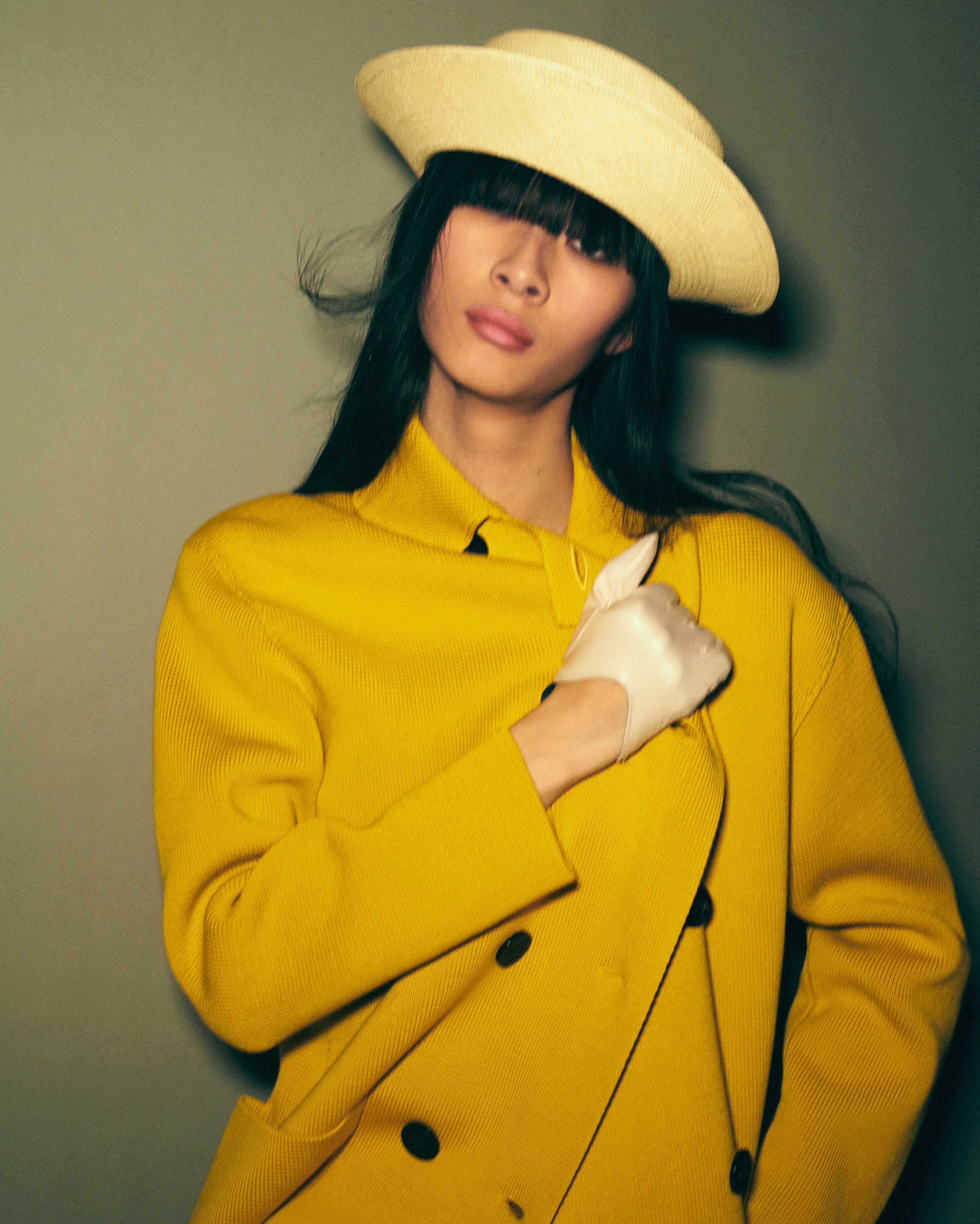 Cathy wears jacket LORO PIANA, hat CELINE and glove PAULA ROWAN