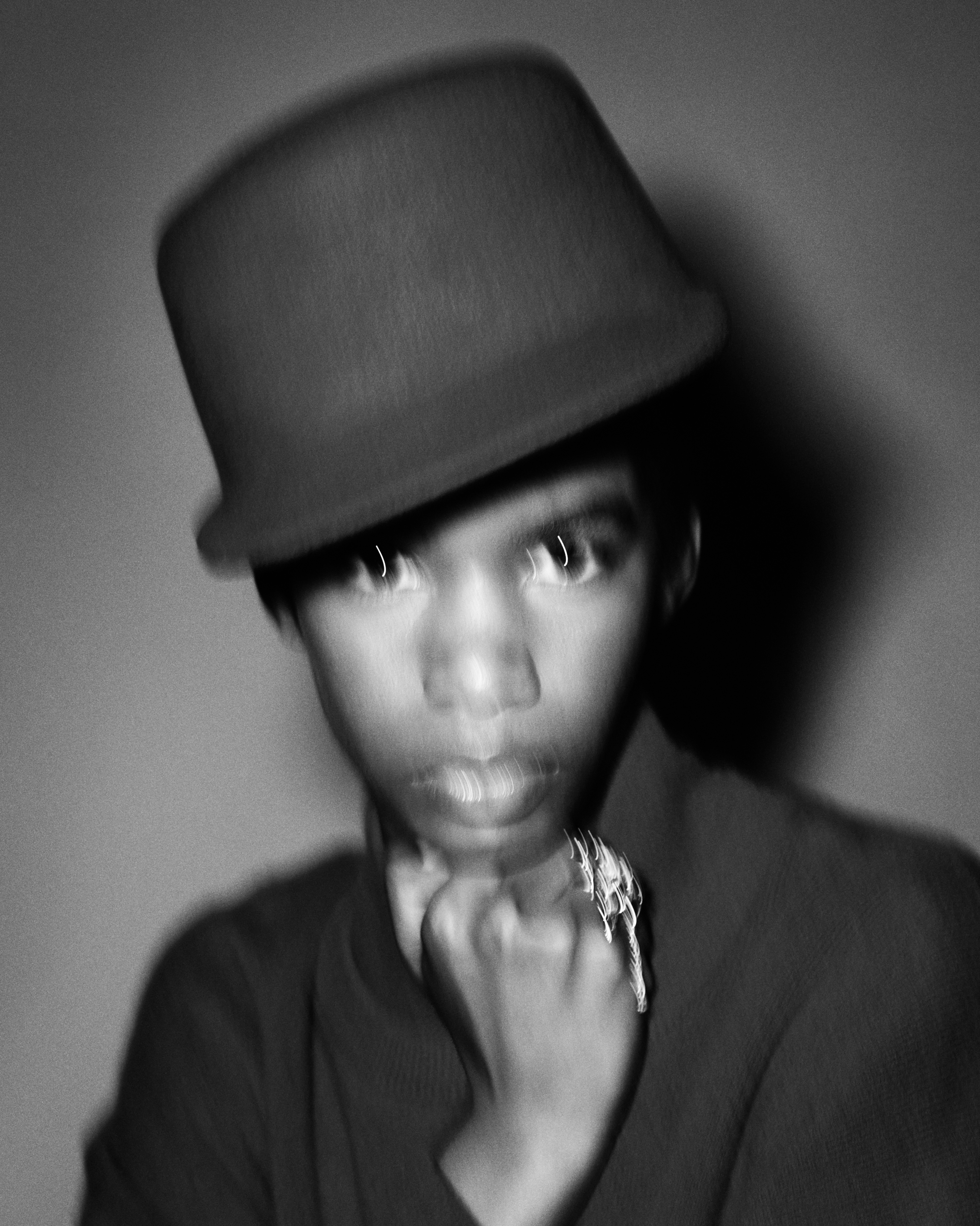Yuliana wears poncho BLESS, hat (top) courtesy of YUURA, hat (middle) NOEL STEWART, hat (bottom) stylist’s own and gloves PAULA ROWAN