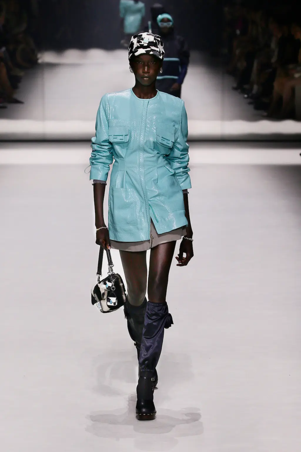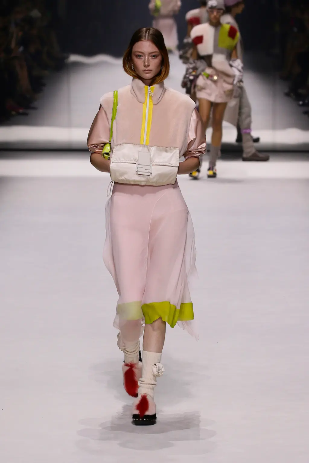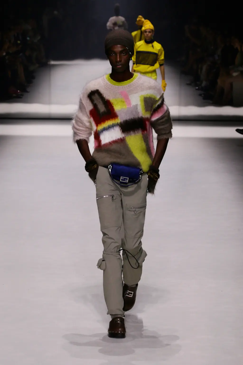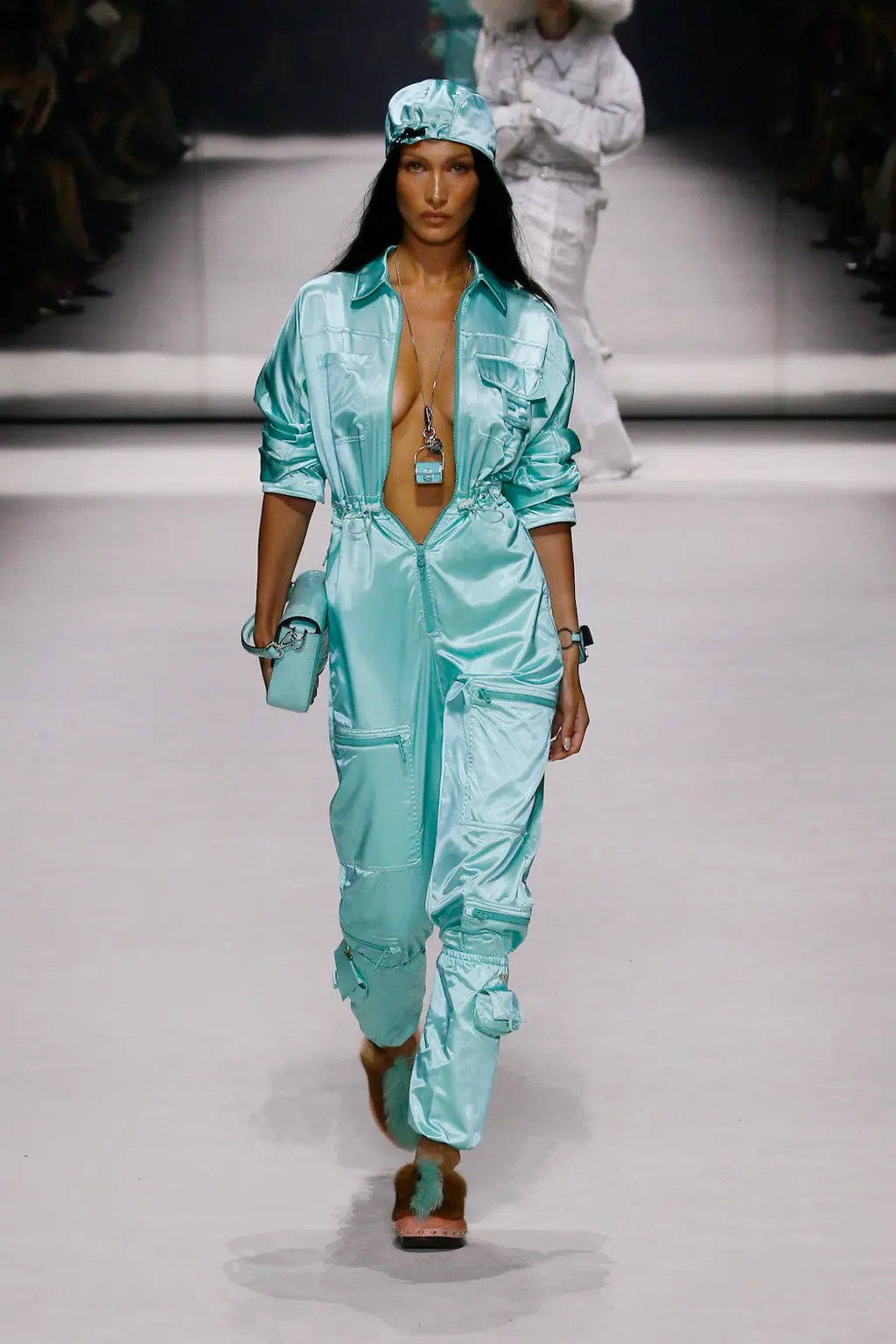 With current artistic director Kim Jones joining forces with New York figures Marc Jacobs, Tiffany & Co. and Sarah Jessica Parker (“it’s not a bag, it’s a Baguette”), Fendi sent various iterations down the runway. There were ones coated with degradé sequins, lilac, baby pink, blood red, either swung defiantly from the hand, around the waist as a bumbag or, as it was originally intended, hands-free under the arm.