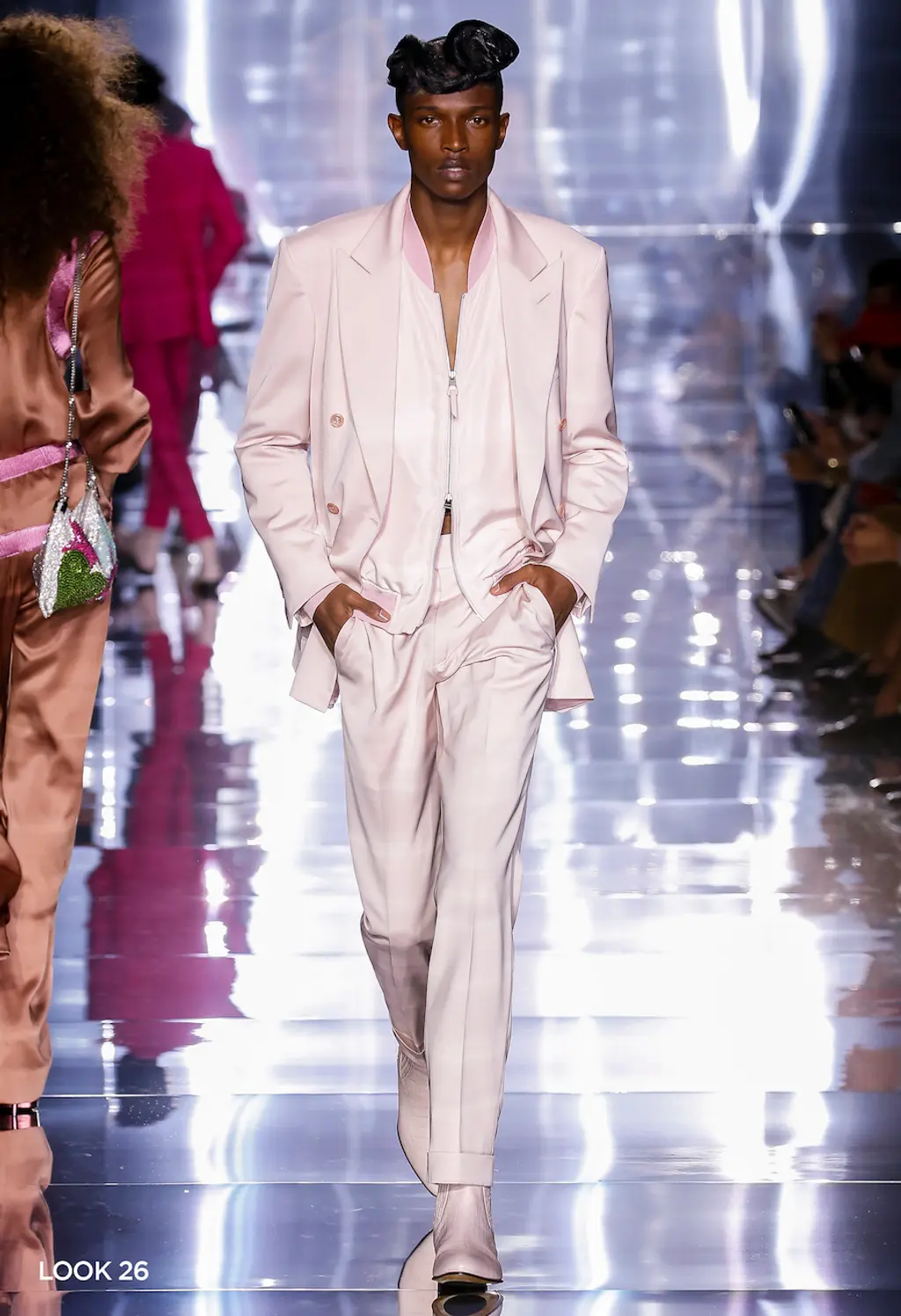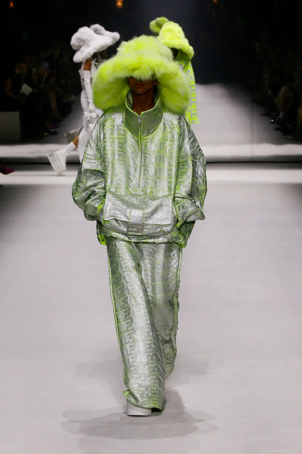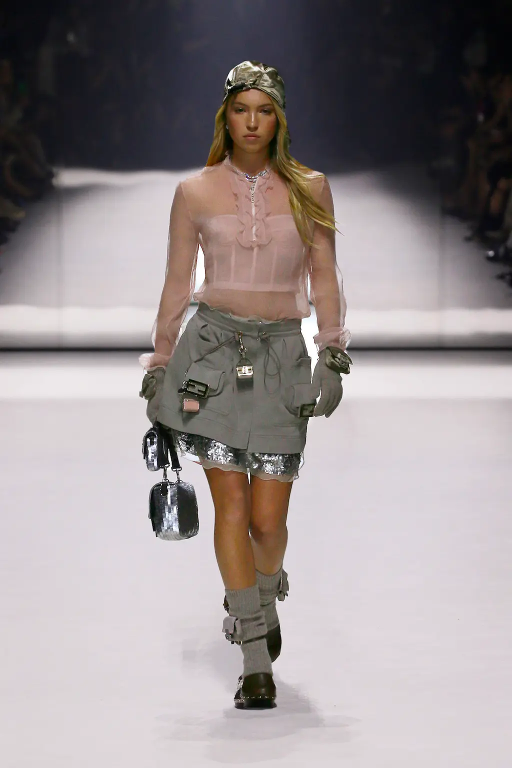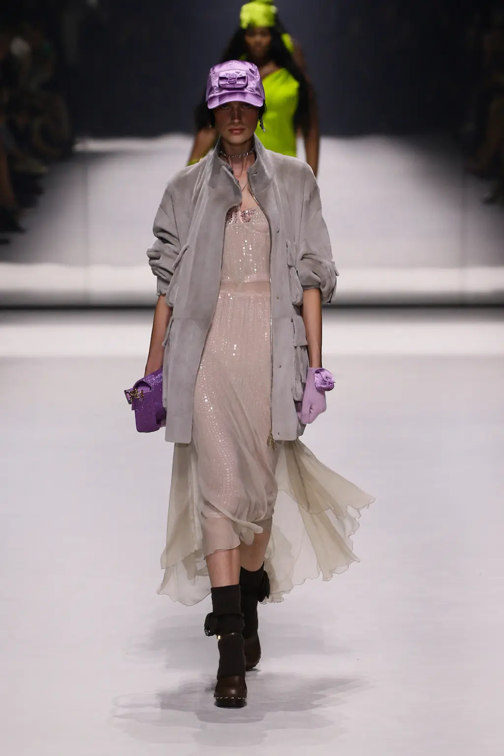 With current artistic director Kim Jones joining forces with New York figures Marc Jacobs, Tiffany & Co. and Sarah Jessica Parker (“it’s not a bag, it’s a Baguette”), Fendi sent various iterations down the runway. There were ones coated with degradé sequins, lilac, baby pink, blood red, either swung defiantly from the hand, around the waist as a bumbag or, as it was originally intended, hands-free under the arm.