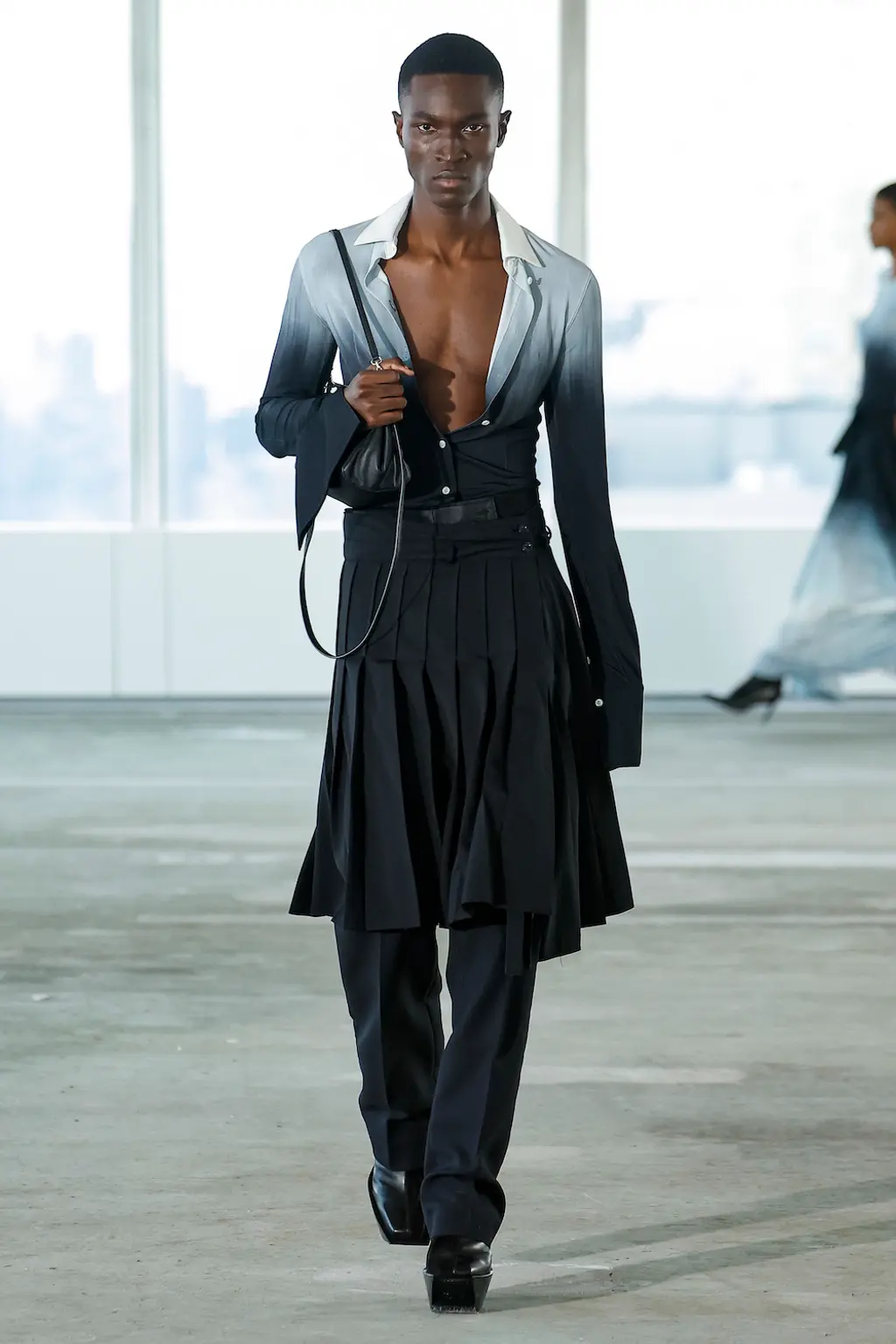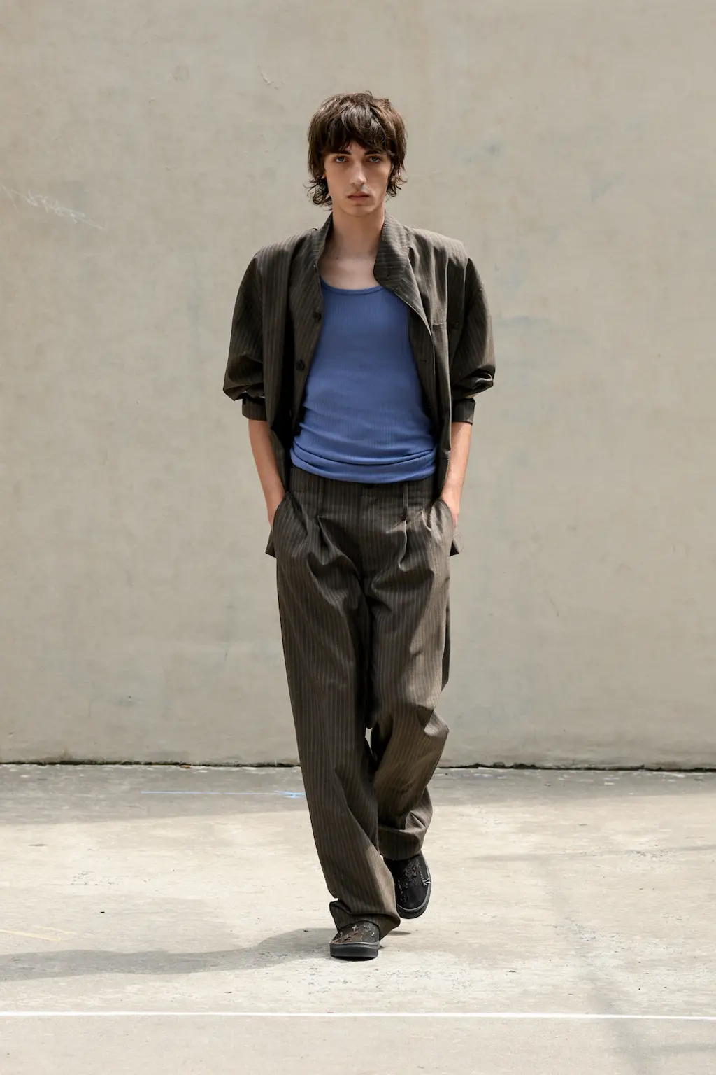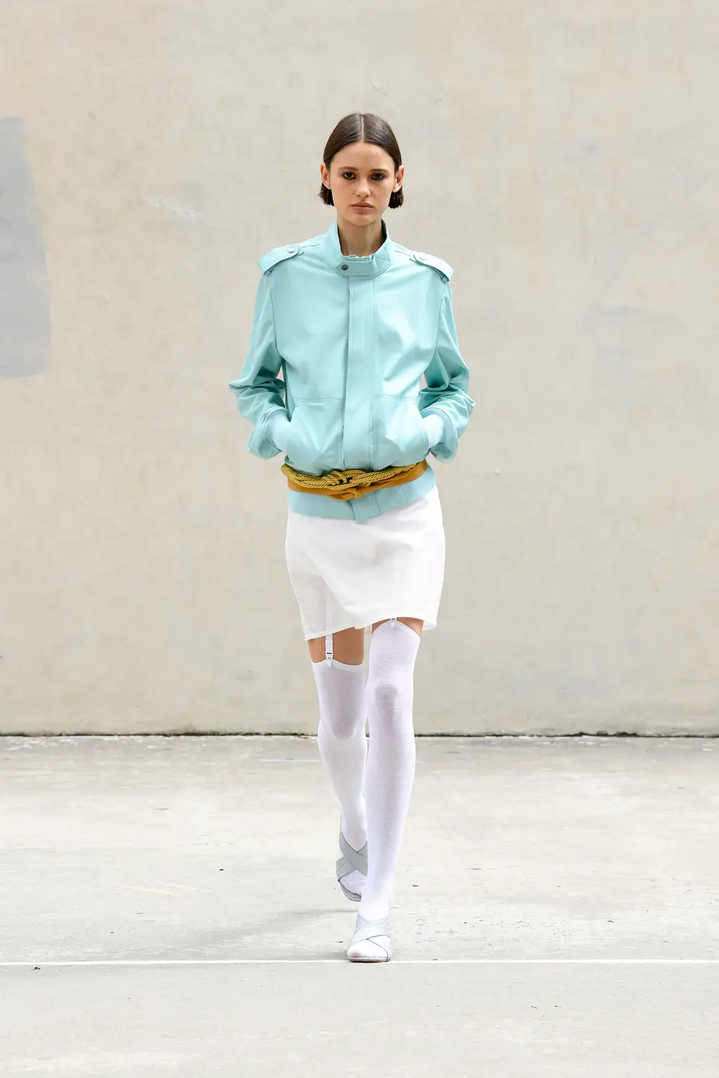 She’s irreverent in her approach, making ordinary things like paper bags intriguing. And while existing in a world of well-read arty types, her instinctual, respectfully odd garment pairings transcend exclusivity – rather, they warmly embrace all. This season, MNZ’s cool blue, stone grey and earthy palette mirrored that of her recent European and Middle Eastern trips, which she documented over the summer in lo-fi snaps of sunsets, city landscapes and cobalt seas. And it’s a collection that feels as calming as taking a few weeks off, but with MNZ’s curious eye, rocky mountainscapes become delicate, sheer tops creasing over the chest, or an amber leather bomber thrown over a whispy, knee-length duster, and waves – which she references in her show notes – are blue tank tops, a turquoise leather jacket and ghostly sheer dress.