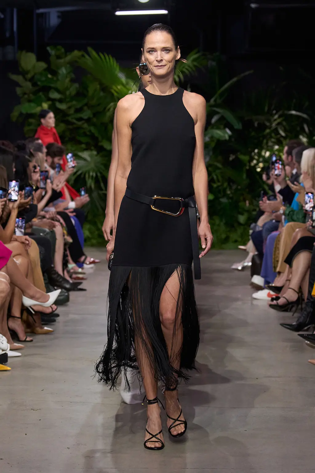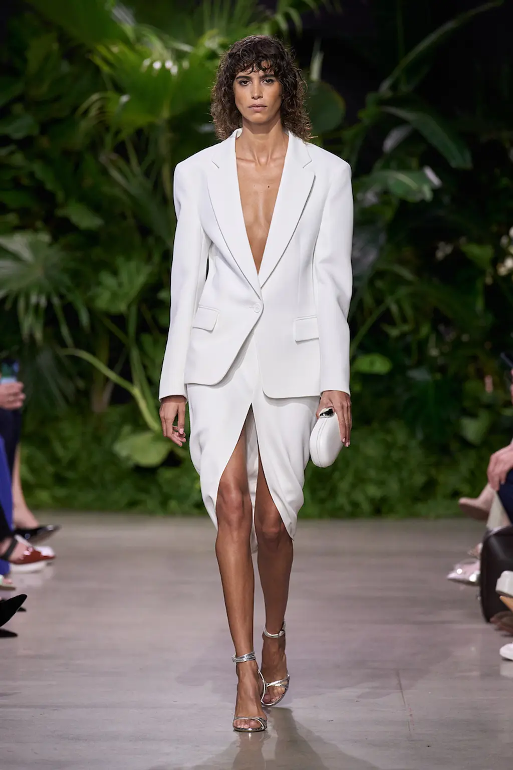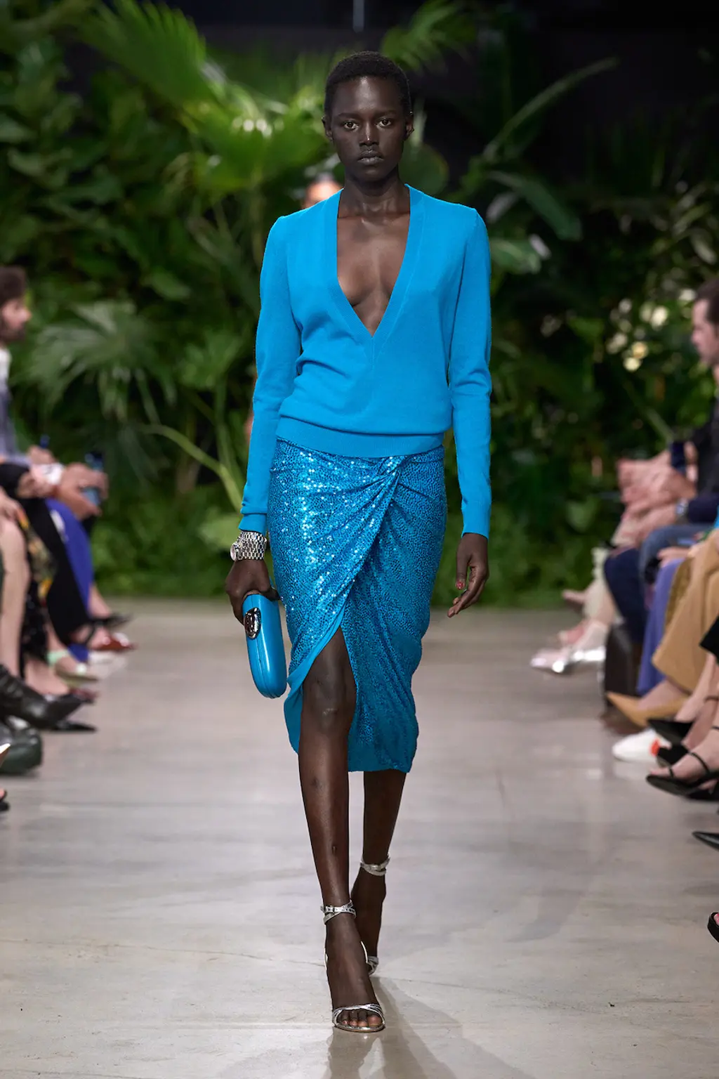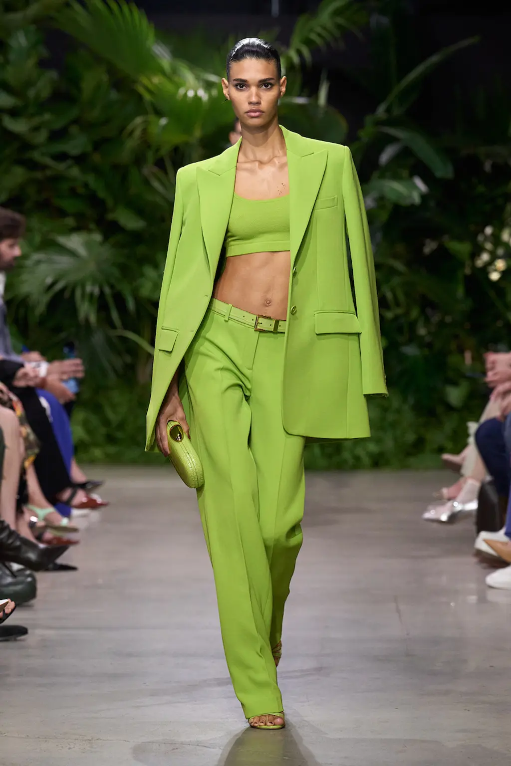 Manhattan was transformed into an “urban resort” for the Michael Kors SS23 show. Taking place in a mirrored room – which had the amusing effect of making dozens of fashion editors crane their necks to figure out which models were real and which were reflections – the space was decked out with palm trees as a live band performed covers of lounge‑y classics such as Abba’s Fernando, Madonna’s La Isla Bonita and The Doors’ Light My Fire. The choice of music – which also included Boléro – was smart: these were “latin”-influenced songs, each written or made famous by non-latin artists. The effect was pure juxtaposition – something that continued into the runway looks where a kind of “laid-back glamour” as Kors put it, “a lot of elements that you normally find on holiday”, contrasted with the sleek, urban show space. From there, models continued out onto the “ultimate runway”: the street outside. The perfect wardrobe for your next destination holiday.