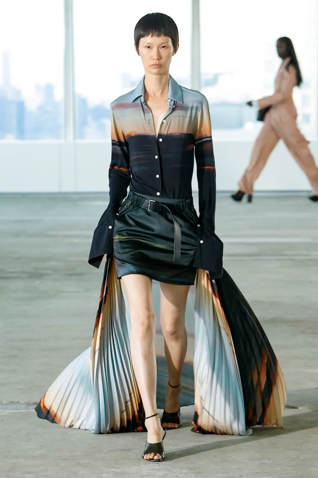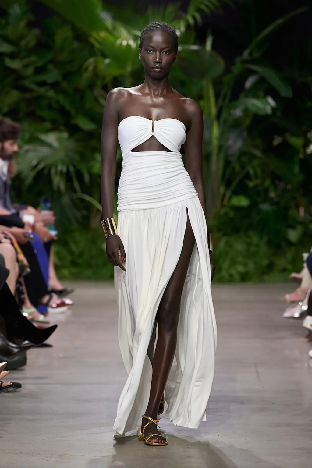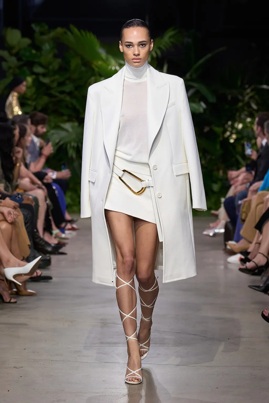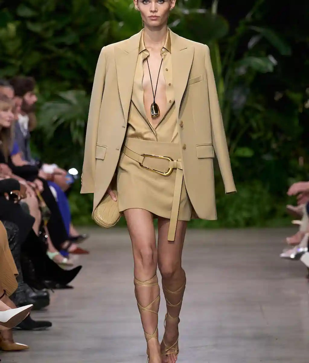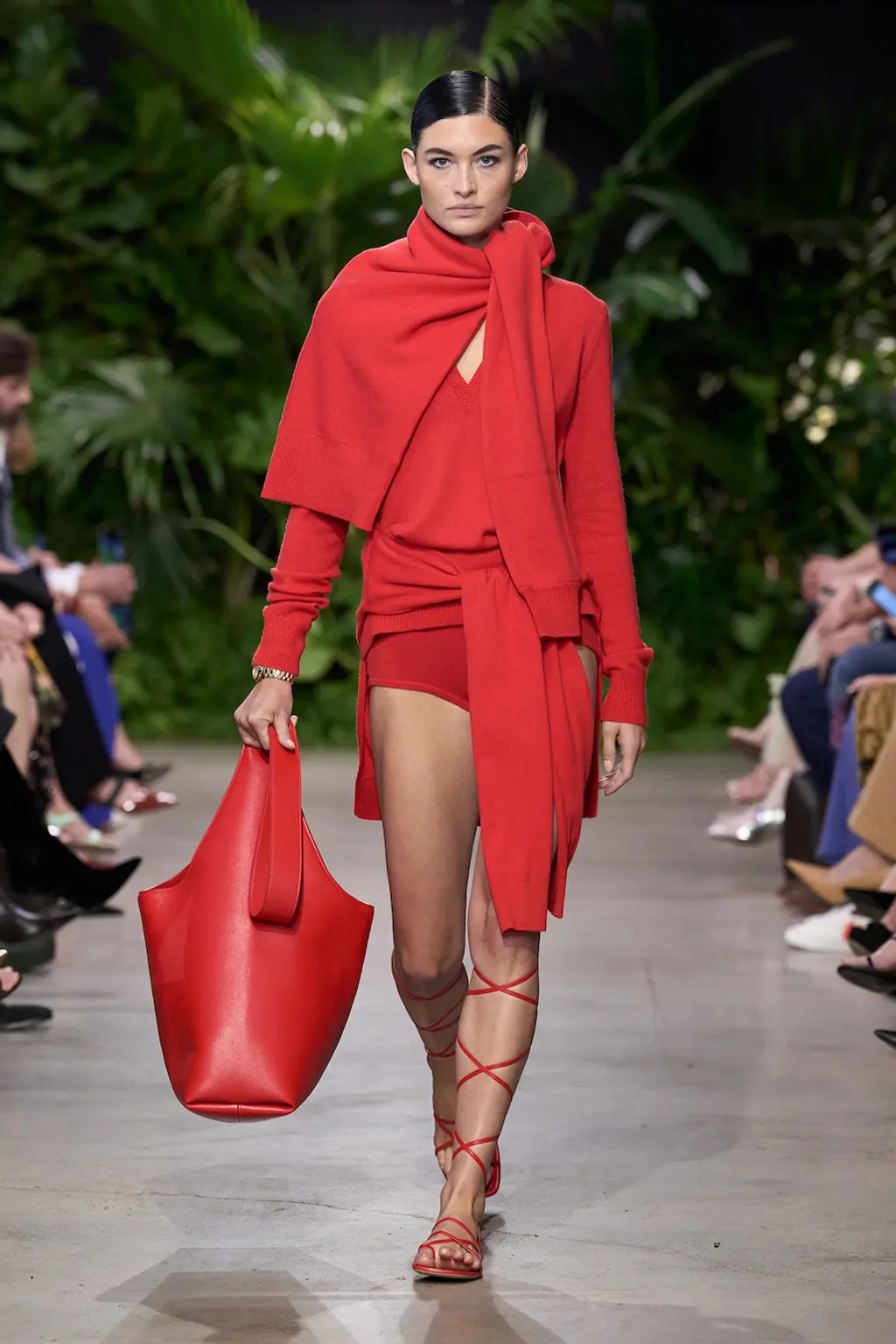 Manhattan was transformed into an “urban resort” for the Michael Kors SS23 show. Taking place in a mirrored room – which had the amusing effect of making dozens of fashion editors crane their necks to figure out which models were real and which were reflections – the space was decked out with palm trees as a live band performed covers of lounge‑y classics such as Abba’s Fernando, Madonna’s La Isla Bonita and The Doors’ Light My Fire. The choice of music – which also included Boléro – was smart: these were “latin”-influenced songs, each written or made famous by non-latin artists. The effect was pure juxtaposition – something that continued into the runway looks where a kind of “laid-back glamour” as Kors put it, “a lot of elements that you normally find on holiday”, contrasted with the sleek, urban show space. From there, models continued out onto the “ultimate runway”: the street outside. The perfect wardrobe for your next destination holiday.