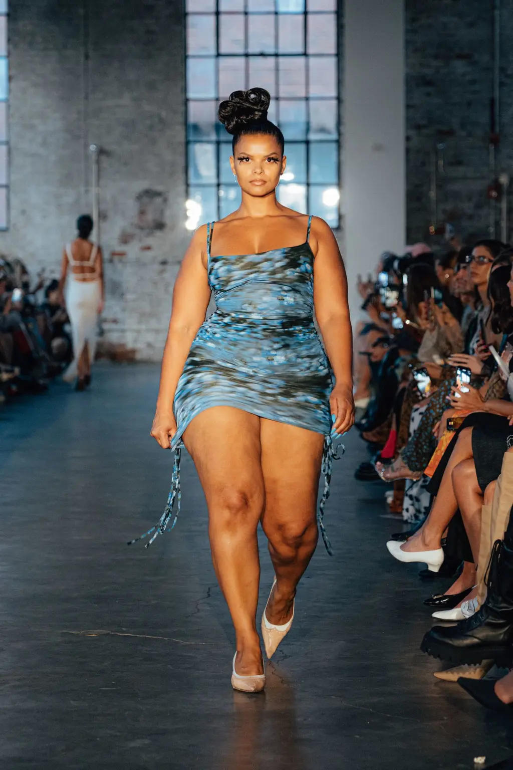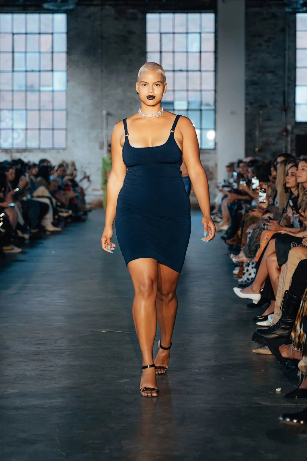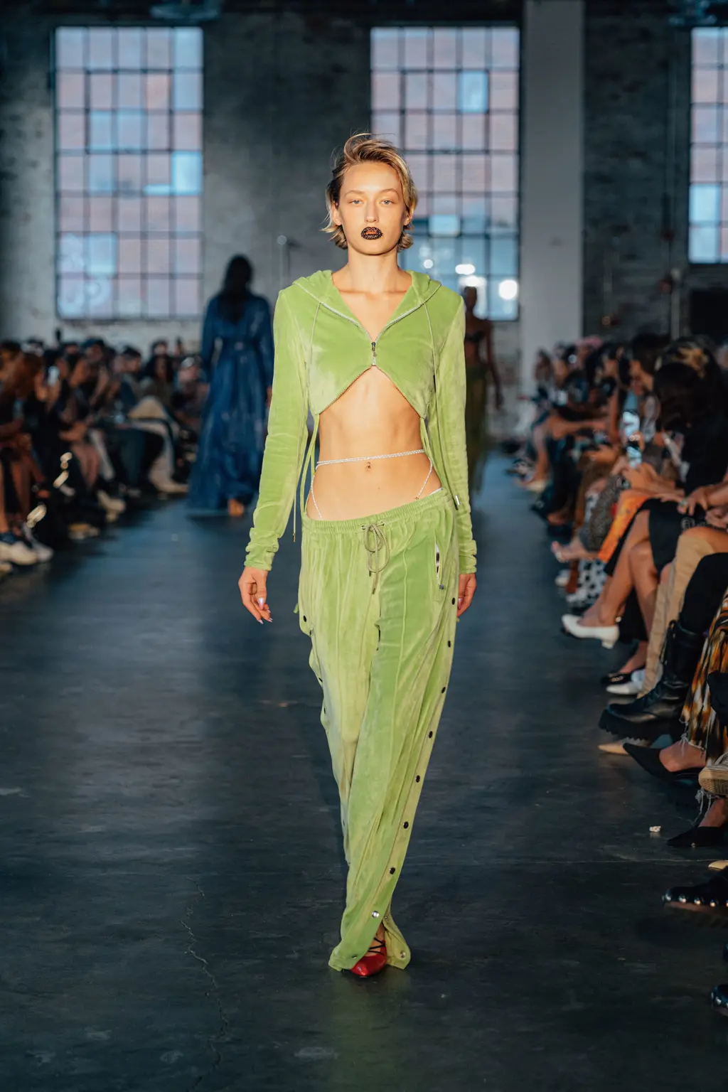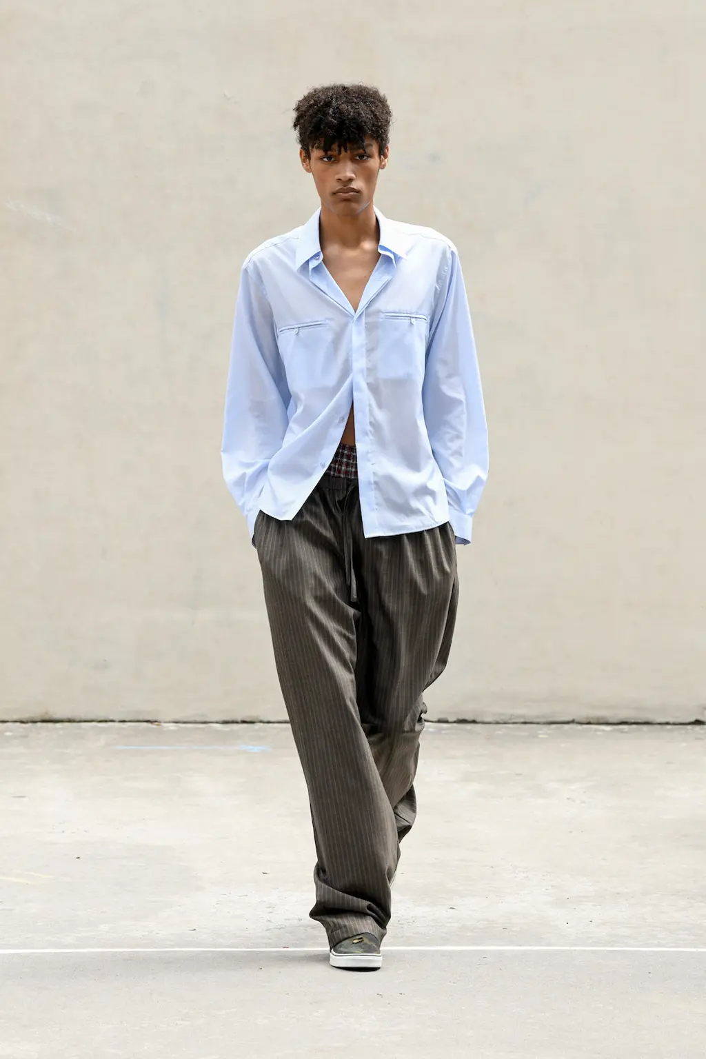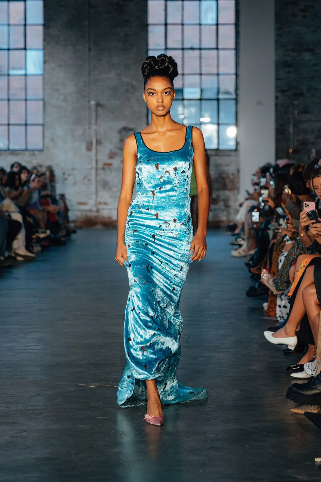 Here, that coming together started with guests entering via the backstage hair and makeup area and continued outside where staff brushed away rain water from the runway, wiped down seats and handed out umbrellas to mega celebs including Kate Moss, Kris Jenner, Kourtney Kardashian and Travis Barker (names you could easily imagine a Warhol diptych dedicated to). However unintended the downpour may have been, the effect was to, almost literally, wash away the facade of a fashion show – revealing the intimate makings of it in the process.