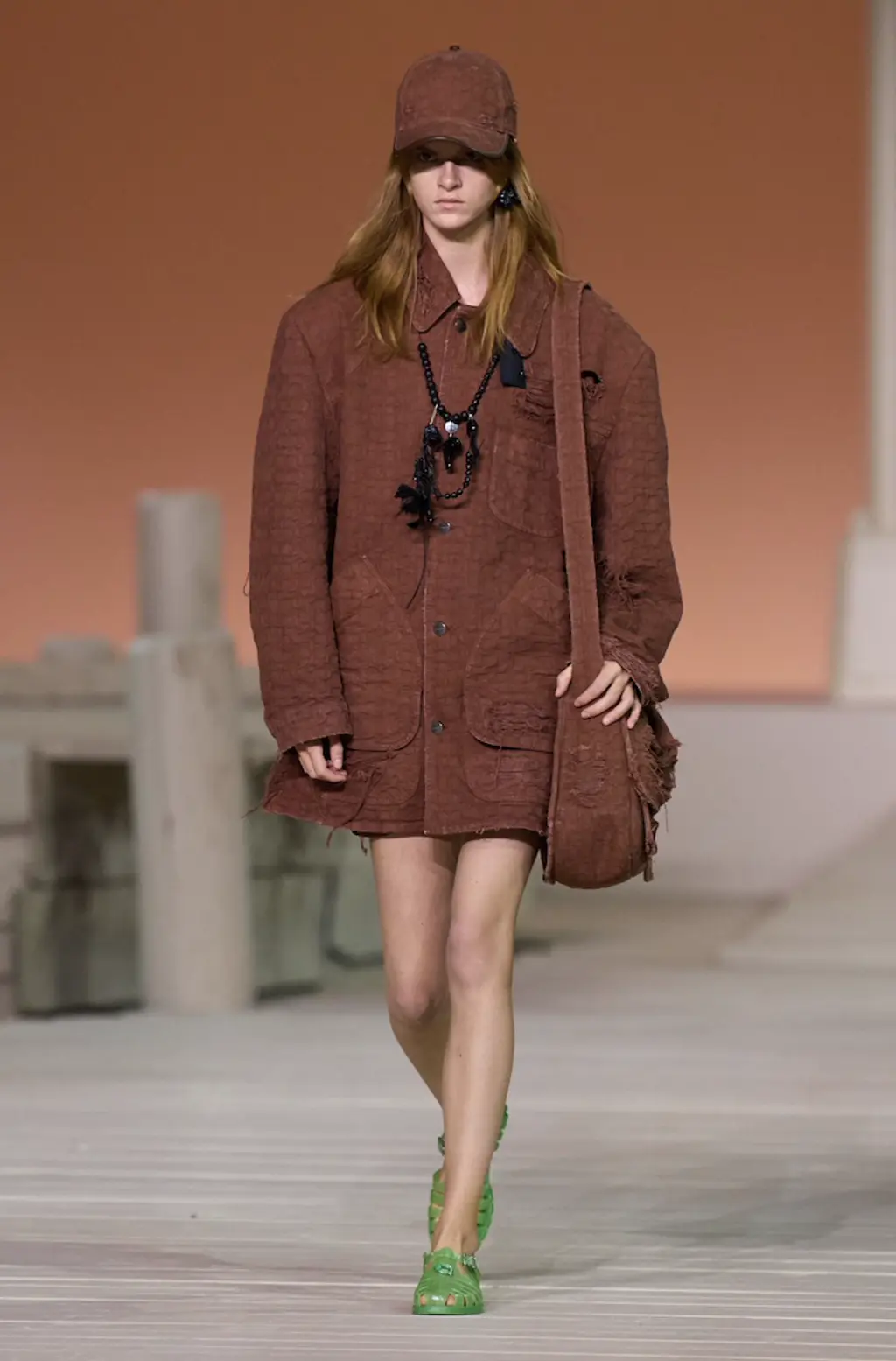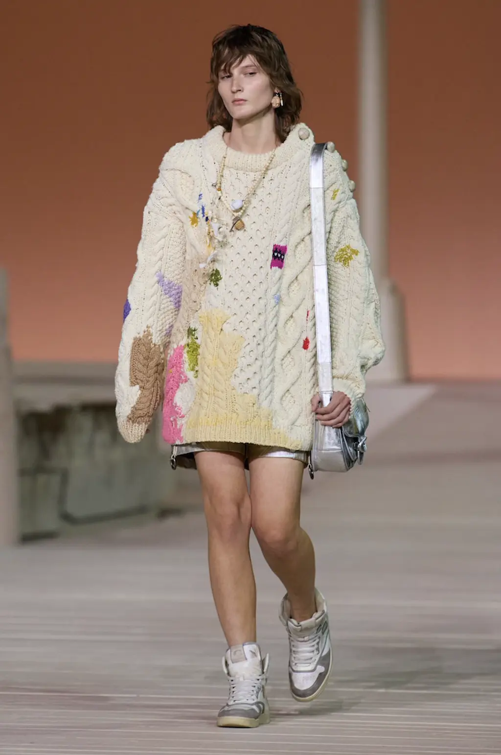 Those new possibilities extended to the clothes, too, where denim was “distressed”, fisherman’s jumpers “love-worn” and varsity sweaters “overdyed”. The effect was pieces that were stretched and changed beyond all limitations. In the case of several bags – made from repurposed jackets and football leather – they were retooled into new pieces all together.