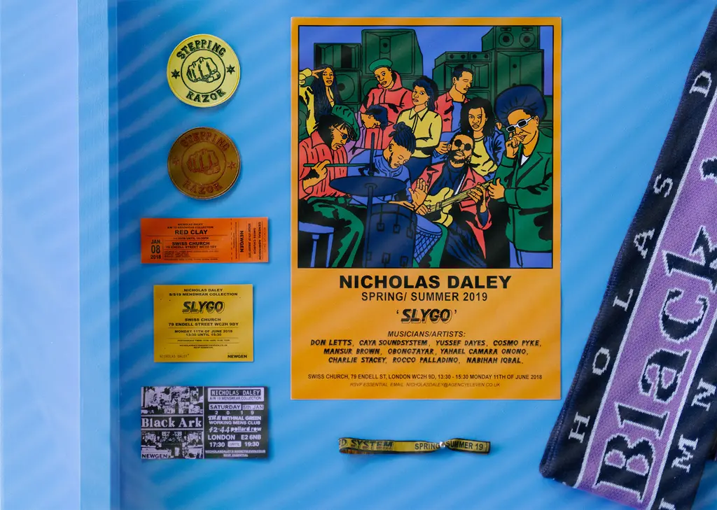 We have my dad’s military shirt which he used to wear in the Reggae Klub with all the badges he collected, the knitted scarf that one of the knitters made in red, green and gold, and lots of rootsy stuff from my mum’s and my dad’s side. Hopefully, people will be like, ‘Oh, that’s the reason why there is always music at Nicholas’ shows’ or, ‘That’s why he reproduced the original Reggae Klub T‑shirt.’ We have the original one that my dad made 30 years ago, so people can see the real deal.