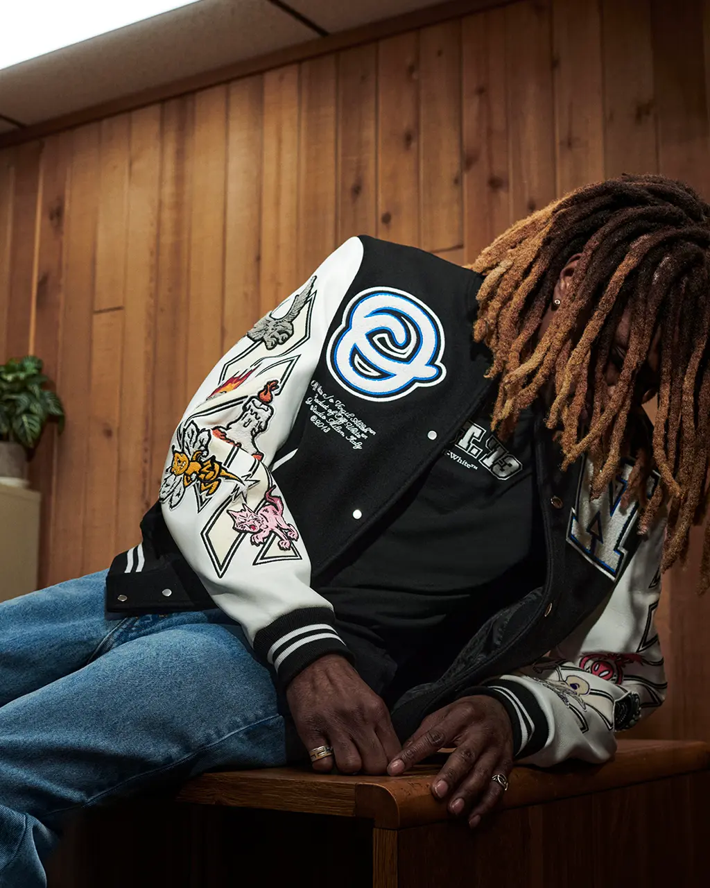 The capsule sees a range of black and white tees and hoodies emblazoned with logos, emblems and spell-out slogans, all encapsulating the brand’s signature aesthetic. Best is the varsity jacket, covered front, back and sleeves with the hyperactive creativity of an art school student doodling after a triple espresso.